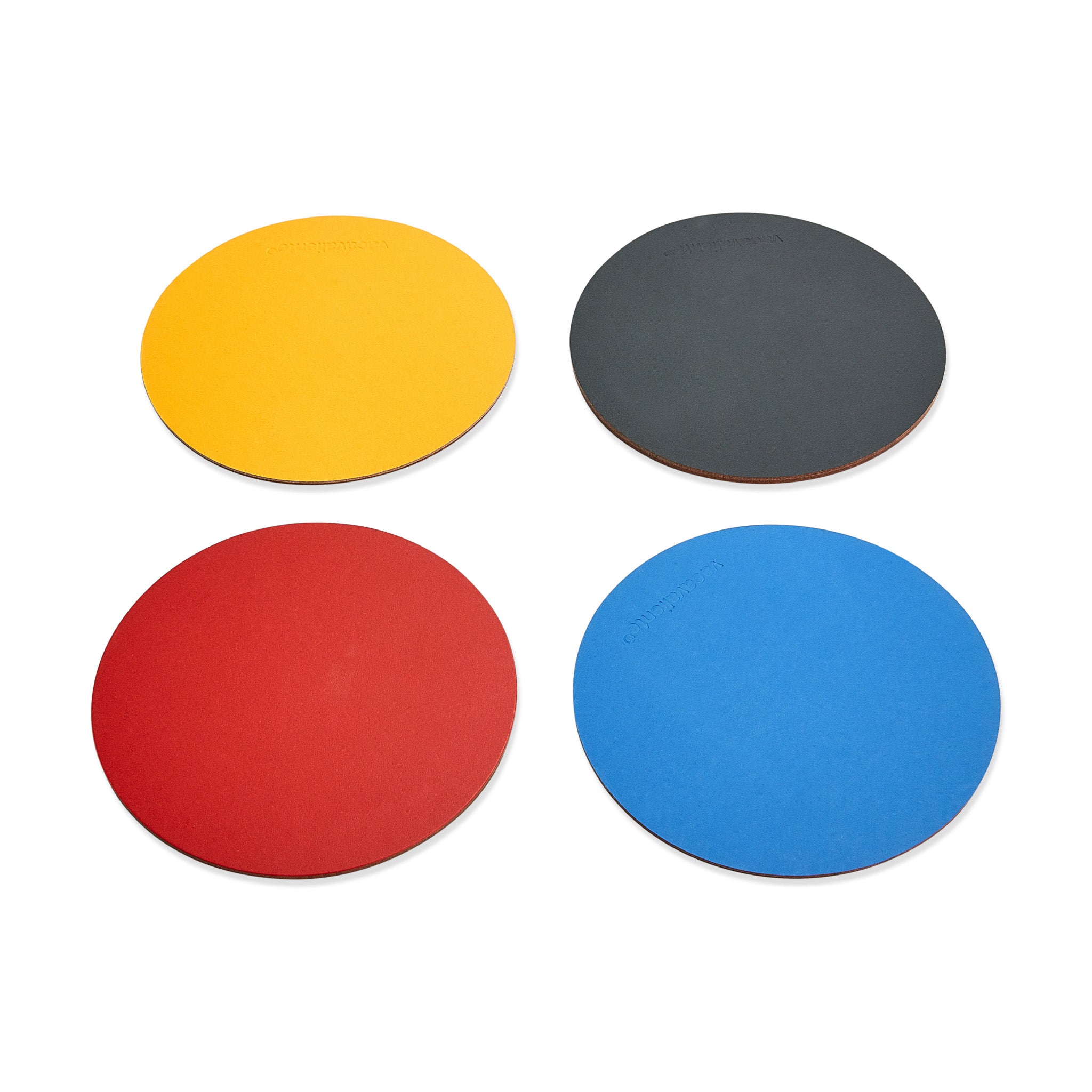 MoMA Exclusive: Protect your furniture during cocktail parties and coffee breaks with these eco-friendly designs. These reversible. Recycled Leather Coaster give a second life to off-cuts discarded by the leather industry. The reclaimed pieces are cleaned. compacted and bonded into an eco-friendly material. Each side of the Coasters has a contrasting color to give you twice the tabletop options. Coasters come in a mixed set of four (one of each color) in your choice of round (4.25diam.) or square (4 square).