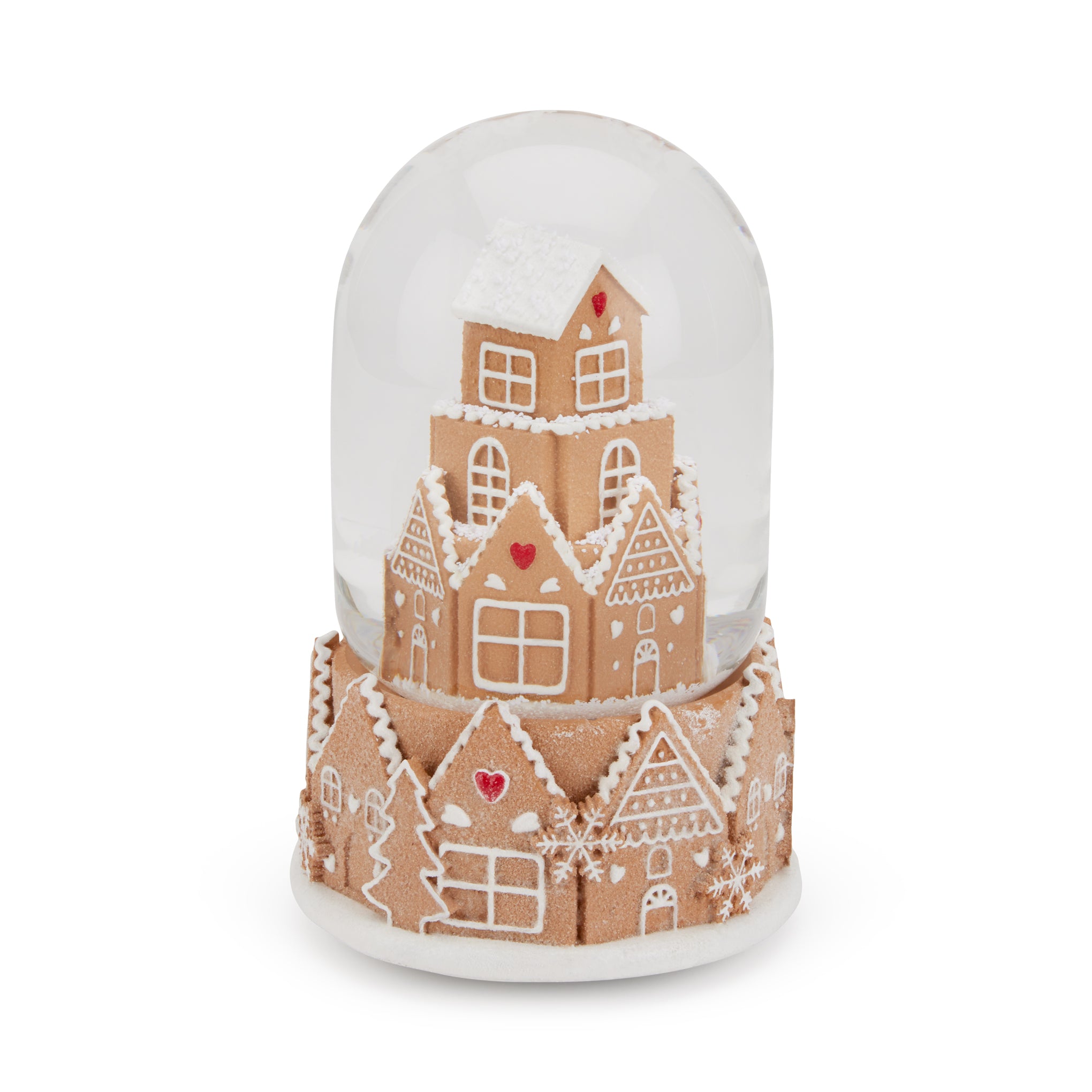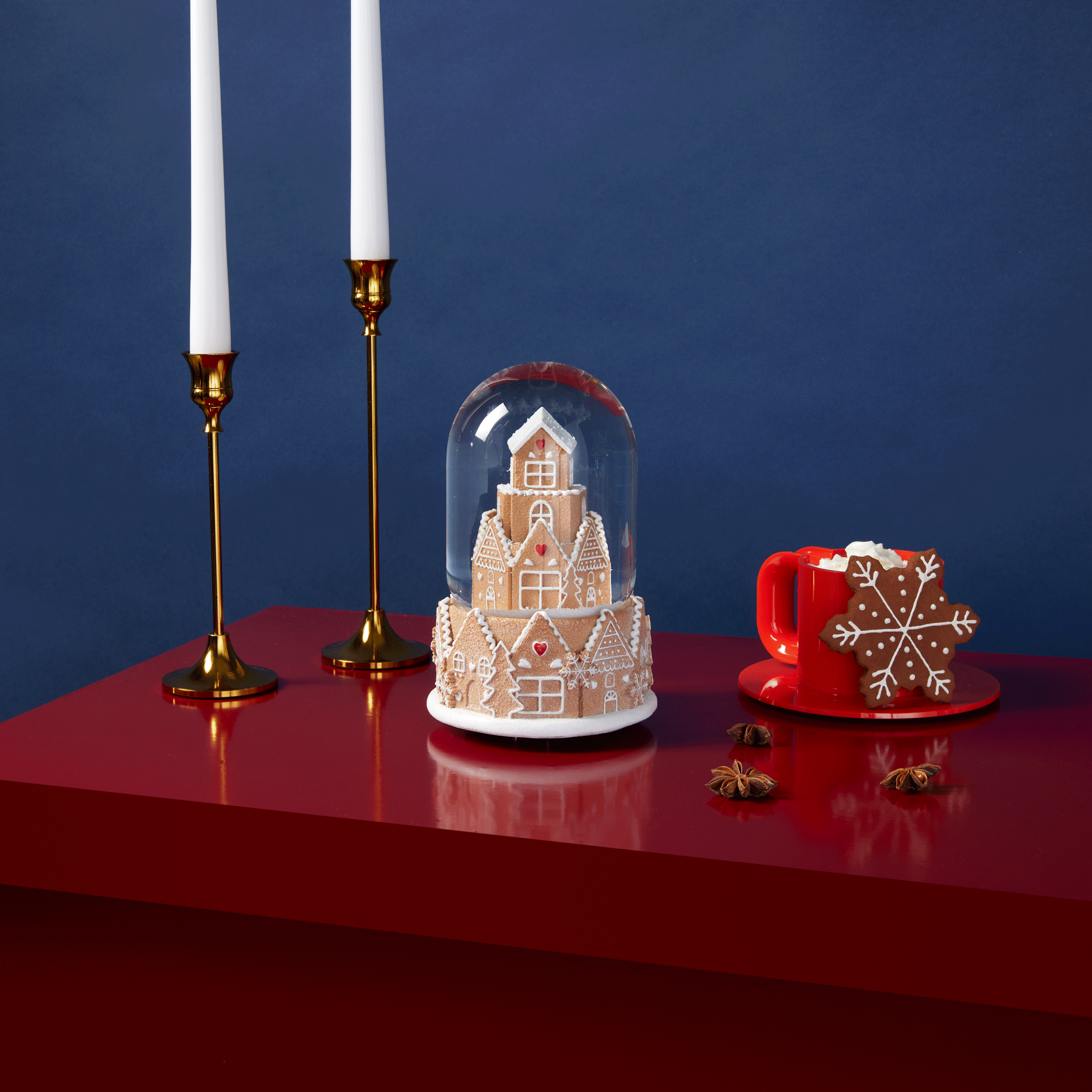 Inside his ovoid glass snow globe lives a towering gingerbread mansion—a unique addition to your holiday decor. The base of the snow globe is lined with a gingerbread village. When shaken. the Large Gingerbread Snow Globe creates a classic snowstorm. This magical snow globe is also a music box that plays We Wish You a Merry Christmas when wound up.