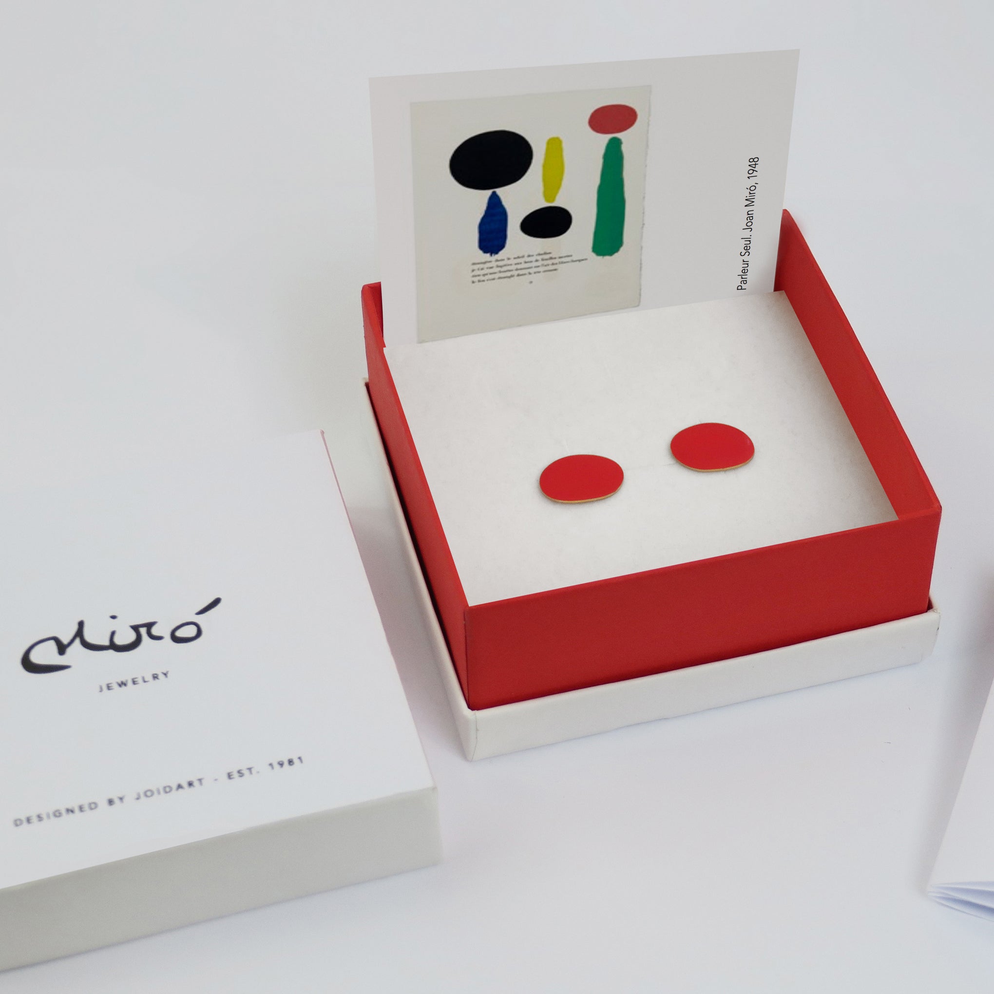 Elevate your everyday with these Joan Miró Gold-Plated Dot Post Earrings by Joidart. a family-owned jewelry brand celebrating their 40th anniversary. To help mark the occasion. they collaborated with Successió Miró on an exclusive collection that pays tribute to the famed Spanish artist. This pair references the 1948 painting Parler seul and features irregular circle shapes made of 24k gold-plated matte metal and red enamel. Wear them to add a subtle hint of color to any look. Each piece is conscientiously and locally made at a small factory in a mountain village using traditional artisanal techniques. The Joan Miró Gold-Plated Dot Post Earrings measure 0.59l x 0.47w. Miró’s work is represented in MoMA’s collection.
