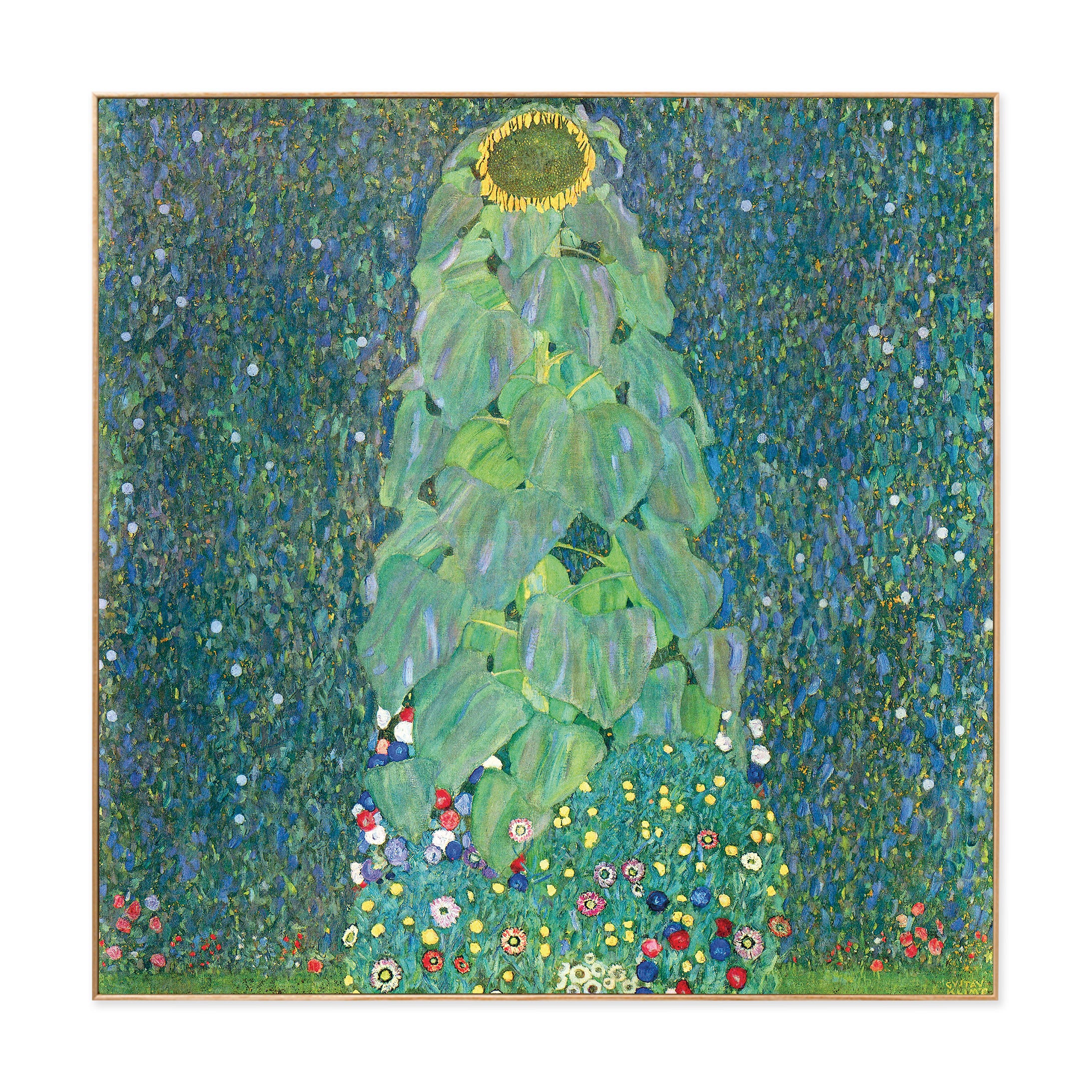 This print features a reproduction of The Sunflower (c. 1906–07) by Gustav Klimt. an artist whose work is featured in MoMA’s collection. It’s mounted and laminated for protection from dust and UV rays. and floated in a hand-stained. natural. 2-deep frame made from ash wood grown in sustainable forests. Hanging kit included.