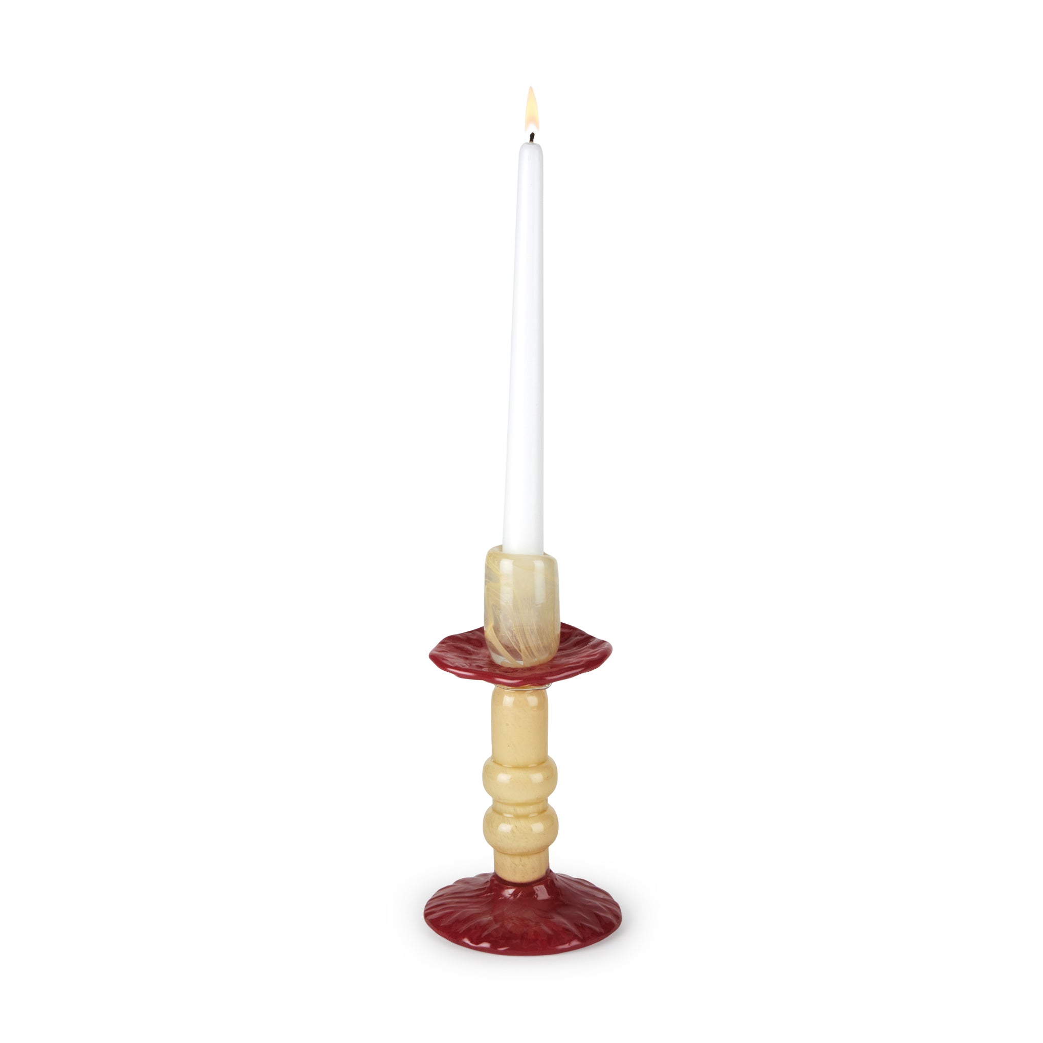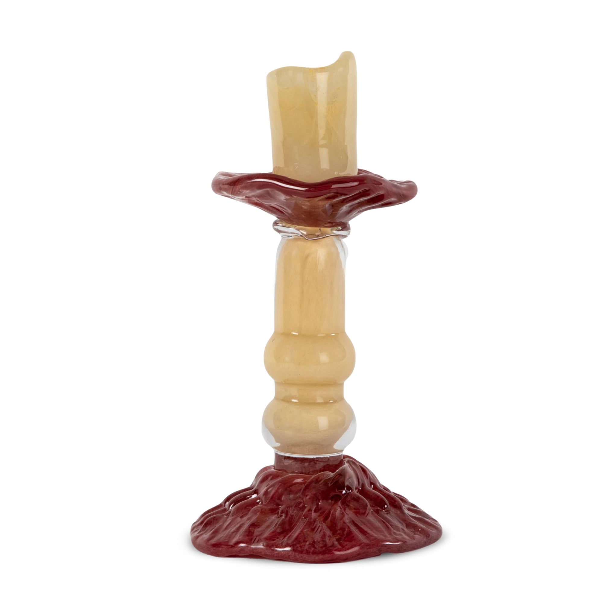 An eye-catching accent for your table or mantle. the Lara Candle Holder is inspired by baroque Italian pillars. Handmade from mouth-blown glass that’s reminiscent of vintage glass. the holder’s base and top resemble a flower. with a leaf-like detail that captures dripping wax. The colorblocked design brings a vibrant touch to your home. Candles not included. Because this product is handmade. color and shape may differ from holder to holder. making each a unique object.