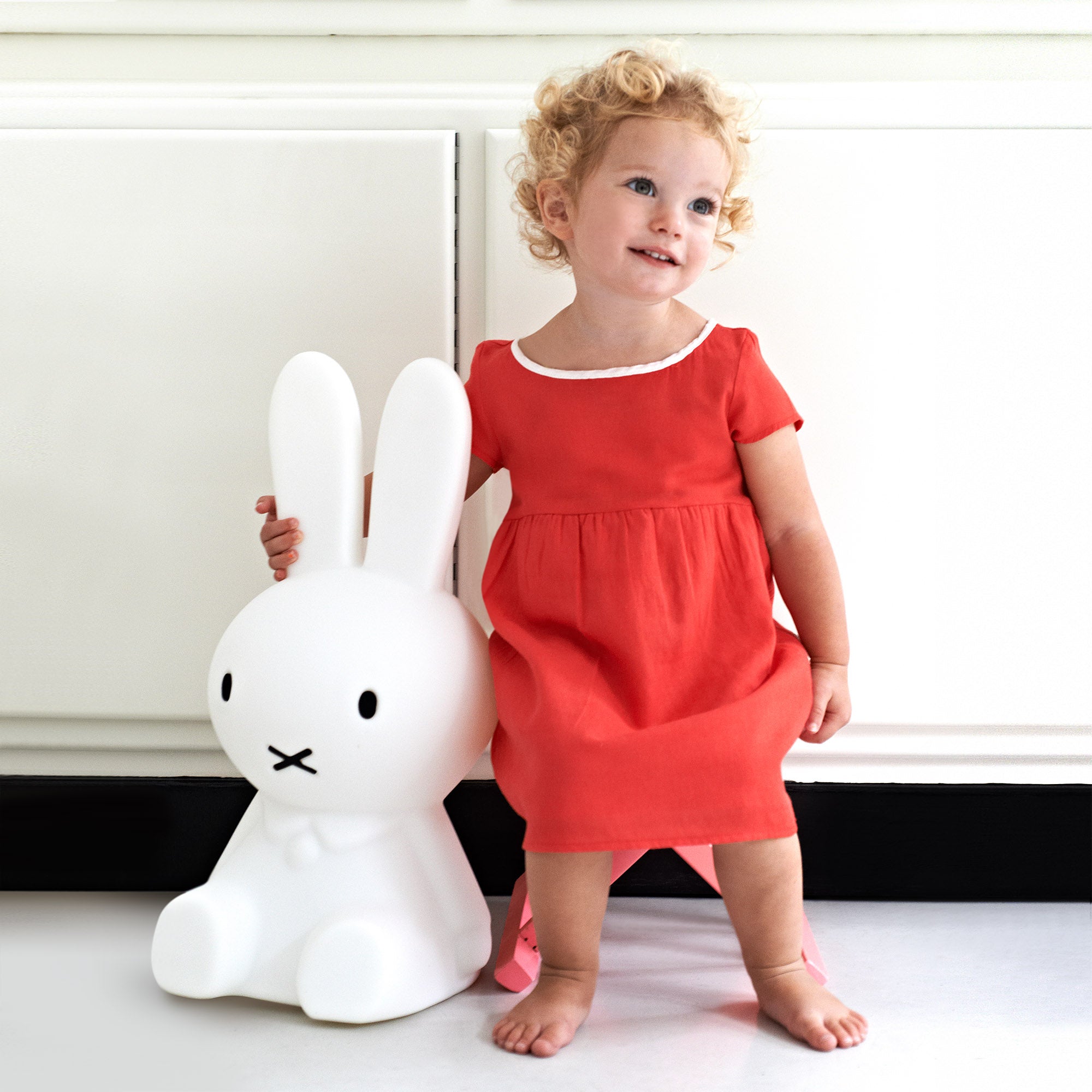 The Miffy Floor Lamp. based on Dick Bruna’s iconic Dutch storybook character. is a statement-making light that stands 20 tall. making it perfect for both your children’s nursery and as an art piece in your living room. Safe for children. this Miffy Lamp is made of heat-resistant polyethylene and has a dimmable LED light. The Miffy Floor Lamp includes a USA power plug and a cord that features a five-step dimmer switch.