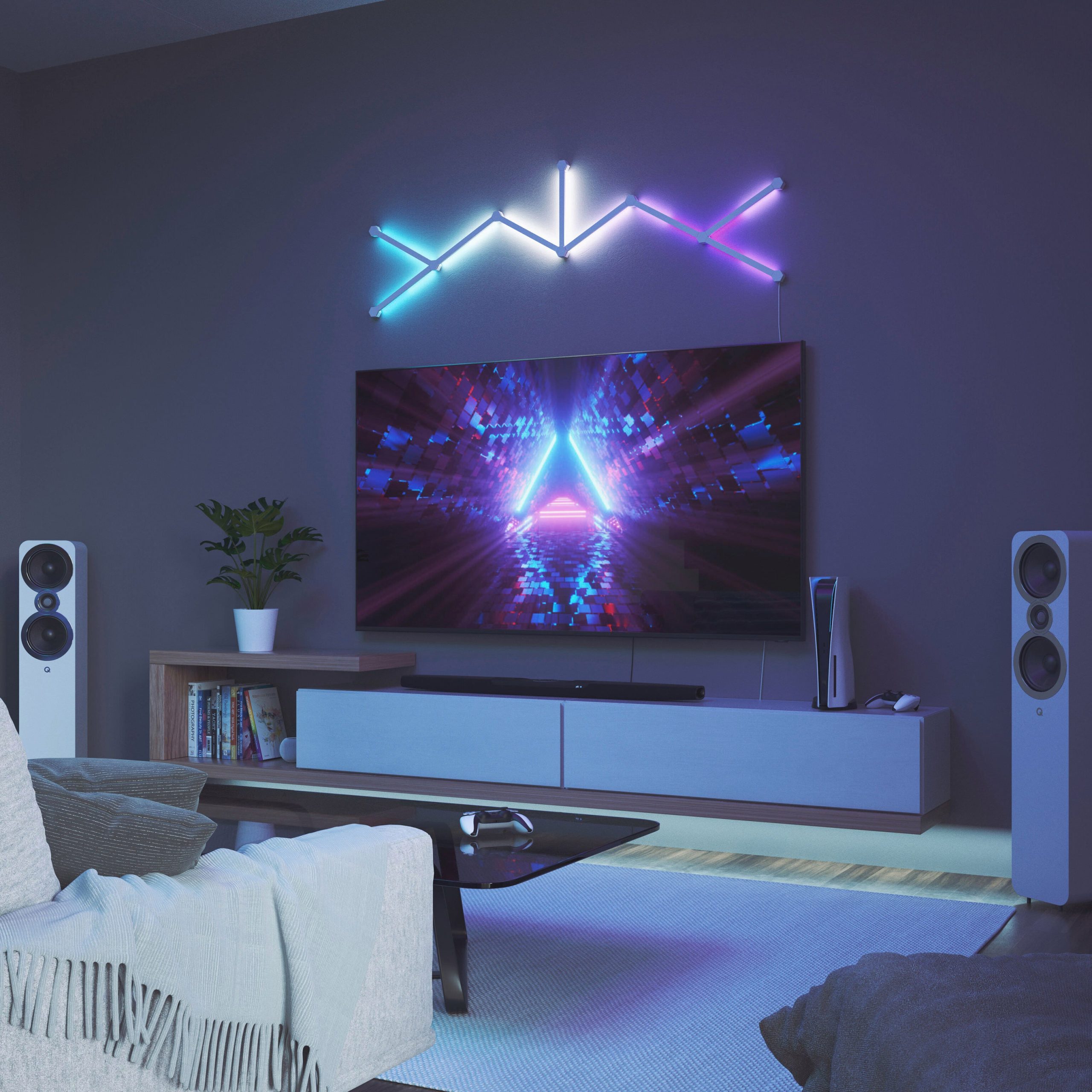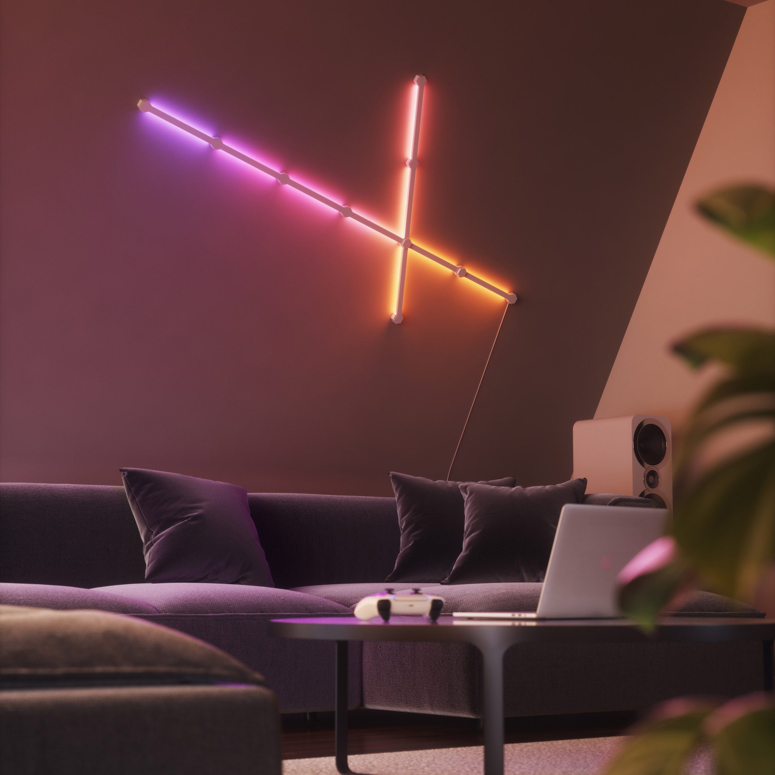 MoMA Exclusive: Create your own lighting masterpiece with the Nanoleaf Lines Smart Interactive Lighting Kit. The kit’s interactive bars—in an exclusive set of 12—respond to music. your voice. gaming screens and more. These modular backlit bars provide ambient light with 19 pre-loaded scenes in the Nanoleaf app. and also several other light modes such as reading. warm white and daylight. The bars are easily mounted on the wall. in a configuration you choose. with the included double-sided adhesive.