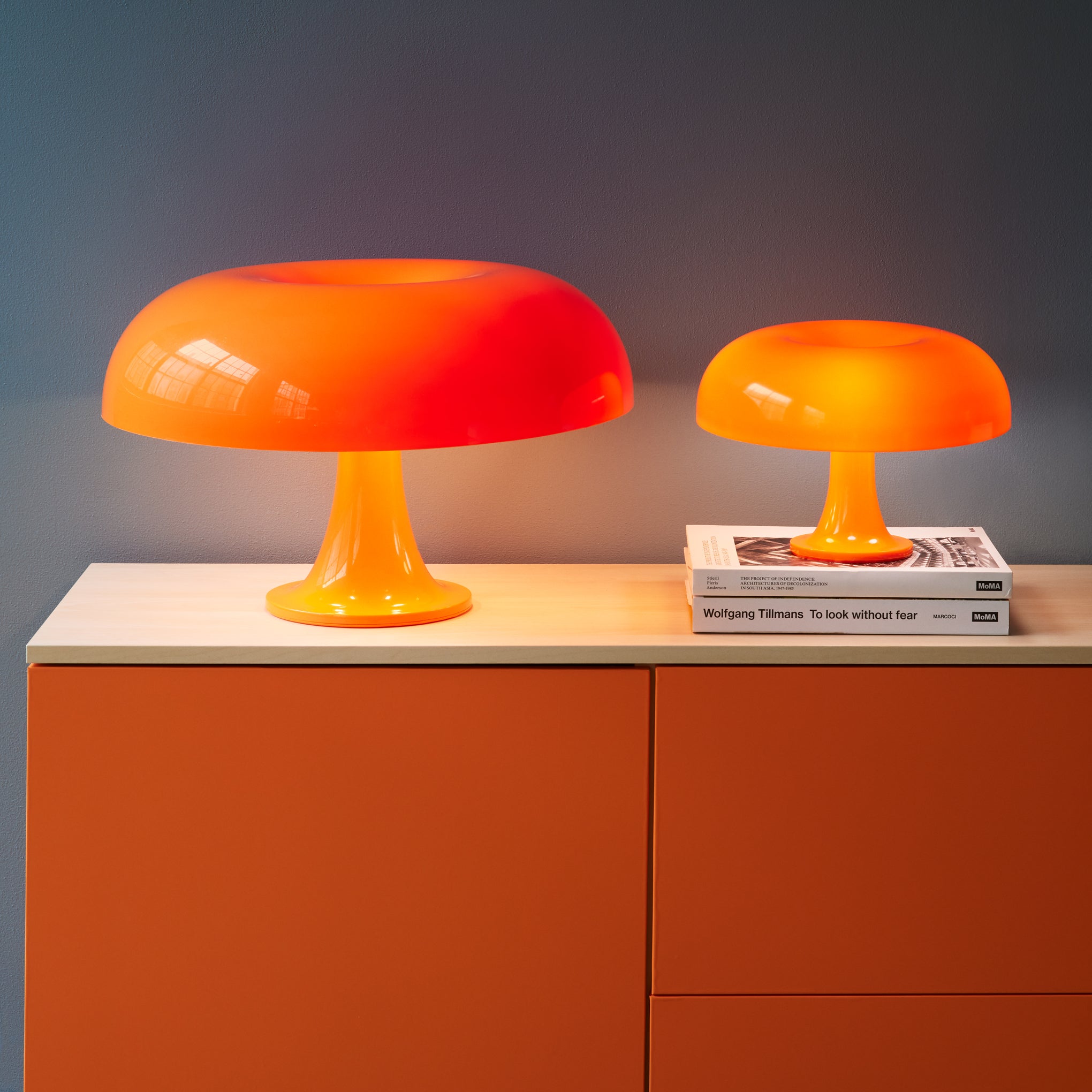 In 1965. Italian designer Giancarlo Mattioli. guided by the era’s enthusiasm for space-age forms and materials. experimented with then-newly-available thermoplastic resins. The result was this Nesso Table Lamp. an object represented in MoMA’s collection. Invoking an otherworldly mushroom. the Nesso Lamp’s eye-catching shape provides diffused incandescent light. Produced by Artemide. the Nesso Table Lamp has an on/off switch on its 48l cord and requires four 25W candelabra base incandescent bulbs (not included). The Nesso measures 13.5h x 21.25diam.. with a 8.25d base.