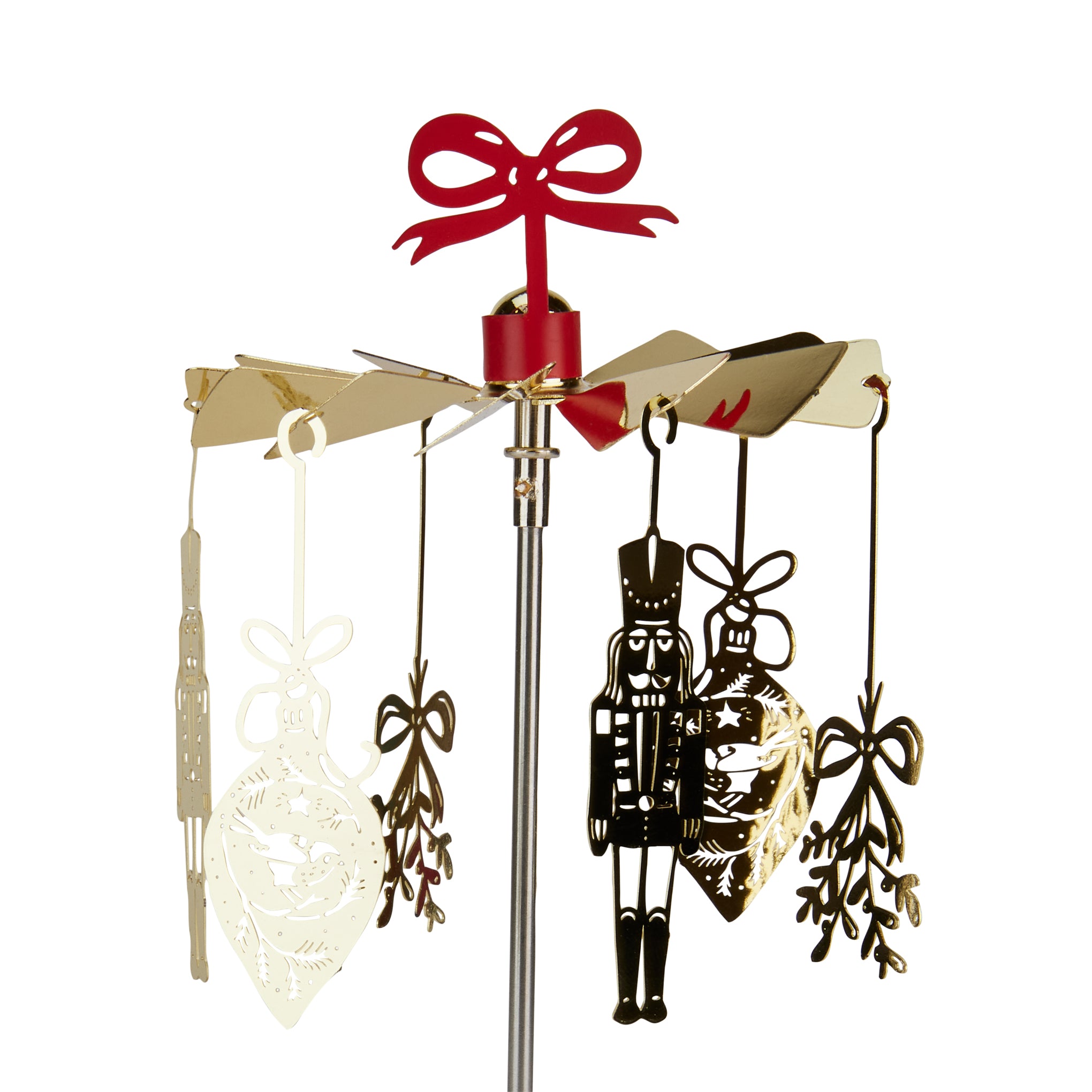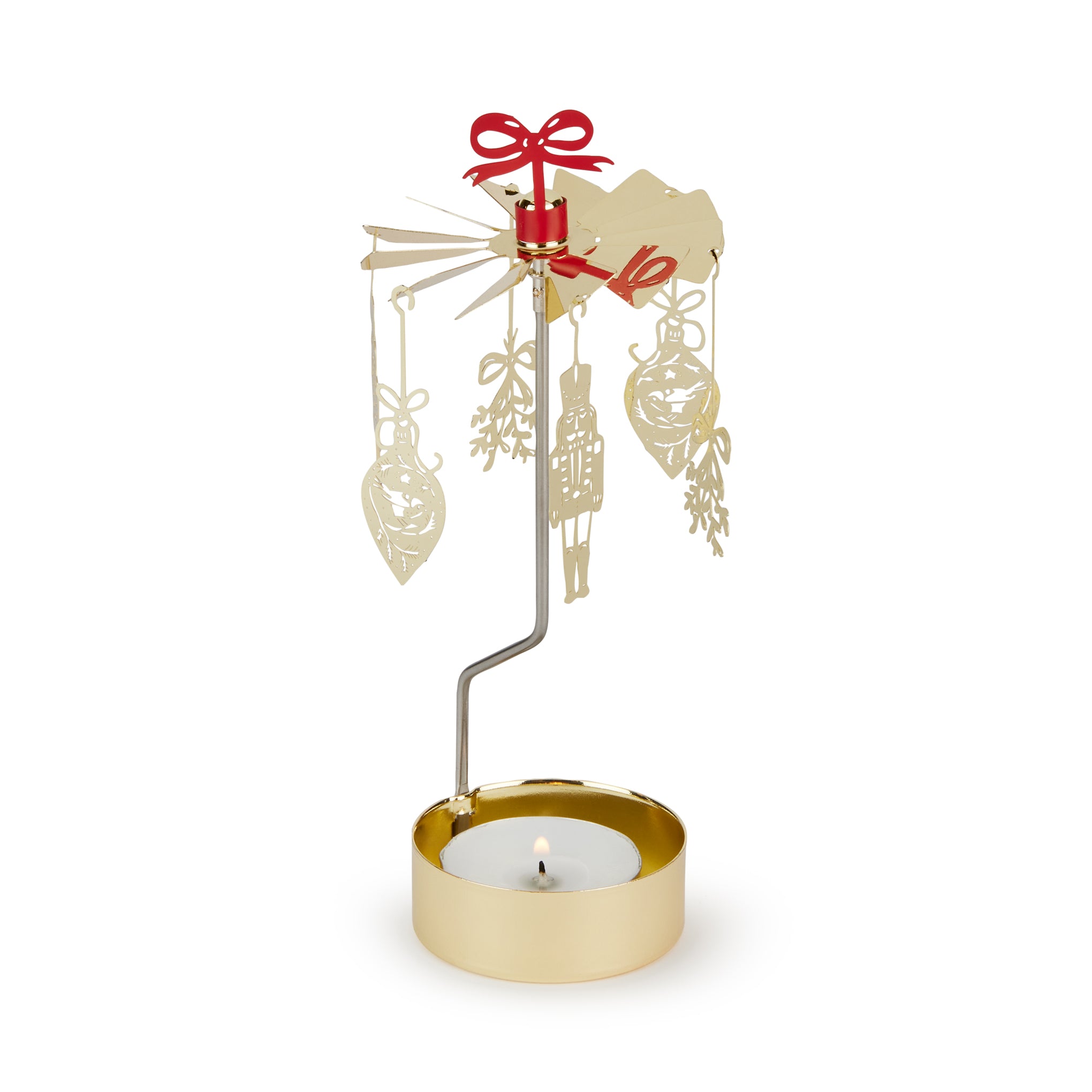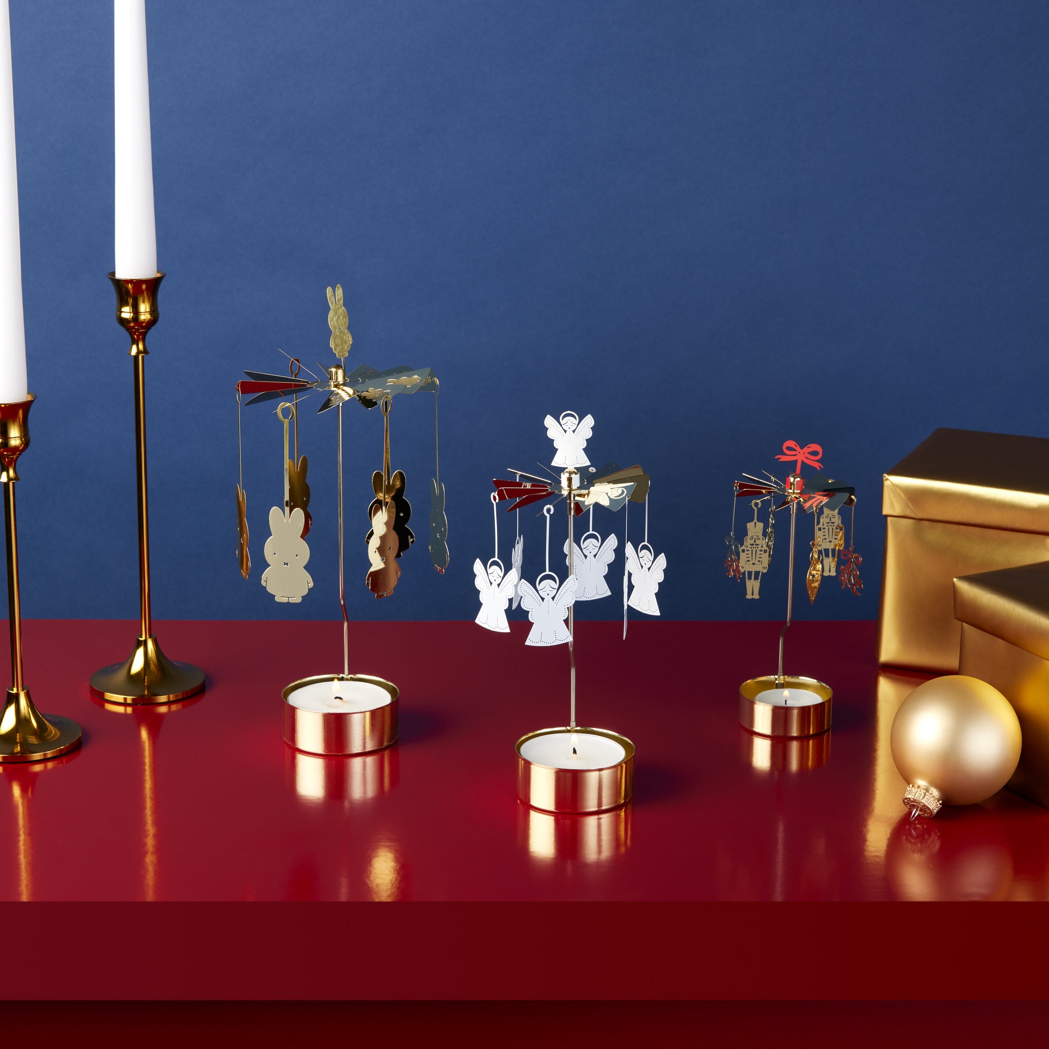 This enchanting No?l Rotary Tea Light Candle Holder features a tree-inspired mobile that rotates when a lit votive candle is placed in the stand’s holder. The tree is adorned with various Christmas-themed motifs. Candles not included. The No?l Angel Rotary Tea Light Candle Holder is made in Sweden from plated iron and measures 8h.