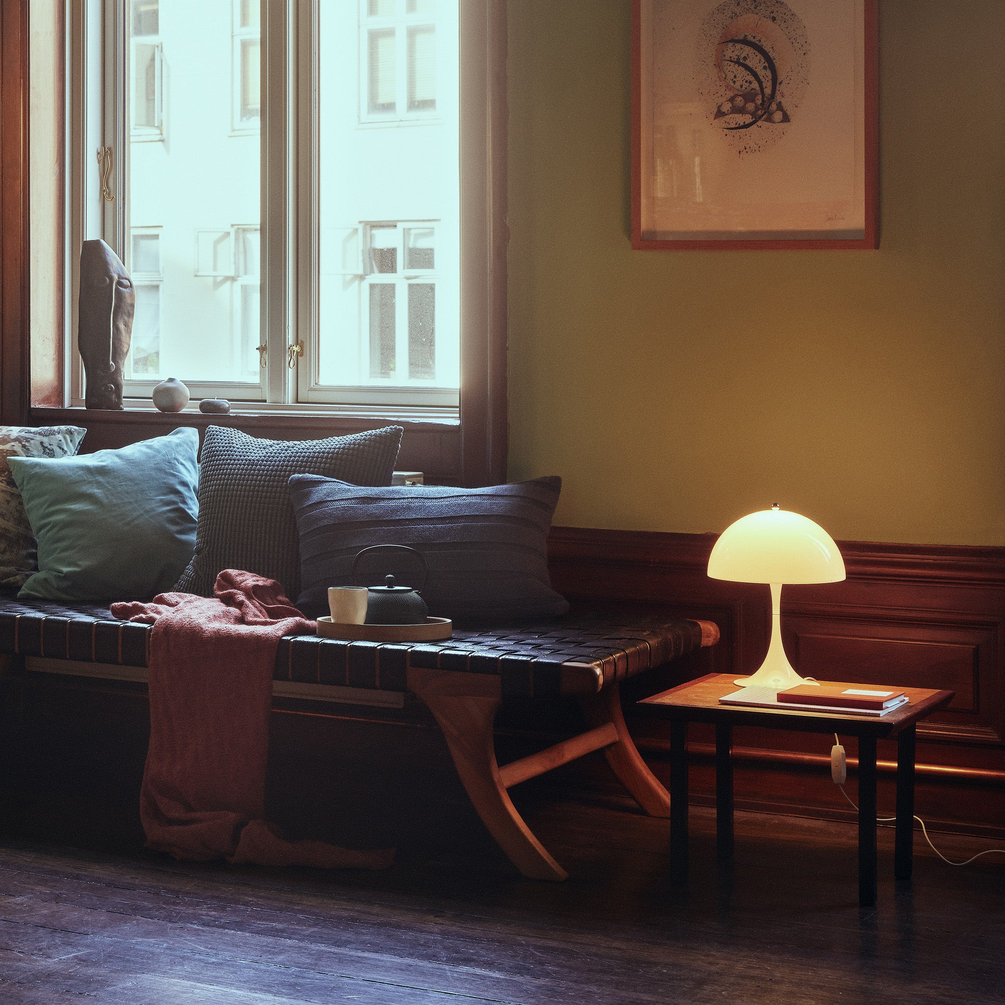 The lamp’s 13.2 height allows the sculptural shape to fit smaller spaces. such as bookshelves. window sills. desks. bedside table and other smaller surfaces. Manufactured by Louis Poulsen.