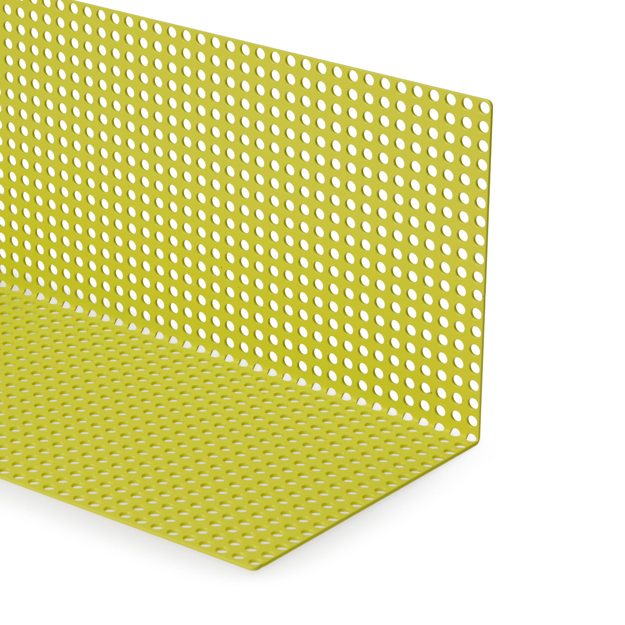 MoMA Exclusive: Shelves are traditionally a reliable storage solution. but who says they also can’t make a bold home decor statement? Designed in eye-popping neon colors. these perforated aluminum shelves (each sold separately) can be mounted anywhere you need storage space. from holding dry goods in your kitchen. to displaying books. vases and objets in your living room. Mounting hardware included. The Perforated Aluminum Shelf measures 6h x 23.6w x 6d.