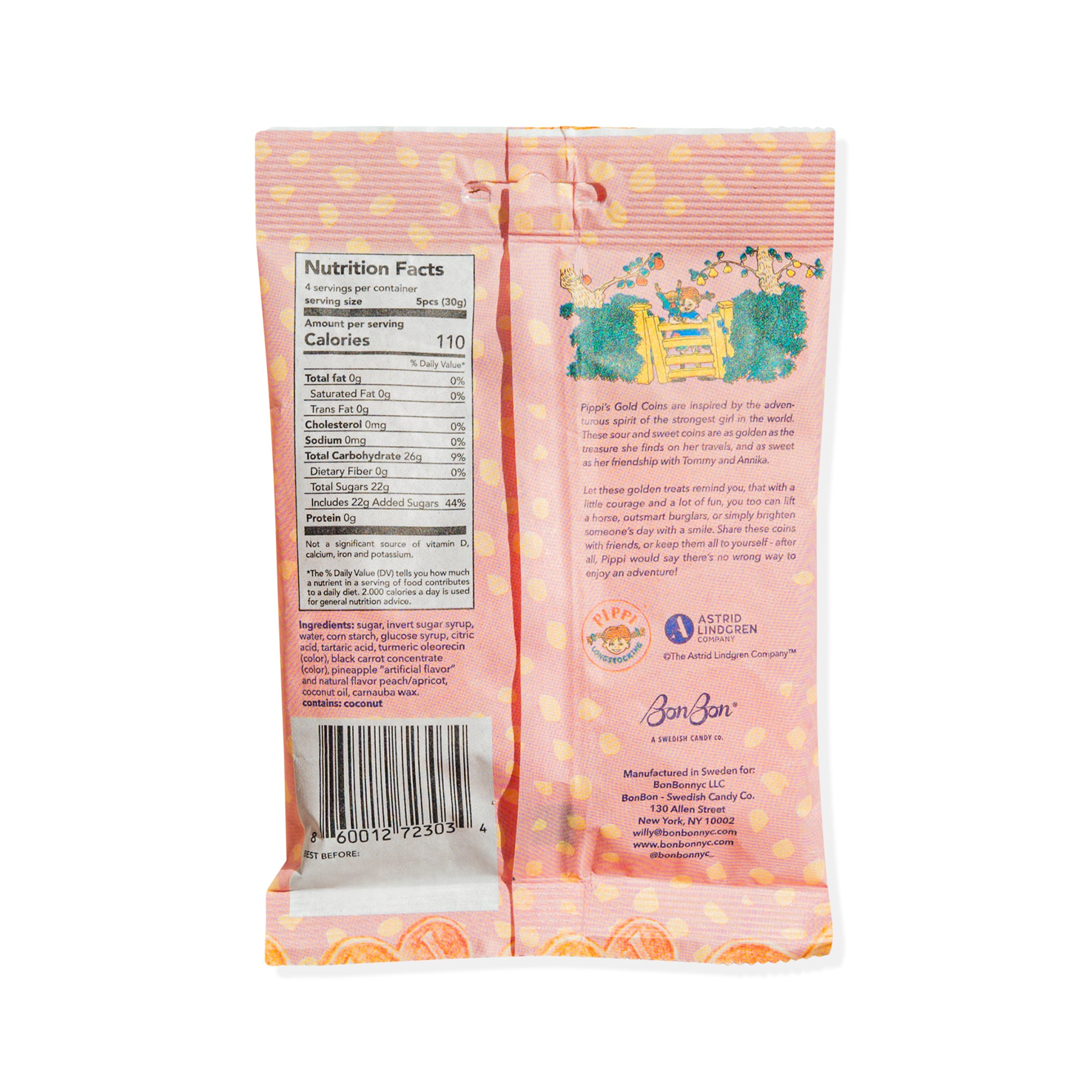 These gold-foiled wrapped candies are inspired by the Swedish storybook and film character Pippi Longstocking. These sweet and sour coins are as golden as the treasures Pippi finds on her travels. A wonderful stocking stuffer for kids and adults alike. Crafted in Sweden. these candies are pineapple flavored with a hint of apricot. Box measures 6.5h x 4.5w and contains 4.2oz of candy.