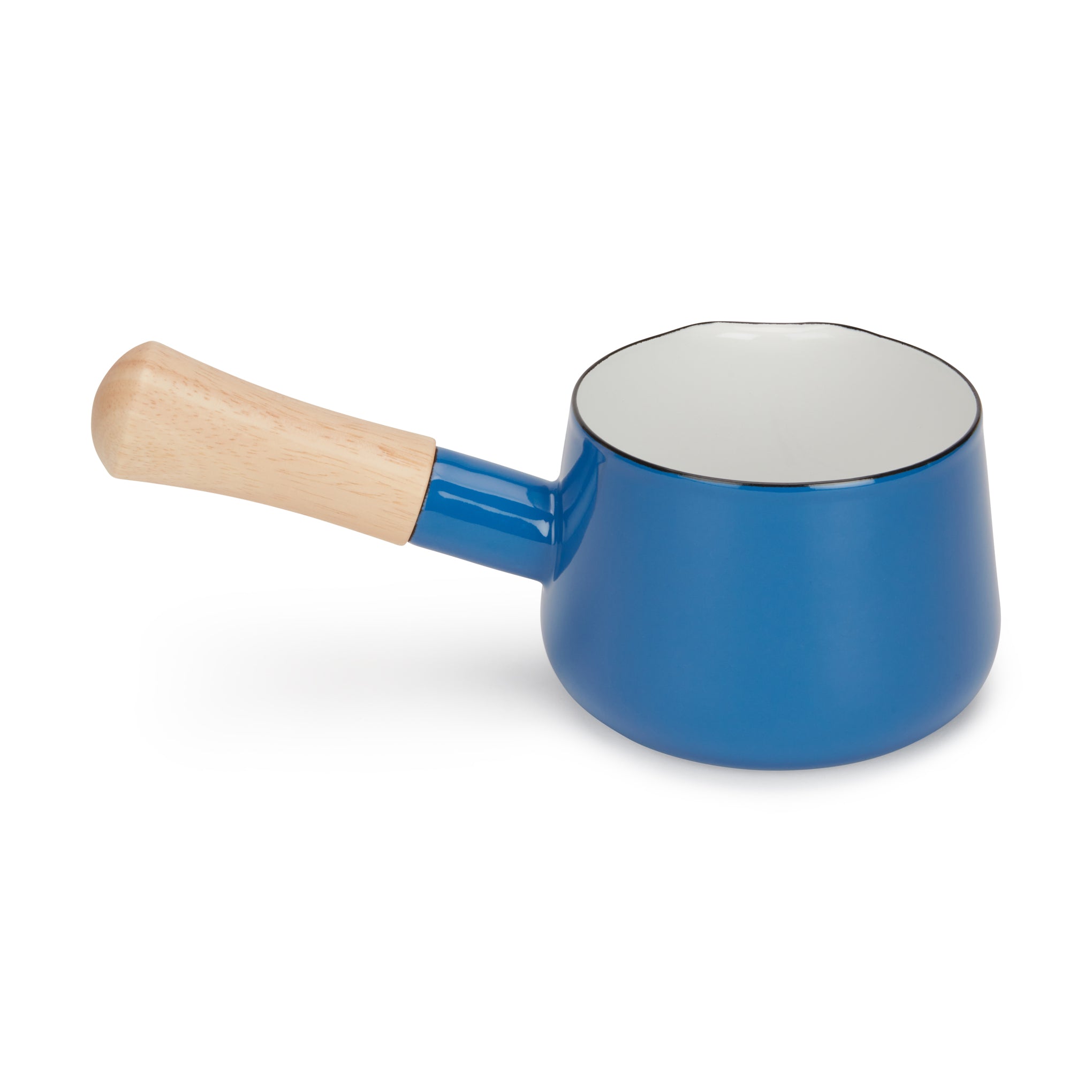 MoMA Exclusive: Experience the joy of cooking with the Porcelain Enamel Milk Pan. This small and easy-to-use pan brings a pop of personality to your cooking routine. Crafted from low carbon steel and coated with enamel. the pan is designed for durability and long-lasting performance. The thoughtfully crafted wooden handle provides a comfortable grip. making it a pleasure to use. too. Made from a solid 1 mm thick enameled steel plate. it strikes the perfect balance between thermal efficiency. robustness and lightweight convenience. Safe for use on induction. gas. and electric stovetops. Hand wash only. The Porcelain Enamel Milk Pan measures 4h x 9.25w x 4.7d. Holds 25oz.