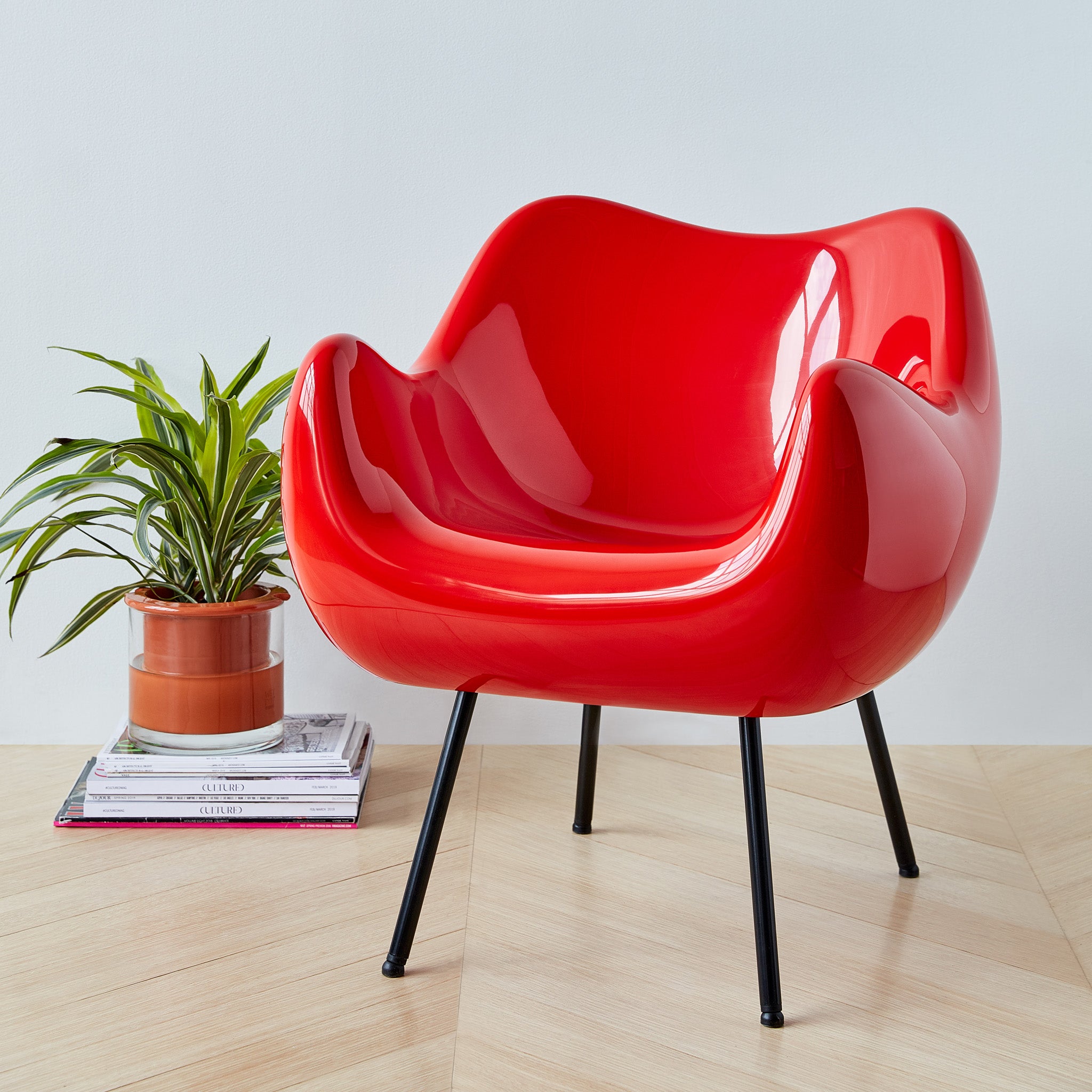 MoMA Exclusive: An Eastern European design icon from 1958. the RM58 Classic Chair was revolutionary for being one of the earliest examples of polyester-glass laminate furniture. In its original design by Roman Modzelewski. the RM58 is also manufactured exactly as the original—manually at a shipyard using yacht and boat production technologies. It’s sealed with a synthetic colored resin that guarantees extended longevity. Never serially produced until now. the RM58 is handmade in Poland from the original material. The RM58 Classic Chair is a comfortable lounge chair for your living space or office which doubles as a show-stopping sculpture. The RM58 Classic Chair comes in tomato red and has a 310lb weight limit.