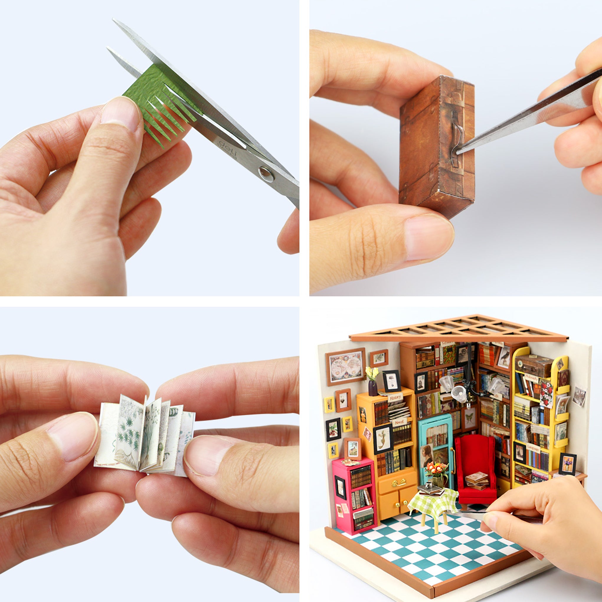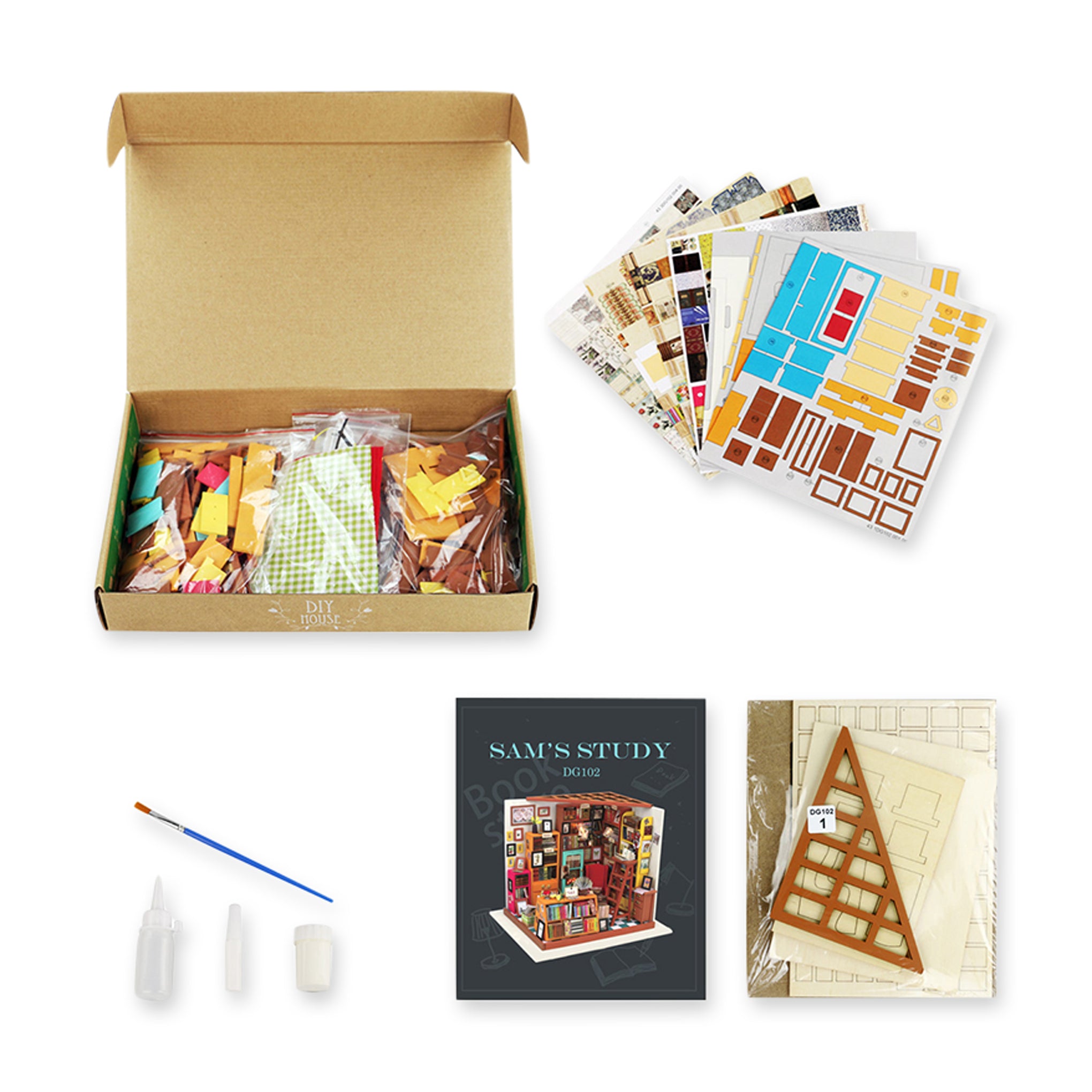 This DIY Miniature Kit invites you to build a structure that condenses a real-life scene into a small. detailed model. The kit includes over 300 pieces that allow you to create tiny objects. Plus. an LED light lets you illuminate your creation when you’re done. (Requires two lithium button-cell batteries. not included). Kit includes tools and instructions. Assembly time: 4–6 hours. For ages 14+. Assembled: 7.1h x 9.45w x 6.1d.