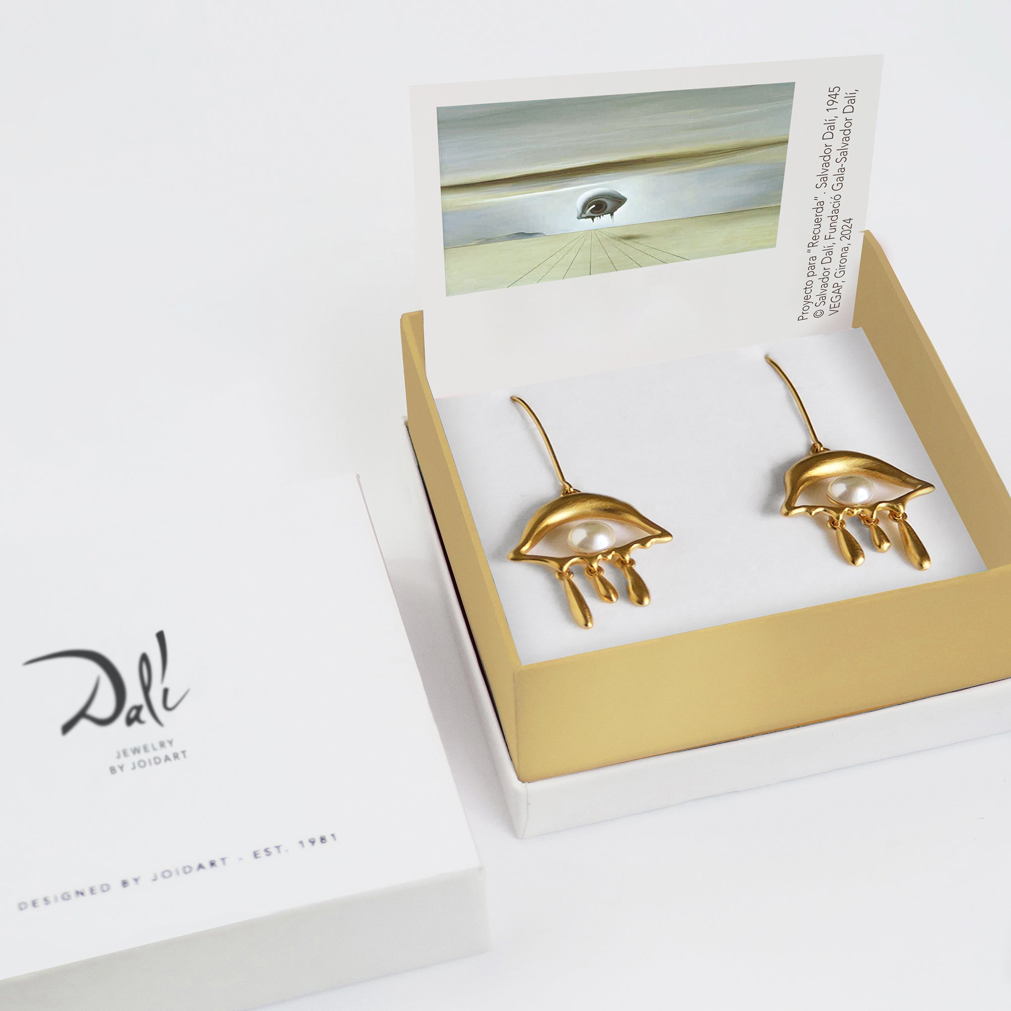 Inspired by the symbolic elements of artist Salvador Dalí’s Project for ‘Spellbound’ for Alfred Hitchock’s Spellbound (1945). a film in MoMA’s collection. these Gold-Plated Eye Drop Earrings pay homage to the surrealist artwork in a very special way. Barcelona-based. family-owned jewelry brand Joidart designed the 24k gold-plated matte metal eye to frame a handmade Murano glass eyeball. Wear this pair to make a subtle surrealist statement or team with the matching necklace for a bit more impact. The Salvador Dalí Gold-Plated Eye Drop Earrings each measure 2.50l x 1.10w. Salvador Dalí’s work is represented in MoMA’s collection.