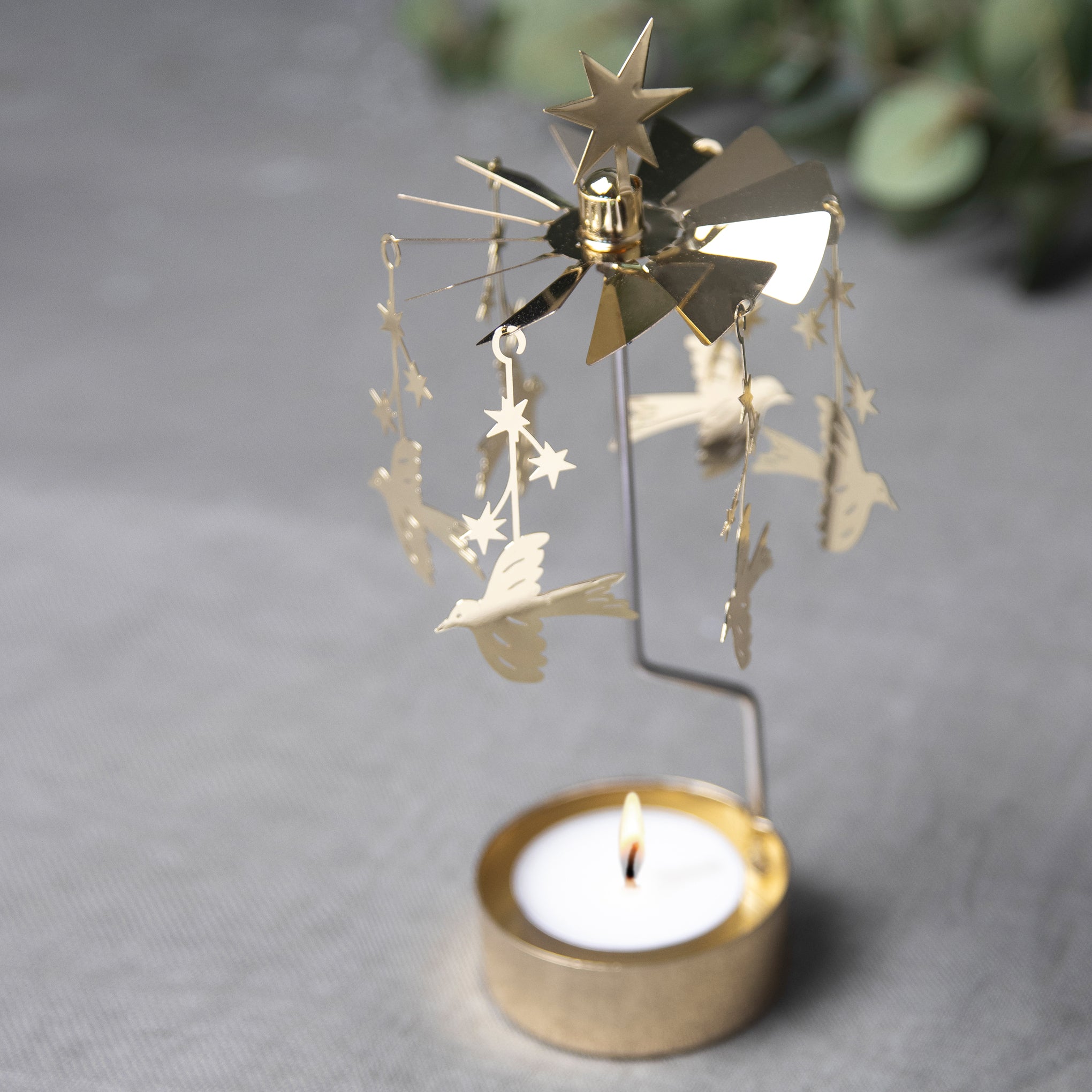 This magical Starling Rotary Tea Light Candle Holder features a tree-inspired mobile that rotates when a lit votive candle is placed in the stand’s holder. The tree is adorned with starling bird and star motifs. Candles not included. The Starling Rotary Tea Light Candle Holder is made in Sweden from plated iron and measures 6h.
