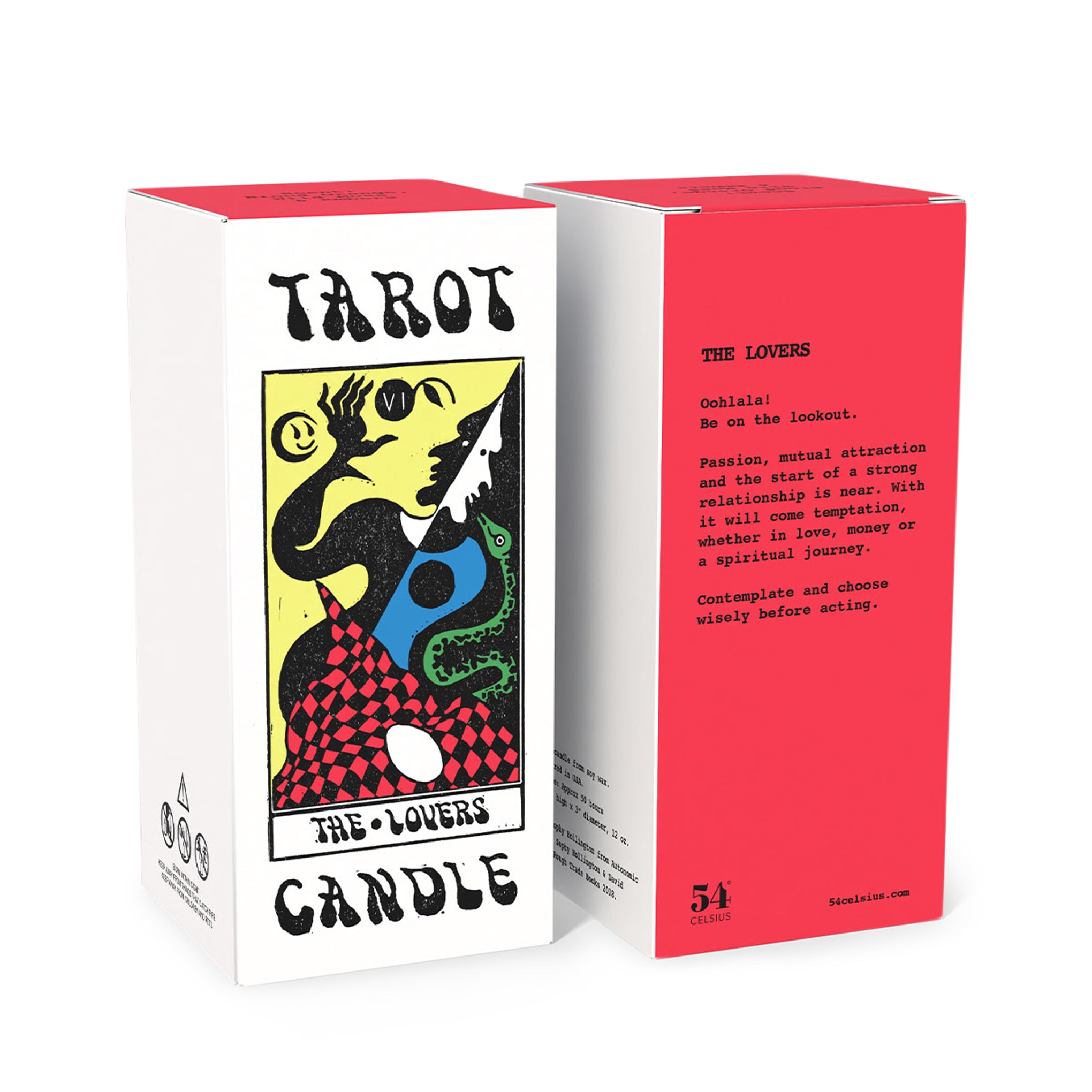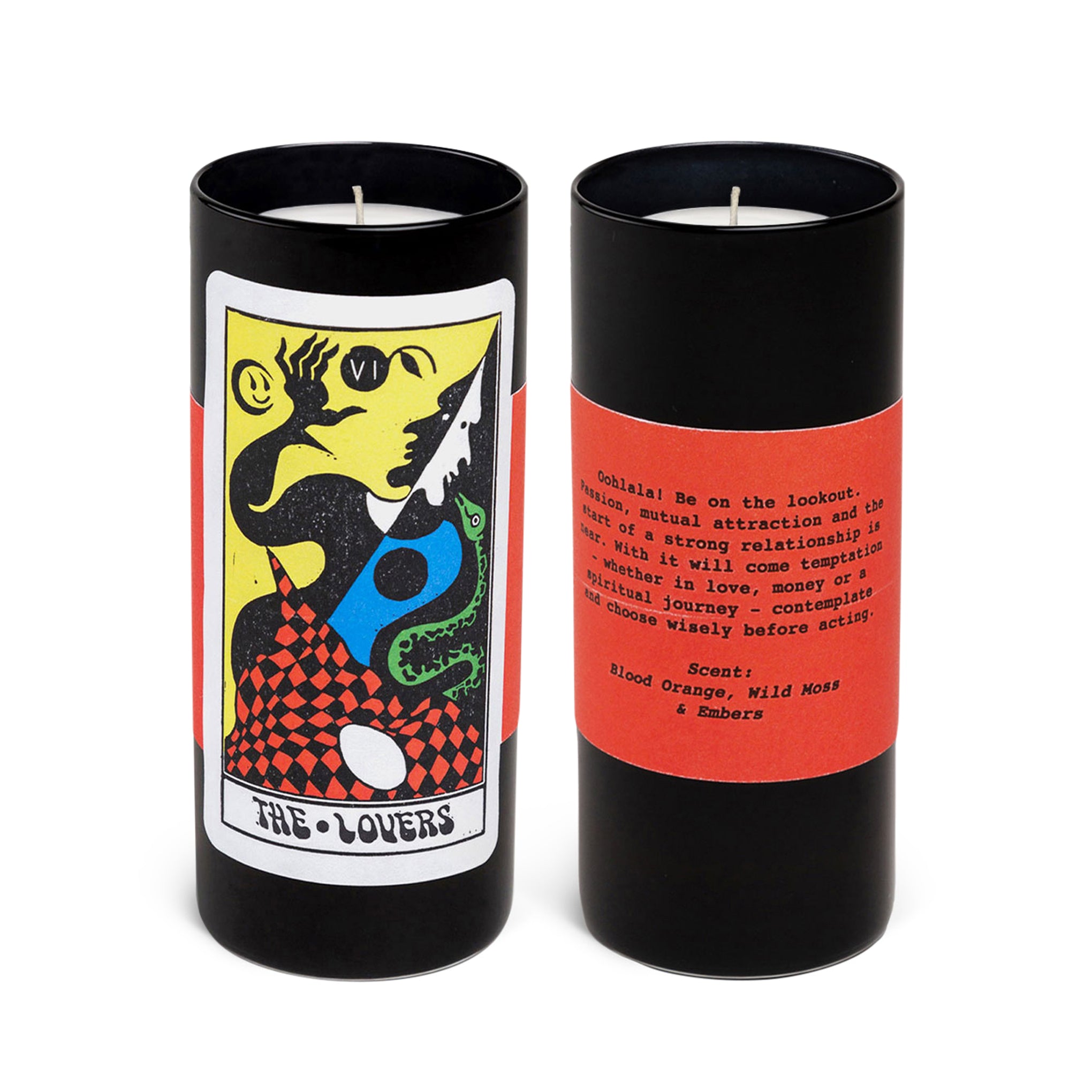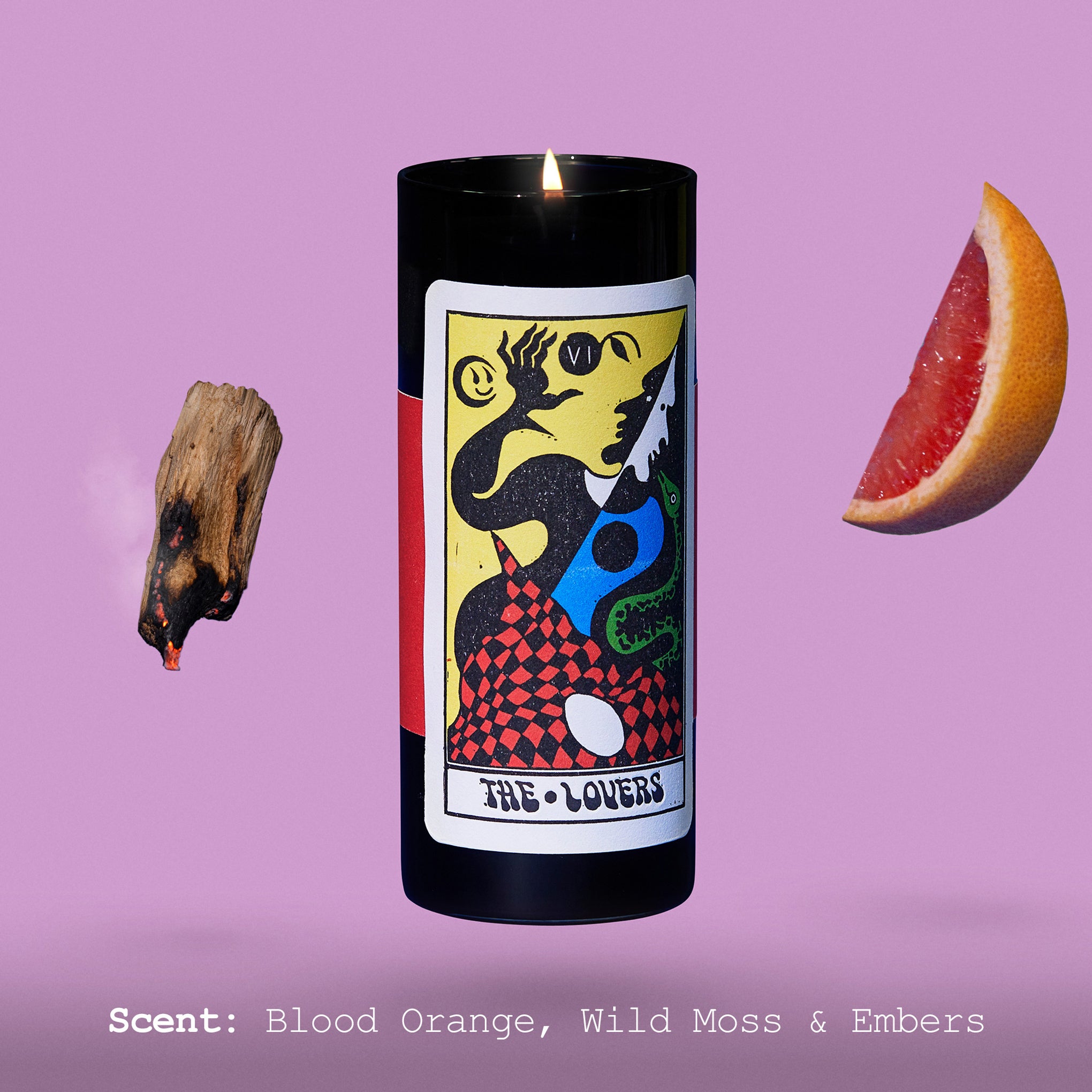 A candle that’s a tarot card reading and wellness experience all in one. This scented candle features a unique illustration by Sophy Hollington that references The Lovers card in a tarot deck. along with your tarot reading printed on the back. This USA-made candle fills your room with the relaxing scent of blood orange. wild moss and embers. and has a burn time of approximately 60 hours. The Lovers Tarot Card Scented Candle is made with soy wax and a cotton wick inside of a glass jar. Once the candle has burned. the jar can be repurposed for other uses. It measures 6h x 2diam. Artworks that reference tarot cards. such as Betye Saar’s House of Tarot (1966) are represented in MoMA’s collection.