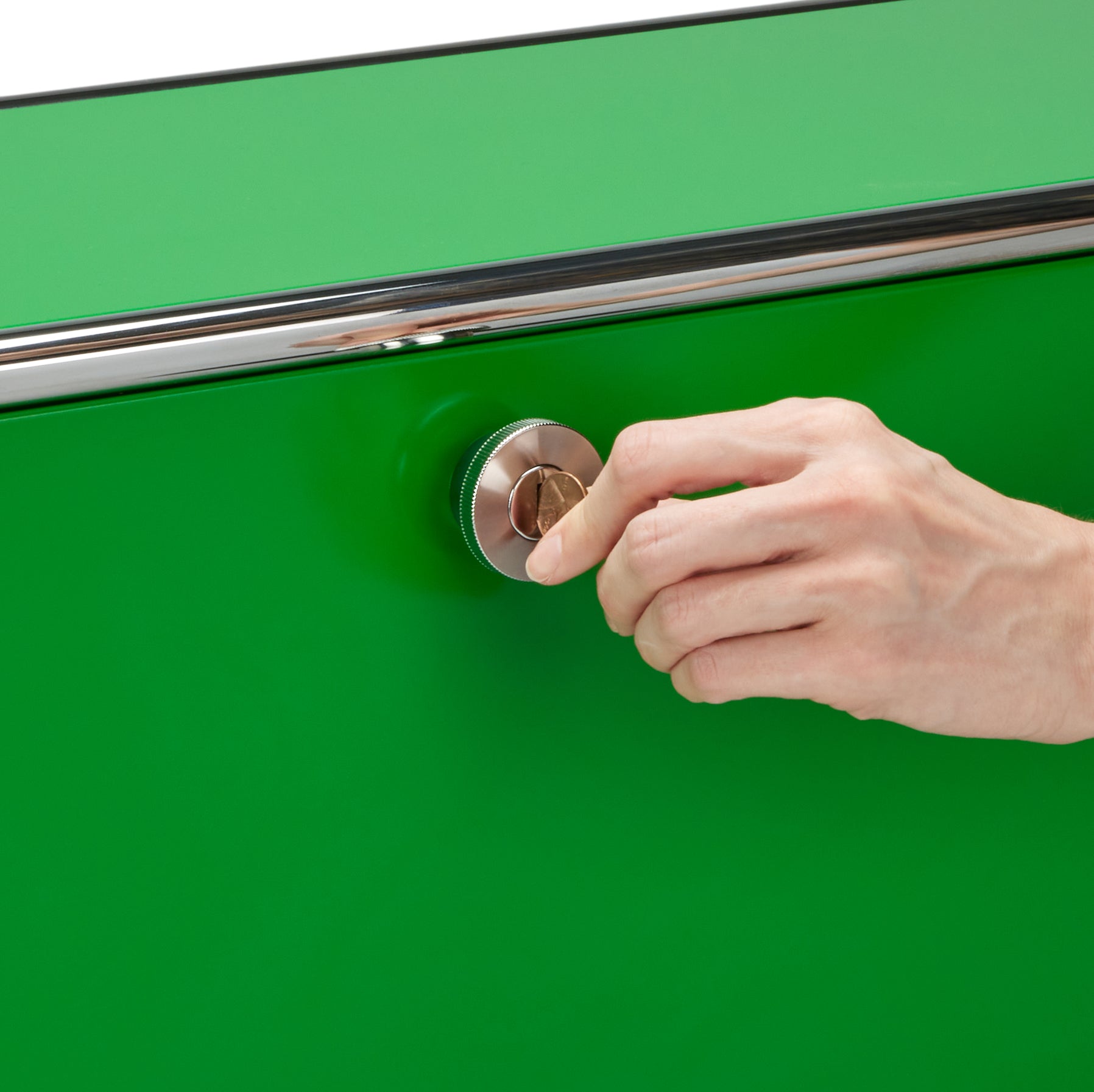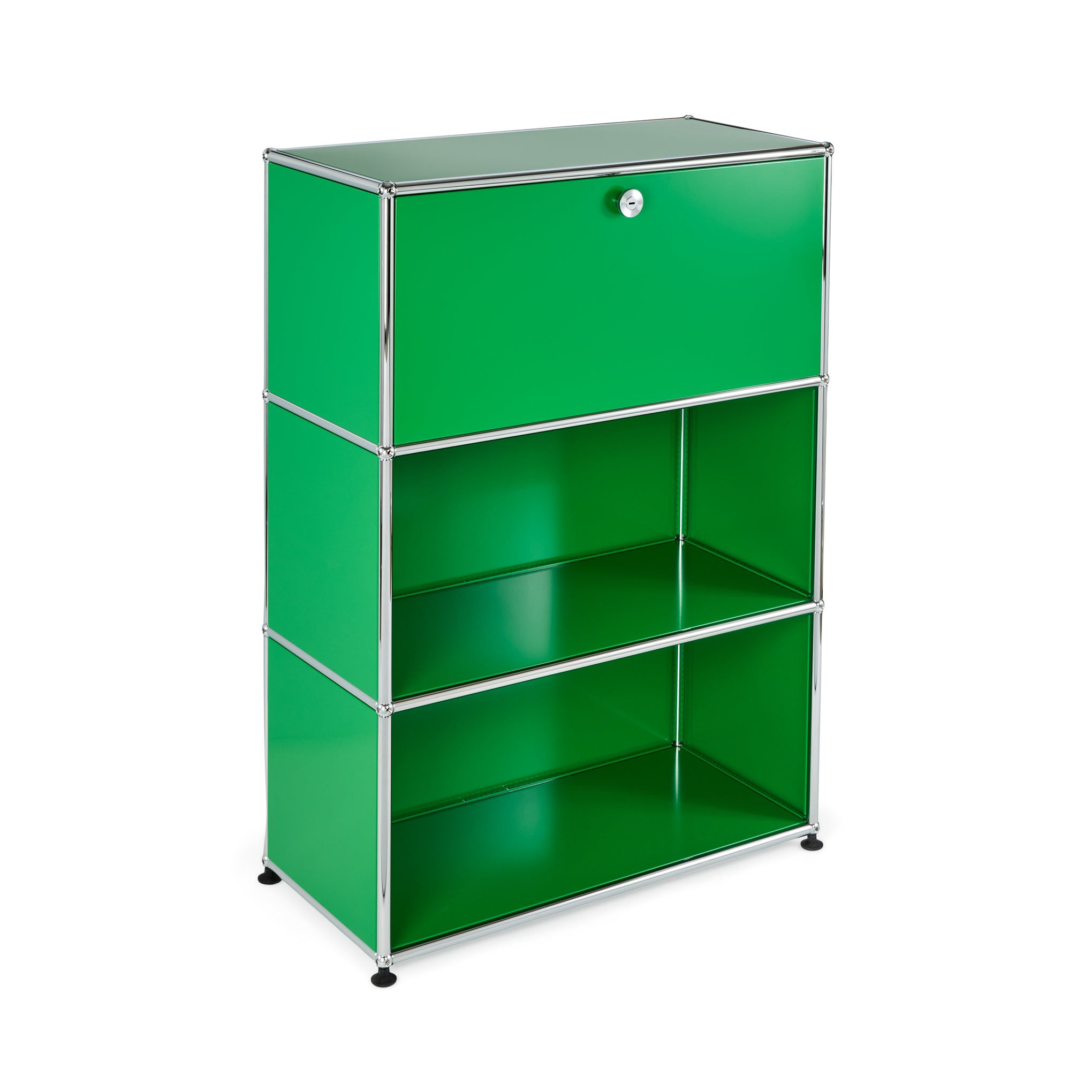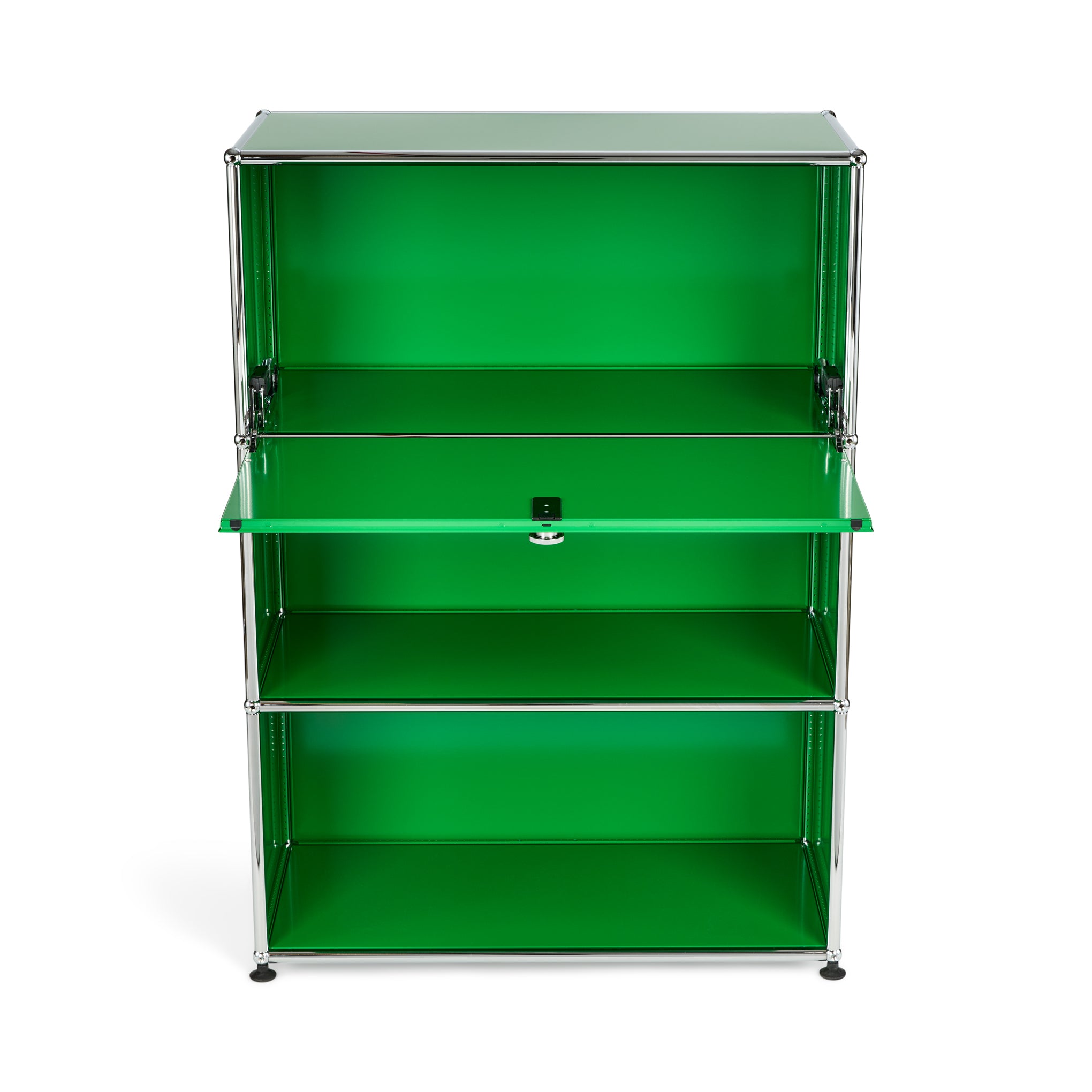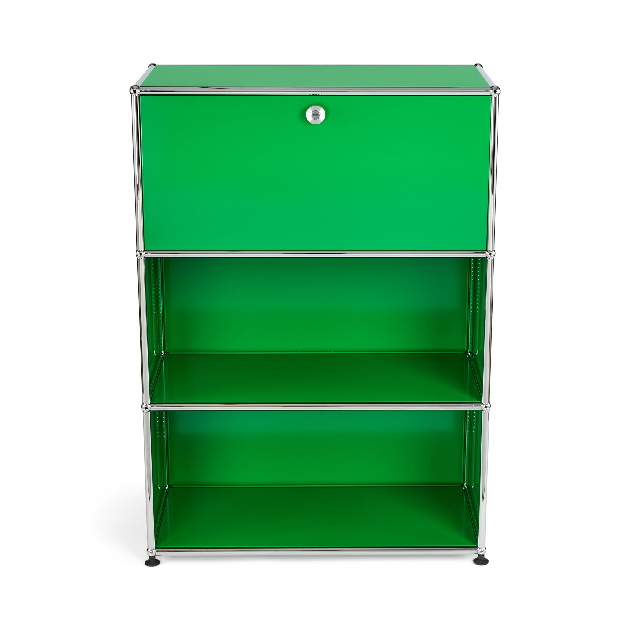 A 1964 design from the iconic line of USM Haller storage solutions. this 3-tier unit features a cleverly contained desk function. The top door of this green steel and silver chrome design flips open to create a convenient desk space. When not in use as a desk. the hide-away feature can be used to store your laptop or tablet. books. files. digital accessories and more. When closed. the door can be secured by using a coin or key to turn the slot within the knob. The open middle and bottom tiers can be used to store a wide range of items.
