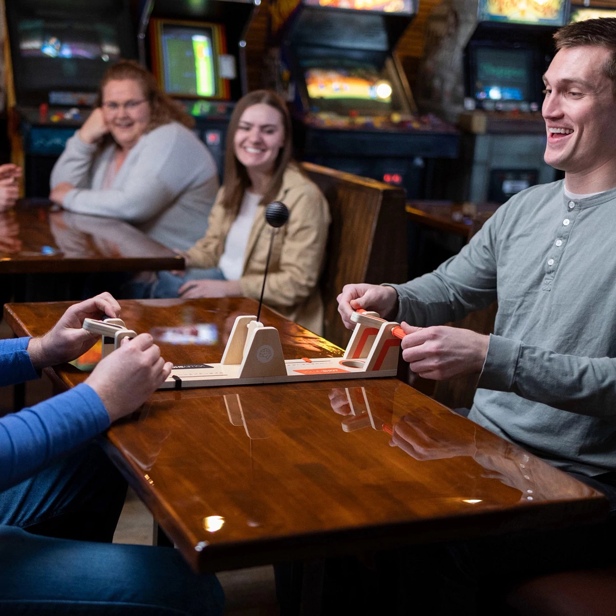 A new design for game night! In this two-player Volley Shot game each person operates a paddle. knocking a ball attached to a rod back and forth until someone misses. Every miss is a point for your opponent and the game requires you to stay focused and steady. The game encourages hand-eye coordination and concentration. Made from high-quality solid wood parts. the Volleyshot Toy measures 8.5h x 12.5w x 2.25d. Ages 8+.