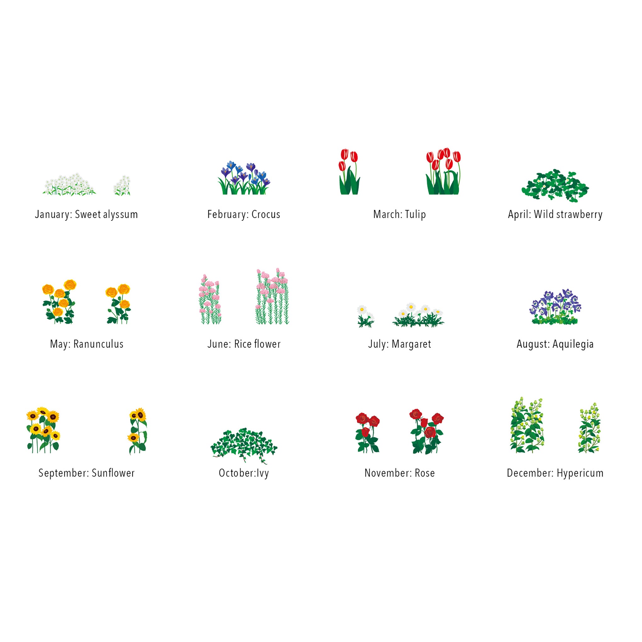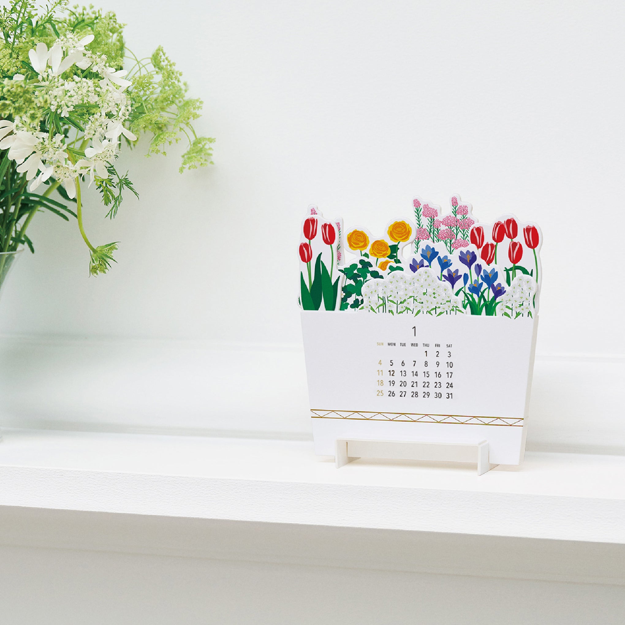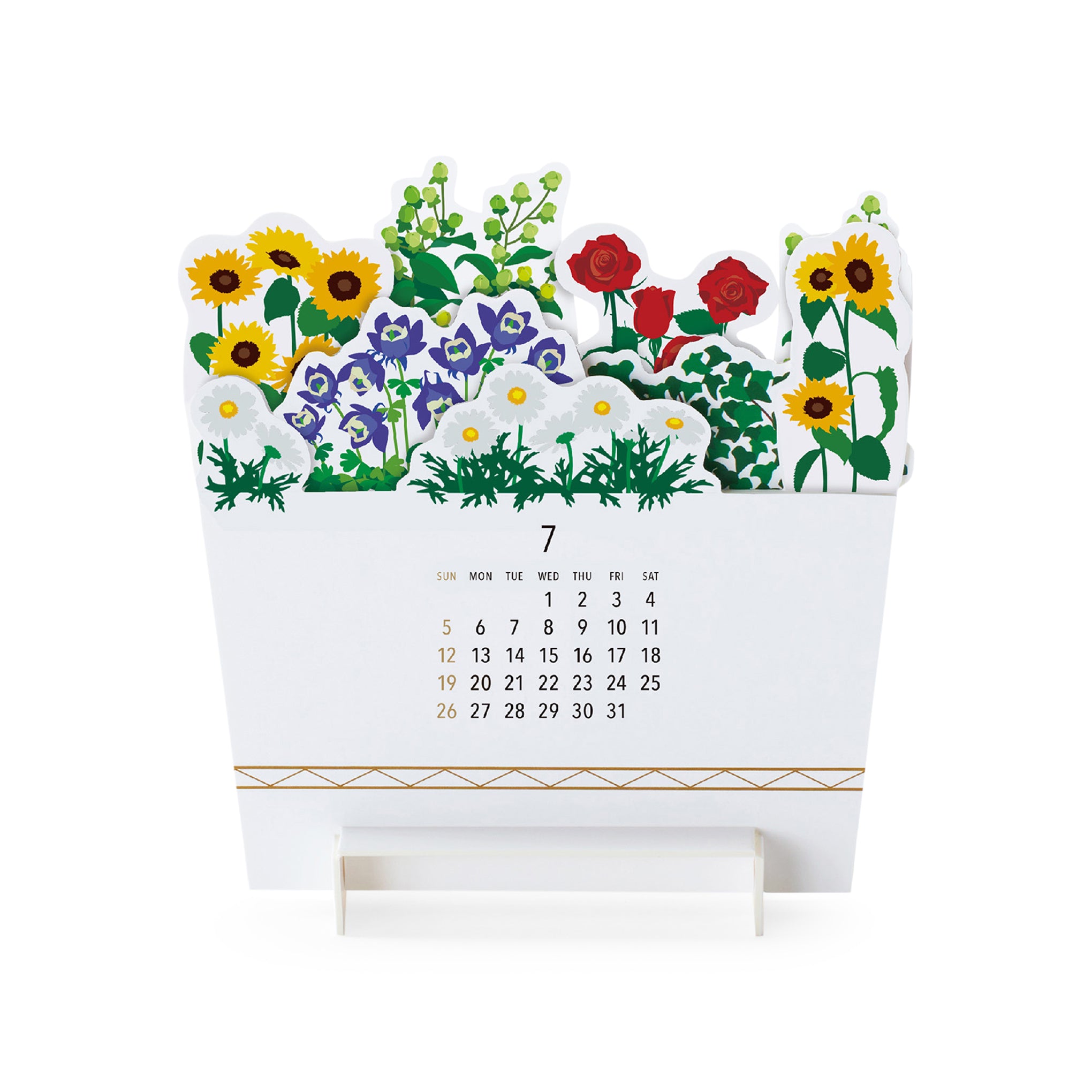 The Bloom is a calendar designed around the motif of planted flower grouping. Set the six sheets on top of the stand one in front of the other. in the order of January through June. When the month is finished. turn it over and move it all the way to the back.