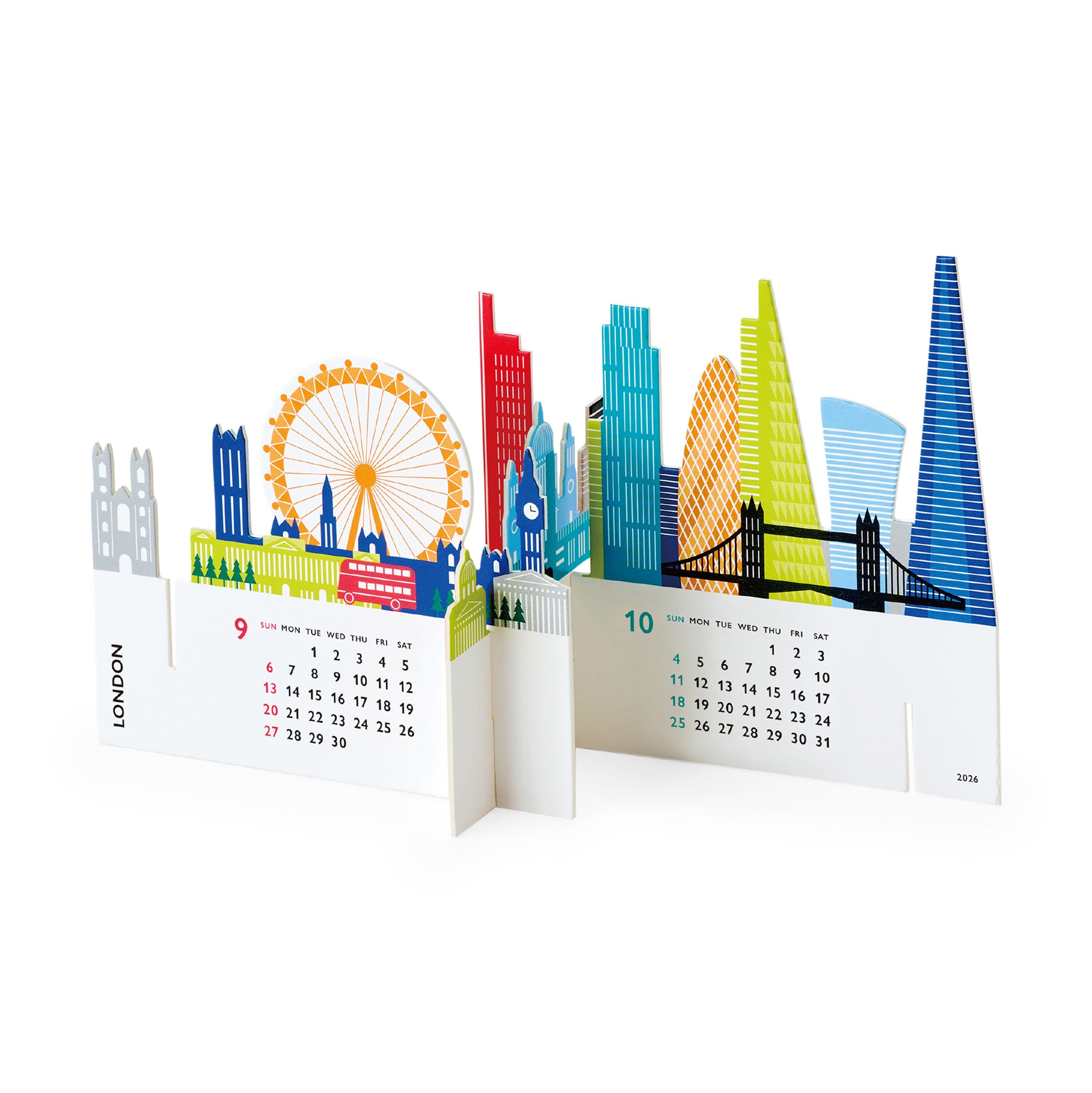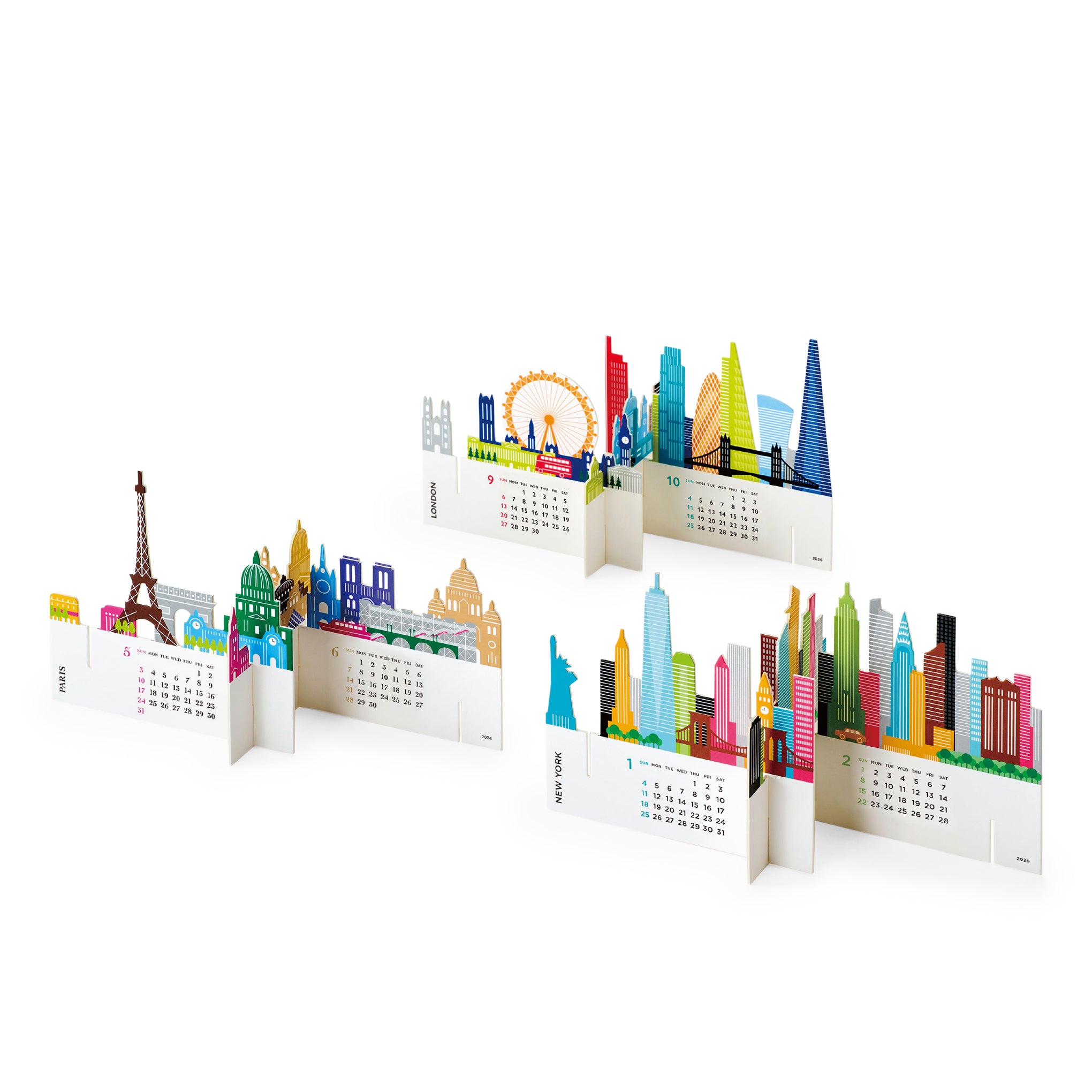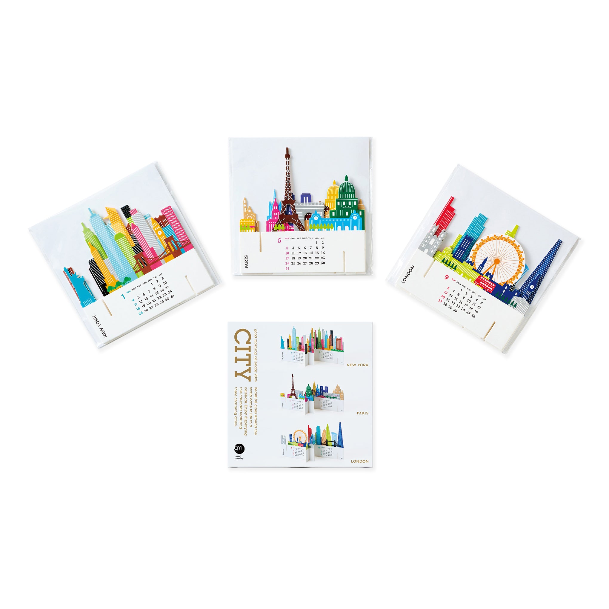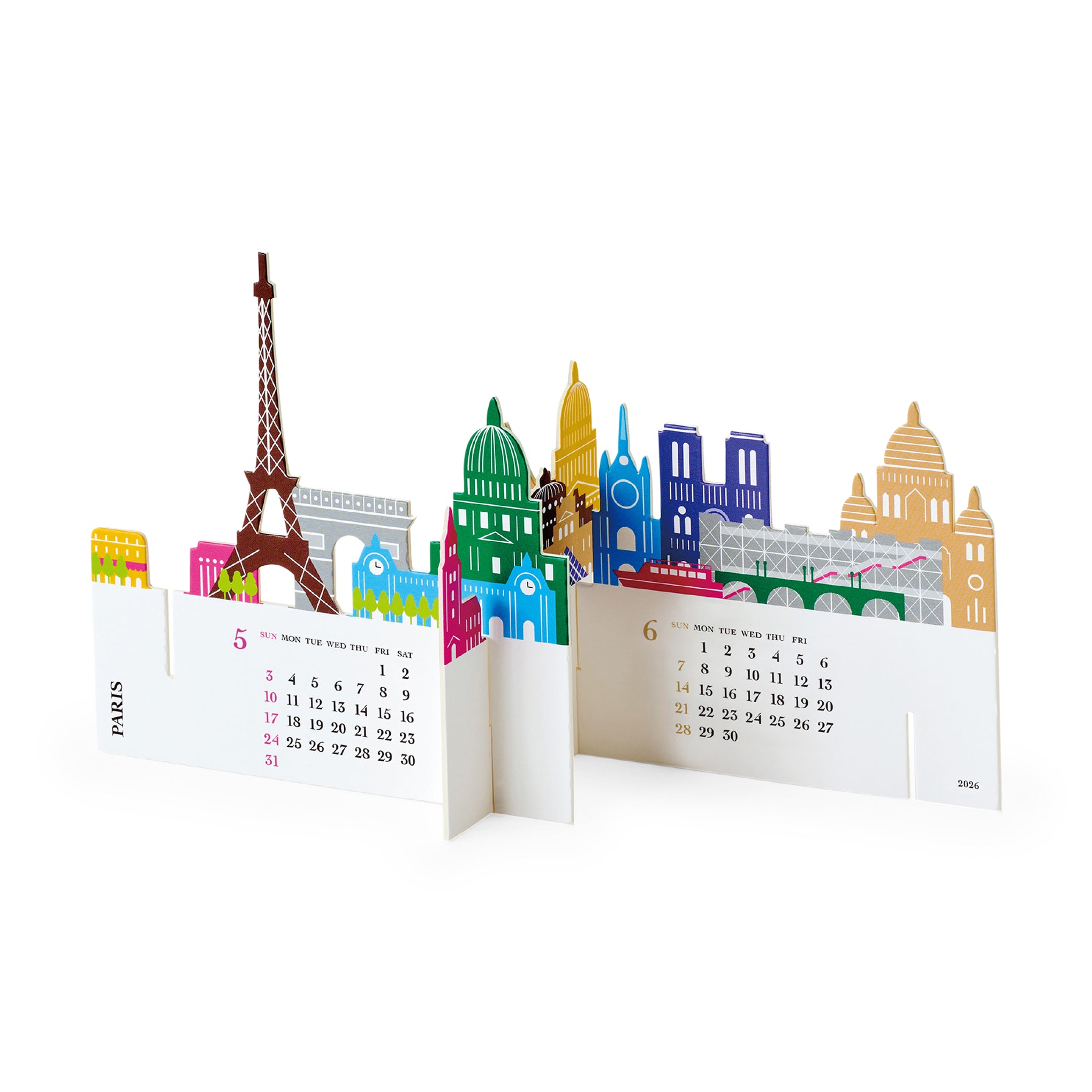The City is a calendar based on the motif of cities around the world. Assemble the parts to create colorful cityscapes filled with famous landmarks. No scissors or glue needed. Each building is a two-month calendar. The 2026 calendar features New York. Paris. and London.