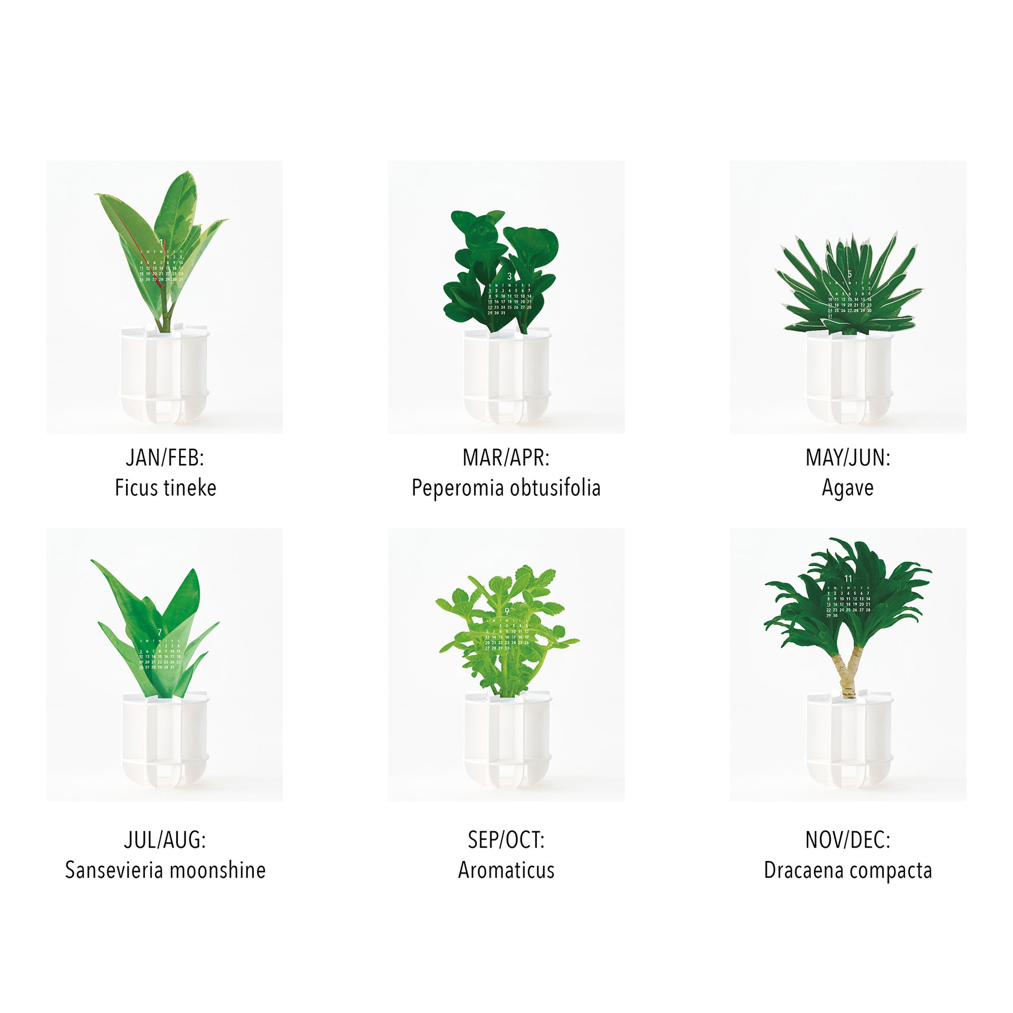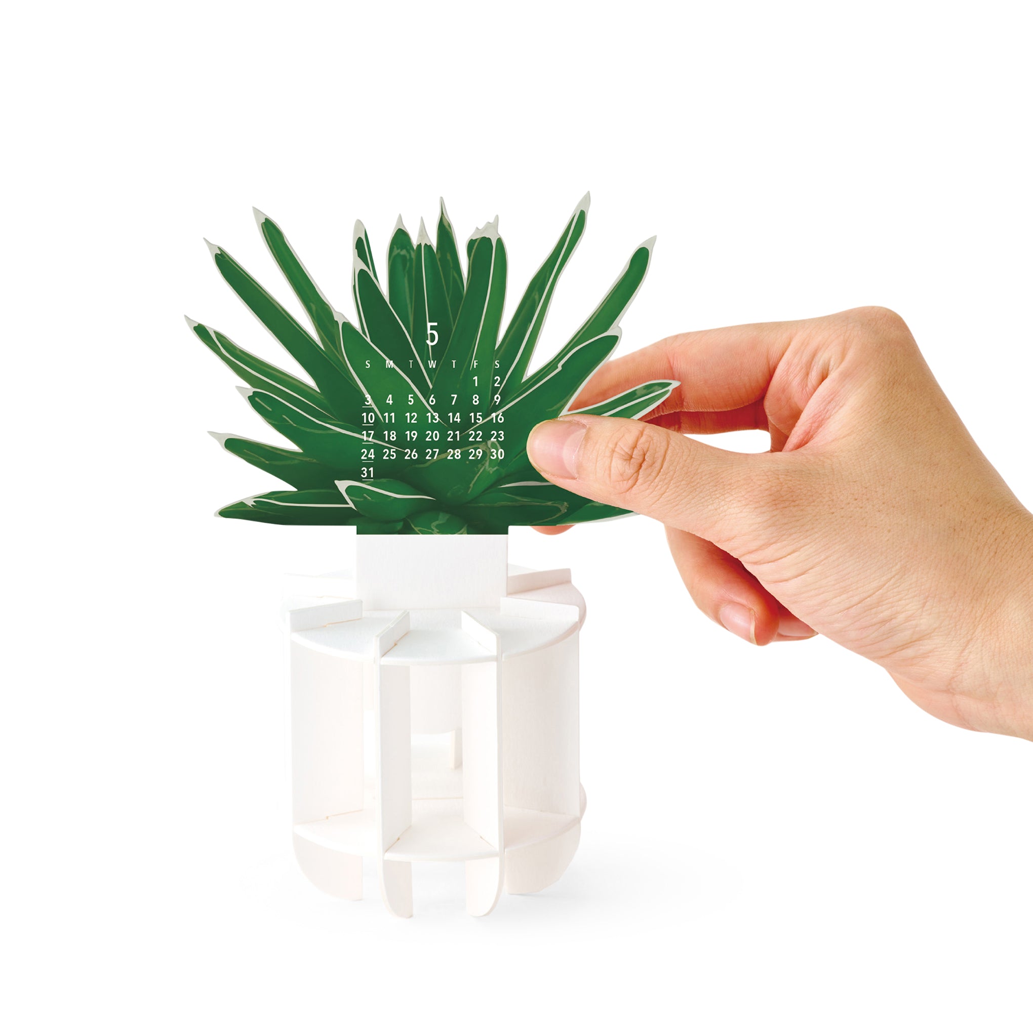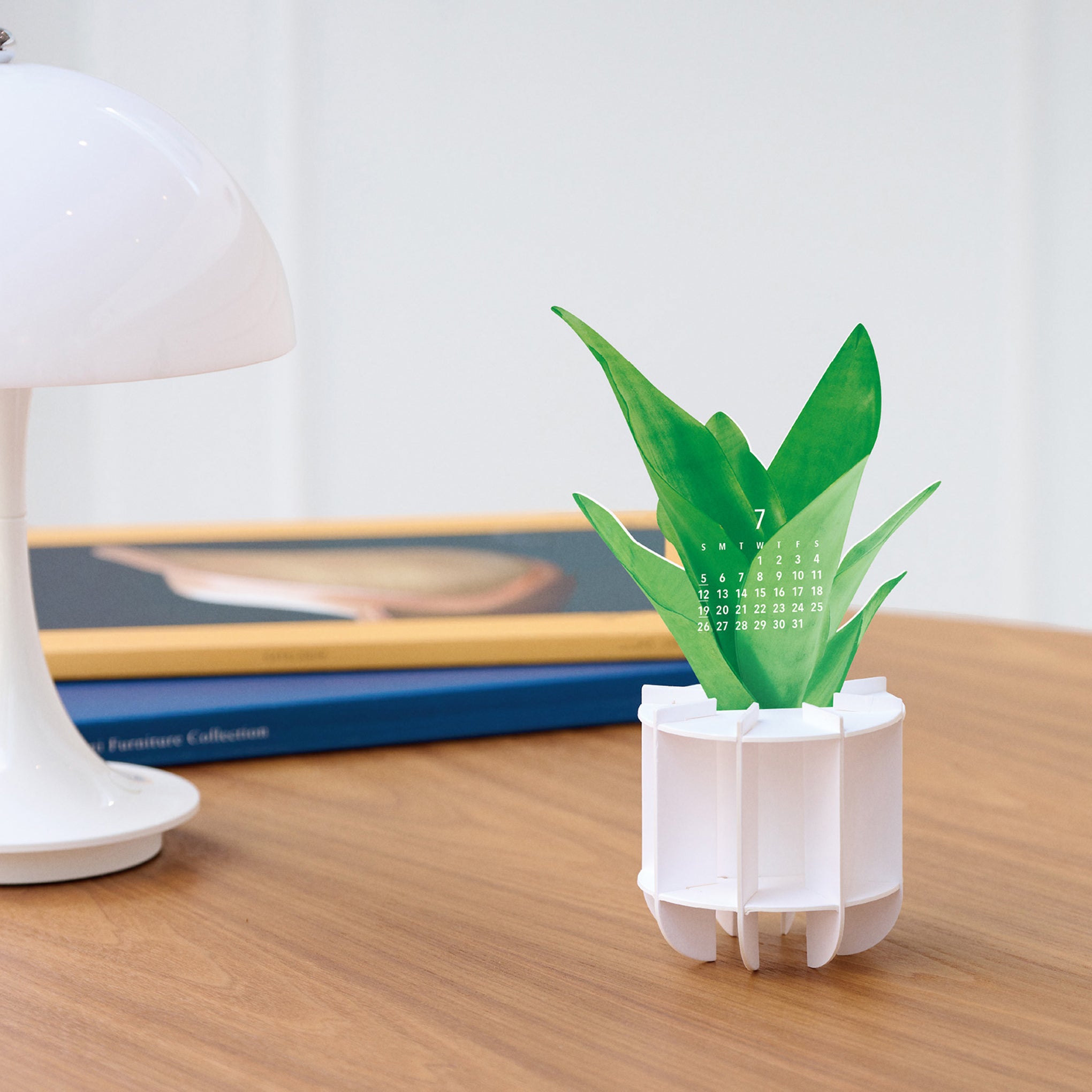 The Green Desk calendar is designed with the theme of houseplants. Assemble the flowerpot-shaped base and insert the plants to easily enjoy life with greenery. It measures 7h ×4w x 3d when assembled.