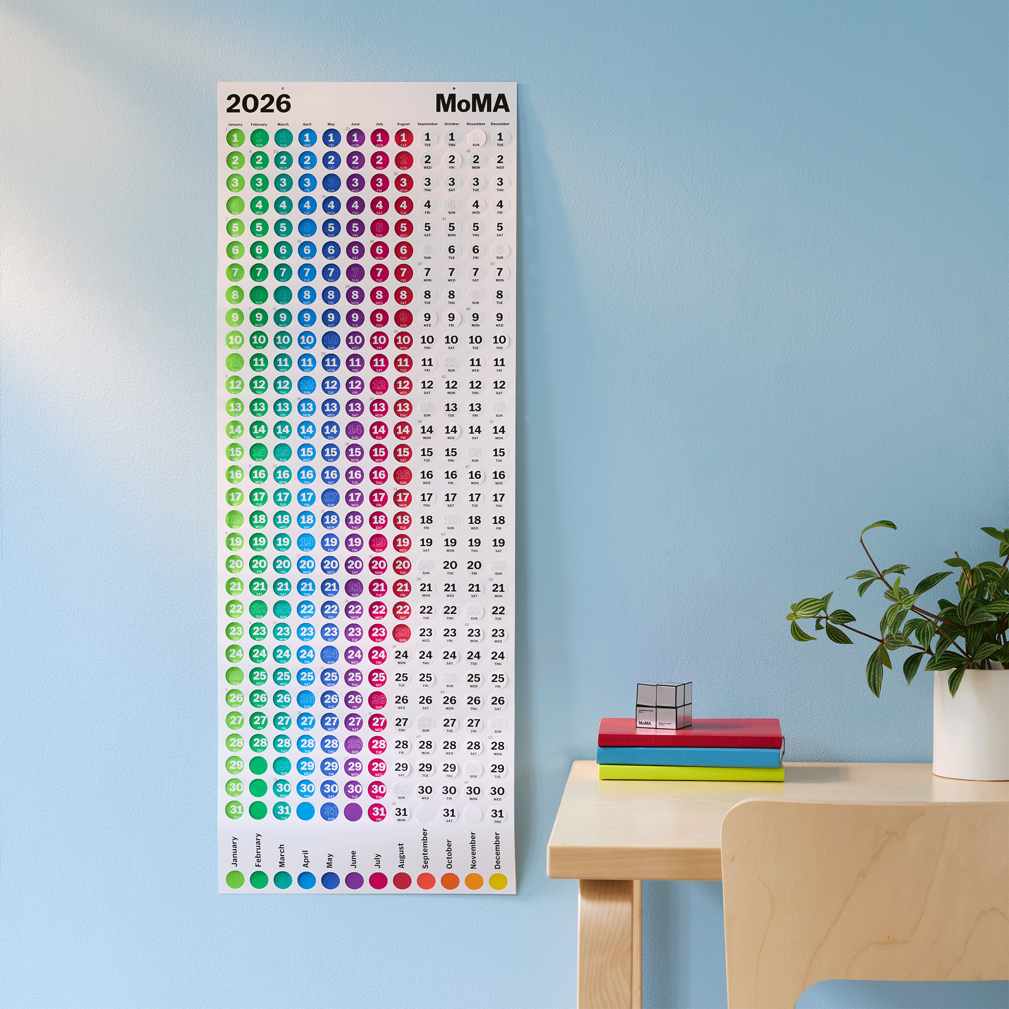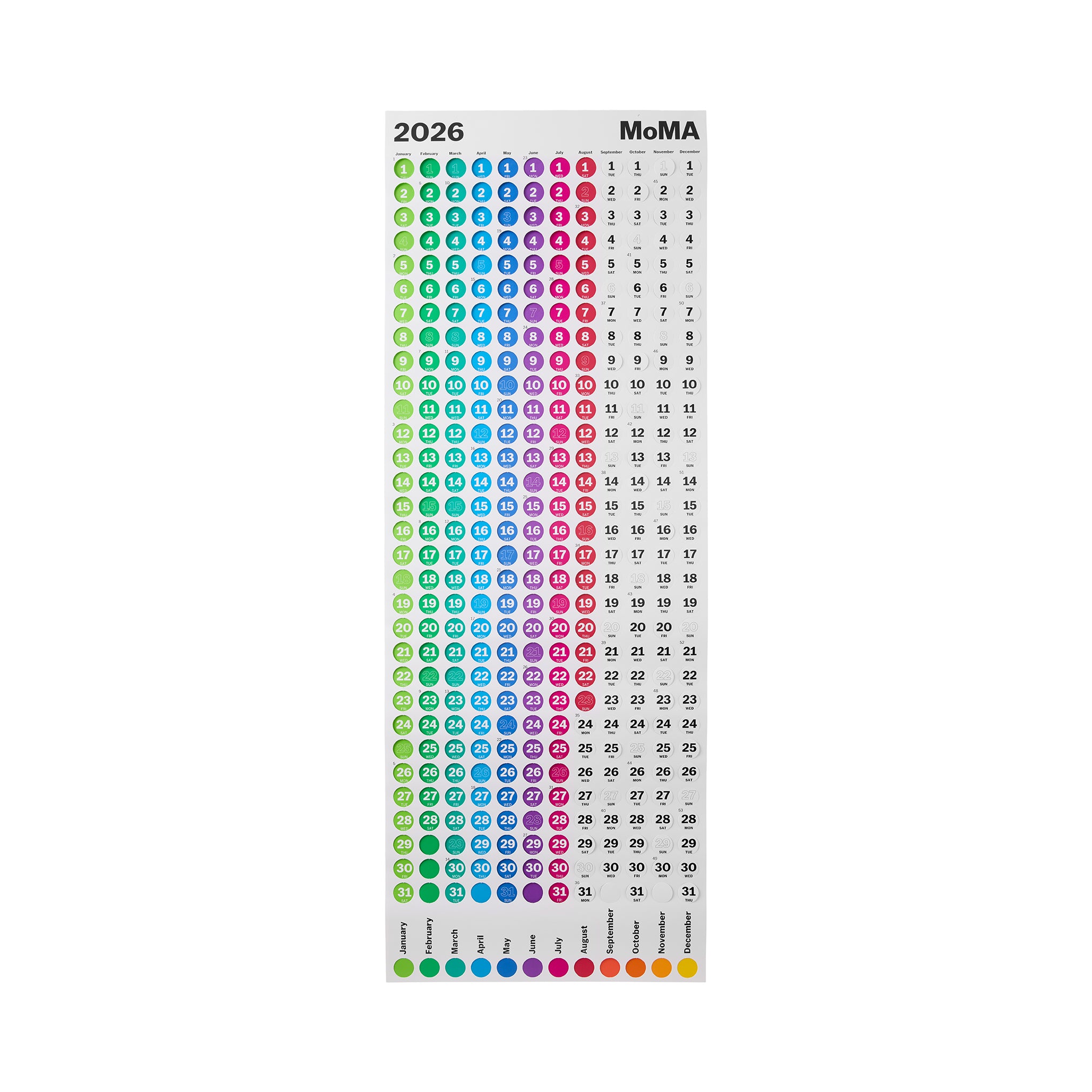 Punch out the day’s dot to expose the vivid color underneath with this 2026 edition of the best-selling Jumping Point calendar. Made in Germany. The 2026 Jumping Point Calendar measures 38h x 14w.