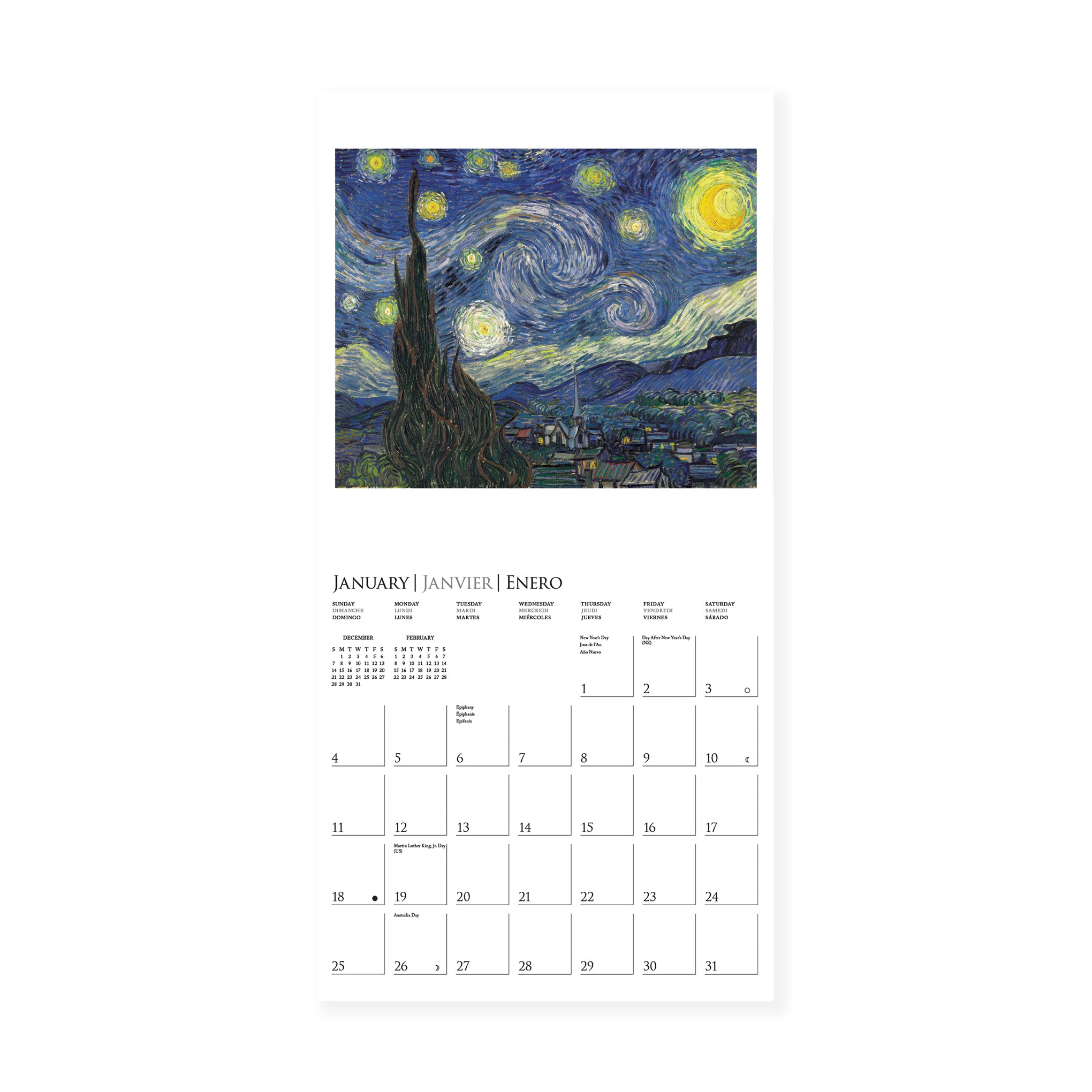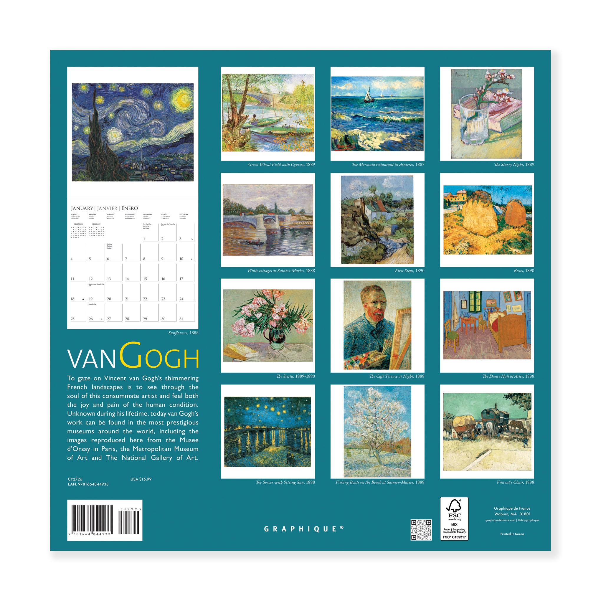 This 2026 wall calendar features 12 works by Vincent van Gogh. an artist whose work is featured in MoMA’s collection. It measures 12h x 12w.