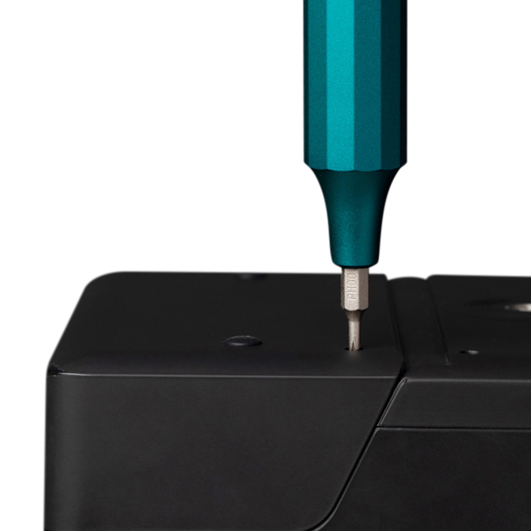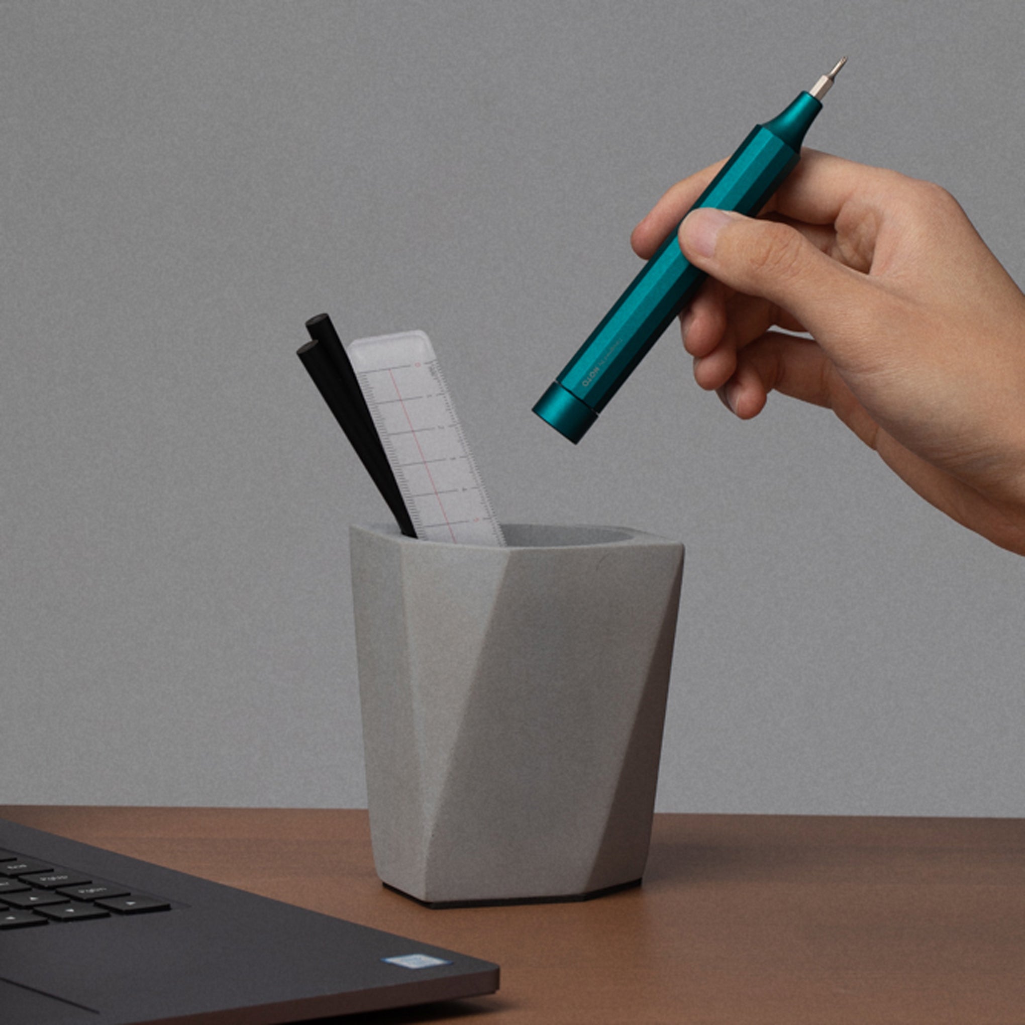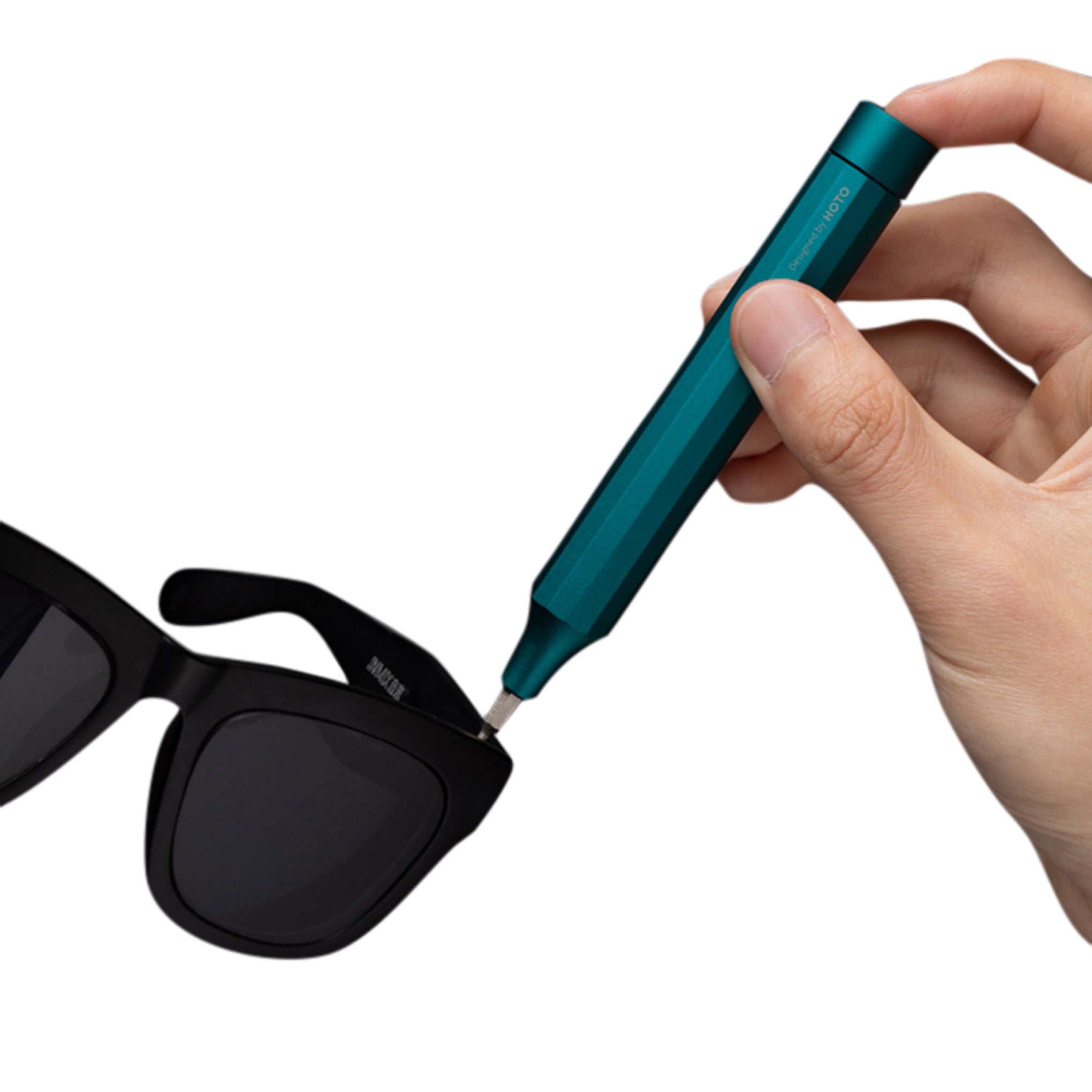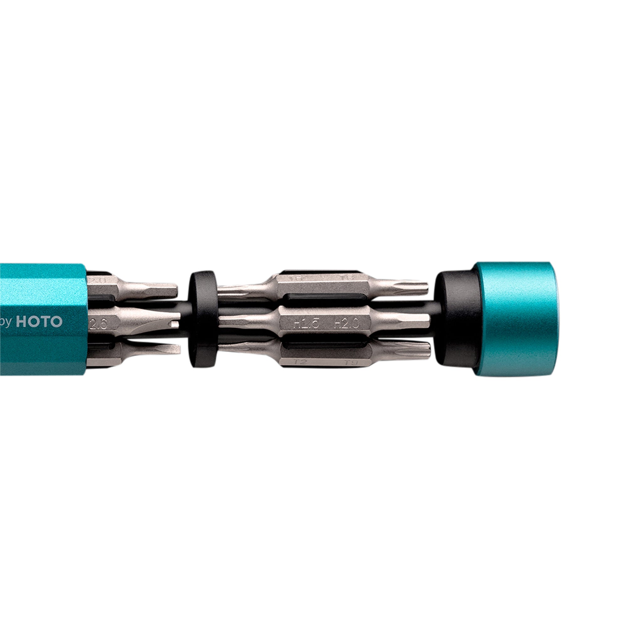 As compact and easily maneuvered as a pen. this tiny screwdriver from Hoto has a magnetic chuck and an unique all-in-one design: It stores 24 S2 alloy steel bits inside its brightly colored. aluminum alloy body—each easily removed or replaced with a simple click. Ideal for precision jobs like eyeglass or watch repair. The screwdriver itself measures 4.75h x 0.65 diam.