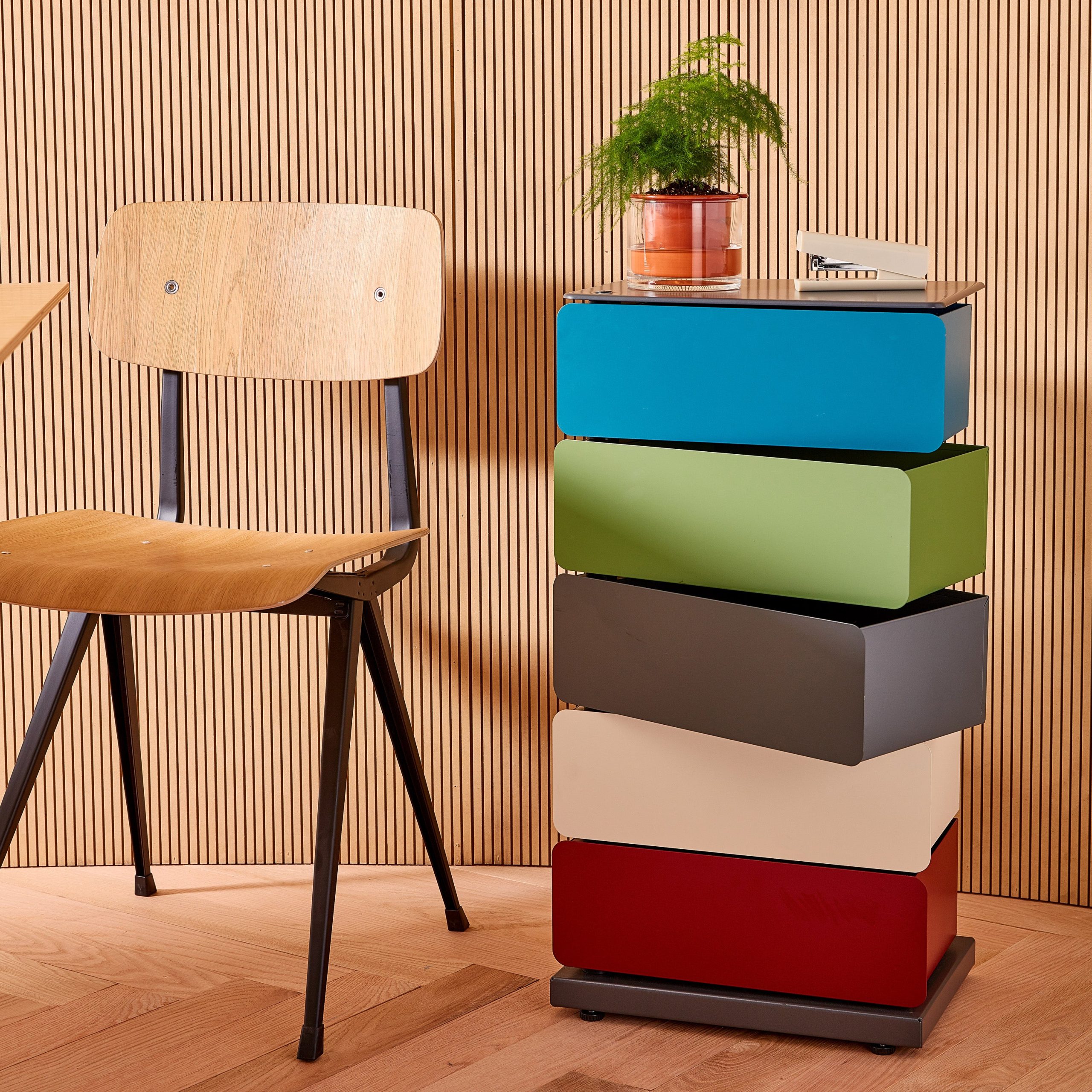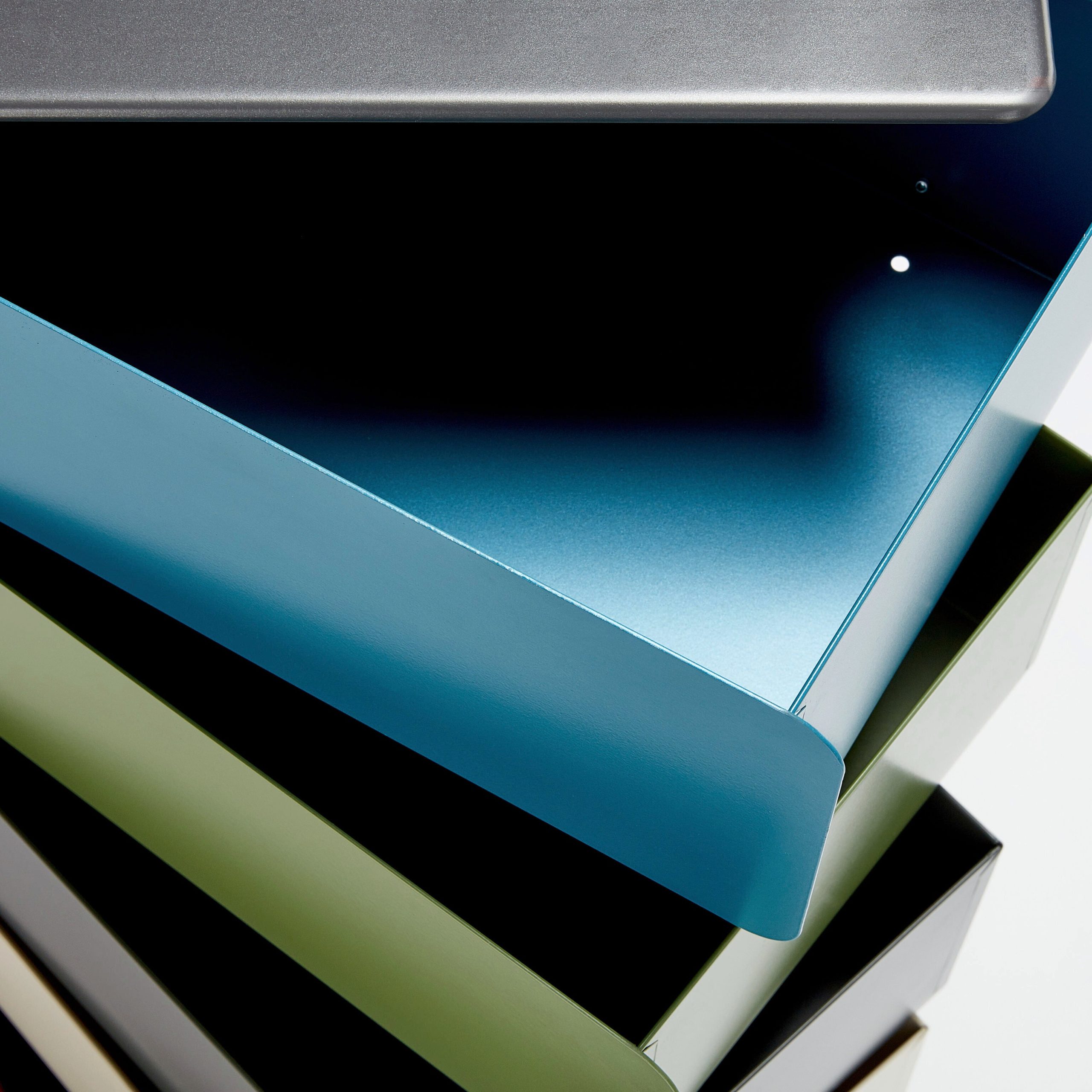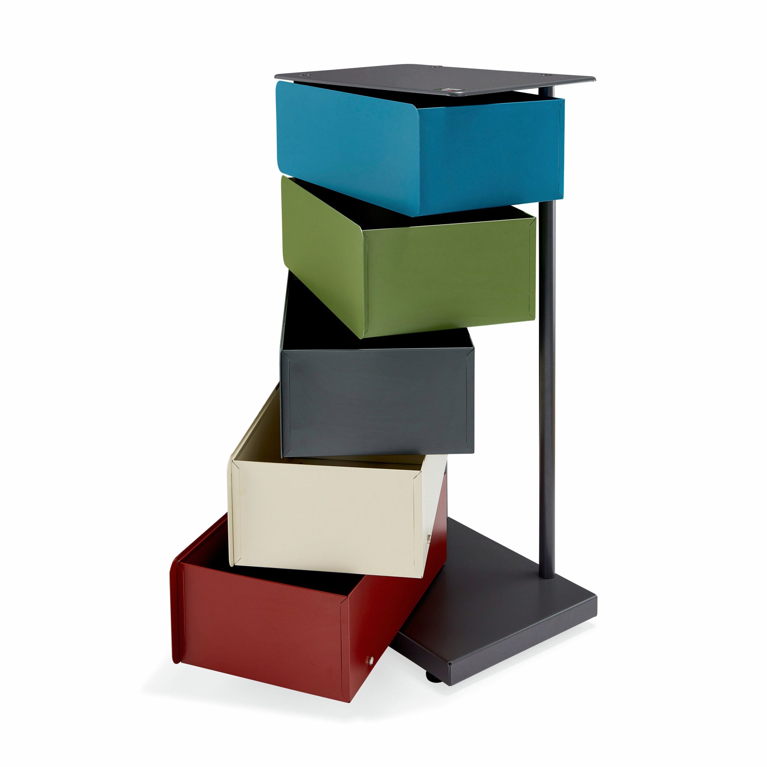 MoMA Exclusive: A beautiful. space-saving solution to your storage needs. the five drawers of this multicolor cabinet pivot out completely. fully exposing the items within it. Made in Italy of powder-coated steel. the 5-Drawer Pivot Cabinet can be used to store and organize many types of household items: notebooks. toys. makeup. electronics. office supplies. files. tax records and other important documents. art supplies and more. Measuring 28.5h x 15w x 10.5d. with a 4.5h x 11.8w x 8.7d interior. the Pivot Cabinet can also be used as a bedside table. Weighs 28.6 lbs.