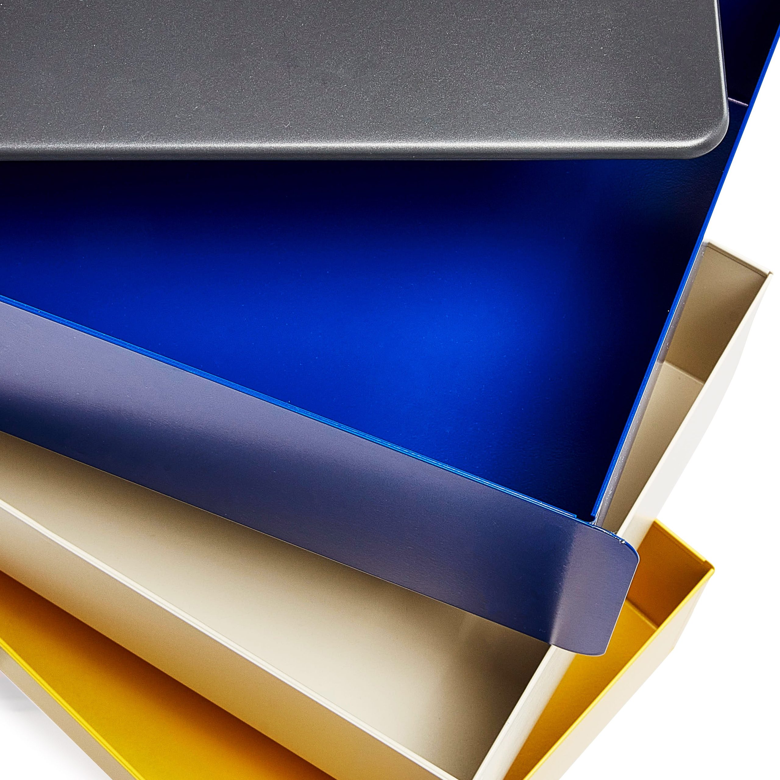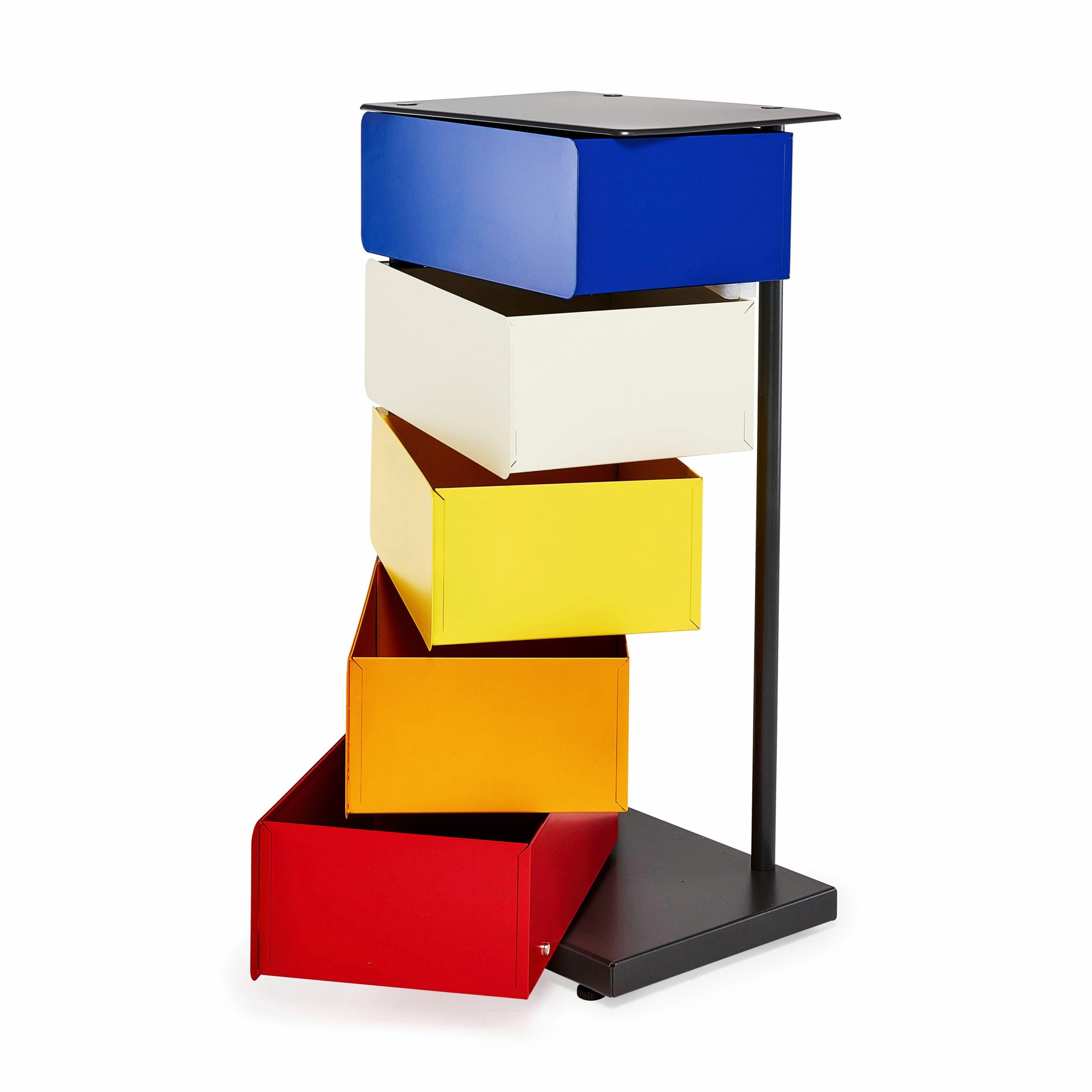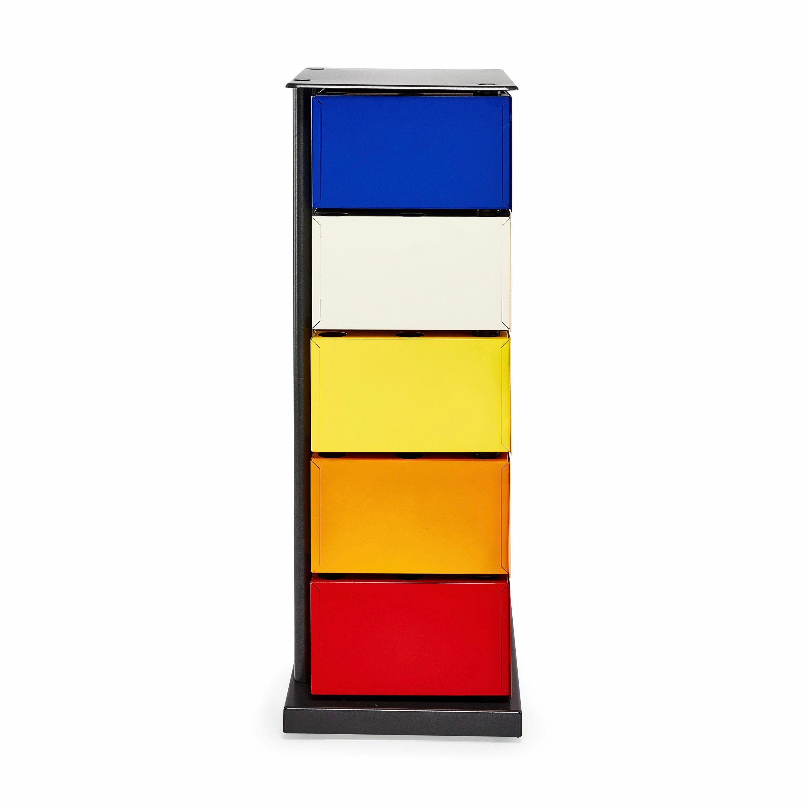 MoMA Exclusive: A beautiful. space-saving solution to your storage needs. the five drawers of this multicolor cabinet pivot out completely. fully exposing the items within it. Made in Italy of powder-coated steel. the 5-Drawer Pivot Cabinet can be used to store and organize many types of household items: notebooks. toys. makeup. electronics. office supplies. files. tax records and other important documents. art supplies and more. Measuring 28.5h x 15w x 10.5d. with a 4.5h x 11.8w x 8.7d interior. the Pivot Cabinet can also be used as a bedside table. Weighs 28.6 lbs.