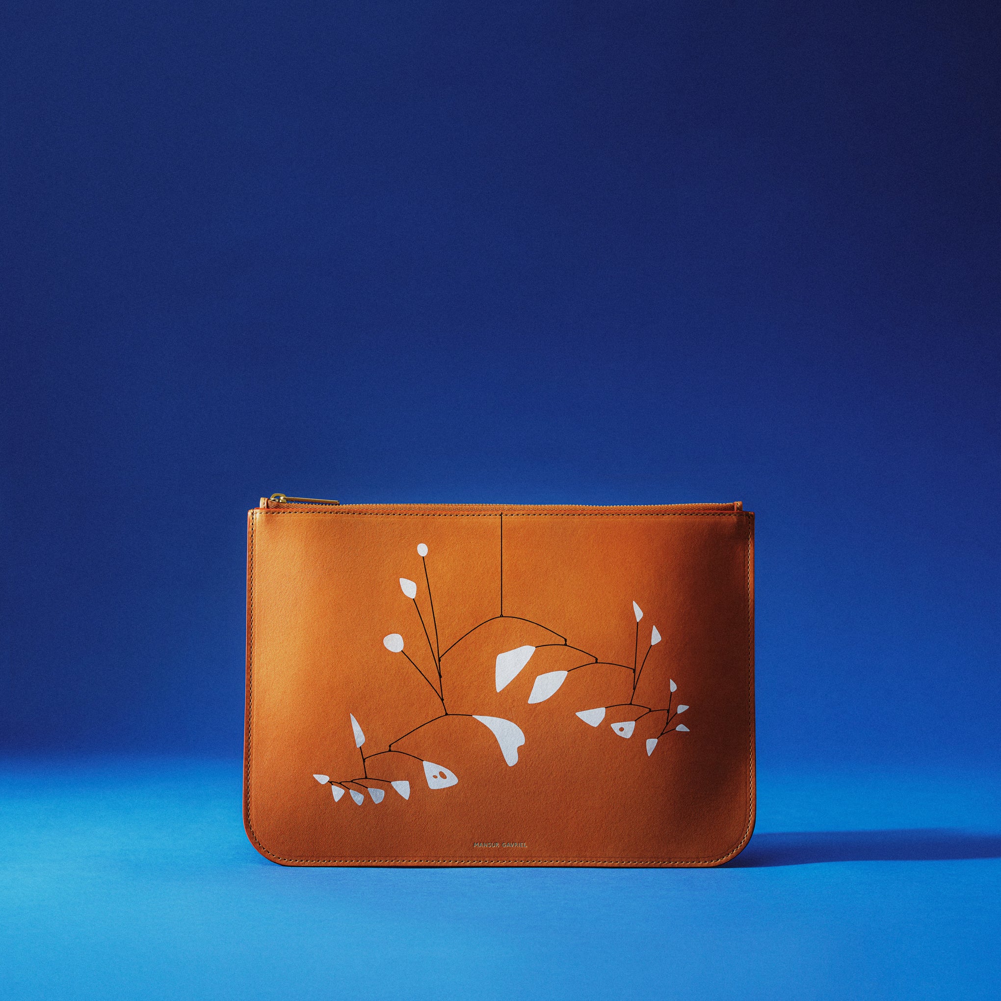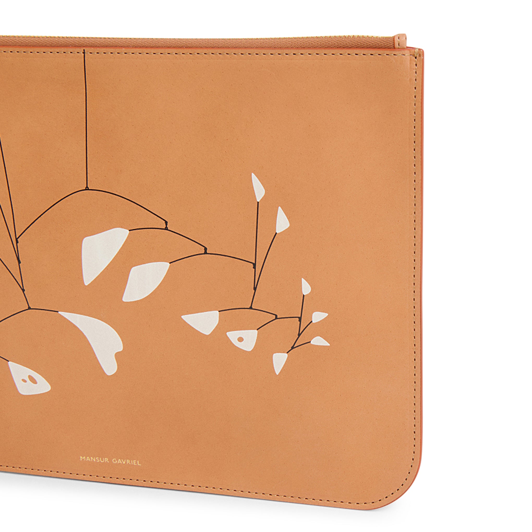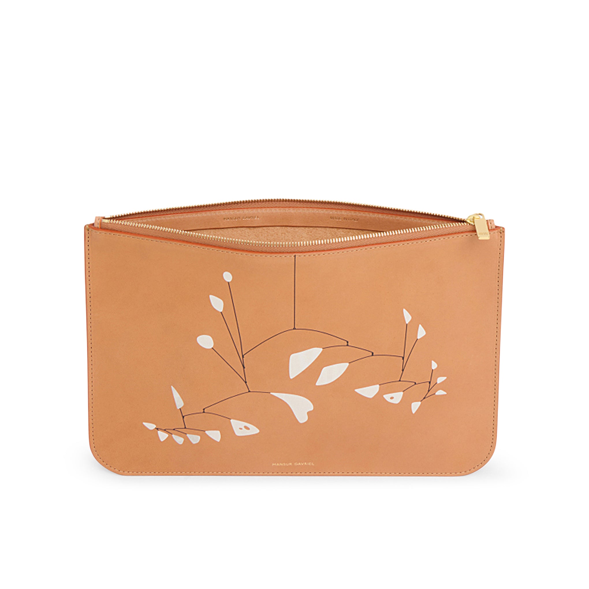 Crafted in Italy from Italian vegetable-tanned leather. this limited edition pouch from Mansur Gavriel features a print based on 21 feuilles blanches (1953). a mobile by Alexander Calder. an artist with work in MoMA’s collection. This pouch. from NYC-based brand Mansur Gavriel. is a chic way to carry small essentials. The pouch’s leather will develop a rich patina over time. The Alexander Calder Everyday Pouch measures 8.3h x 11.7w.