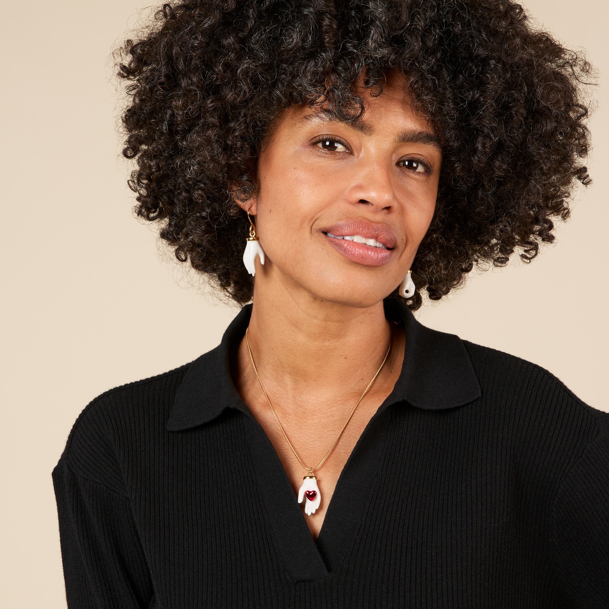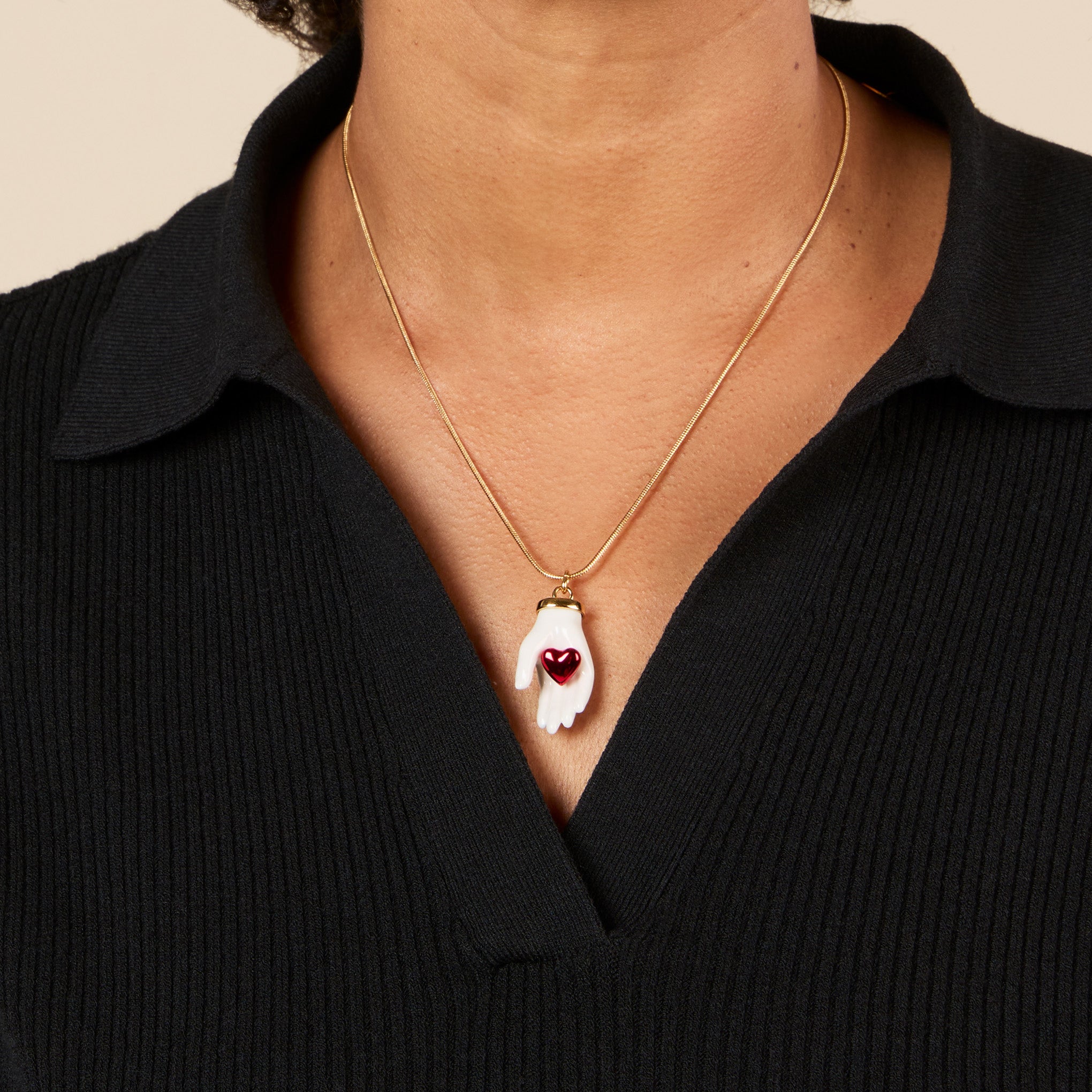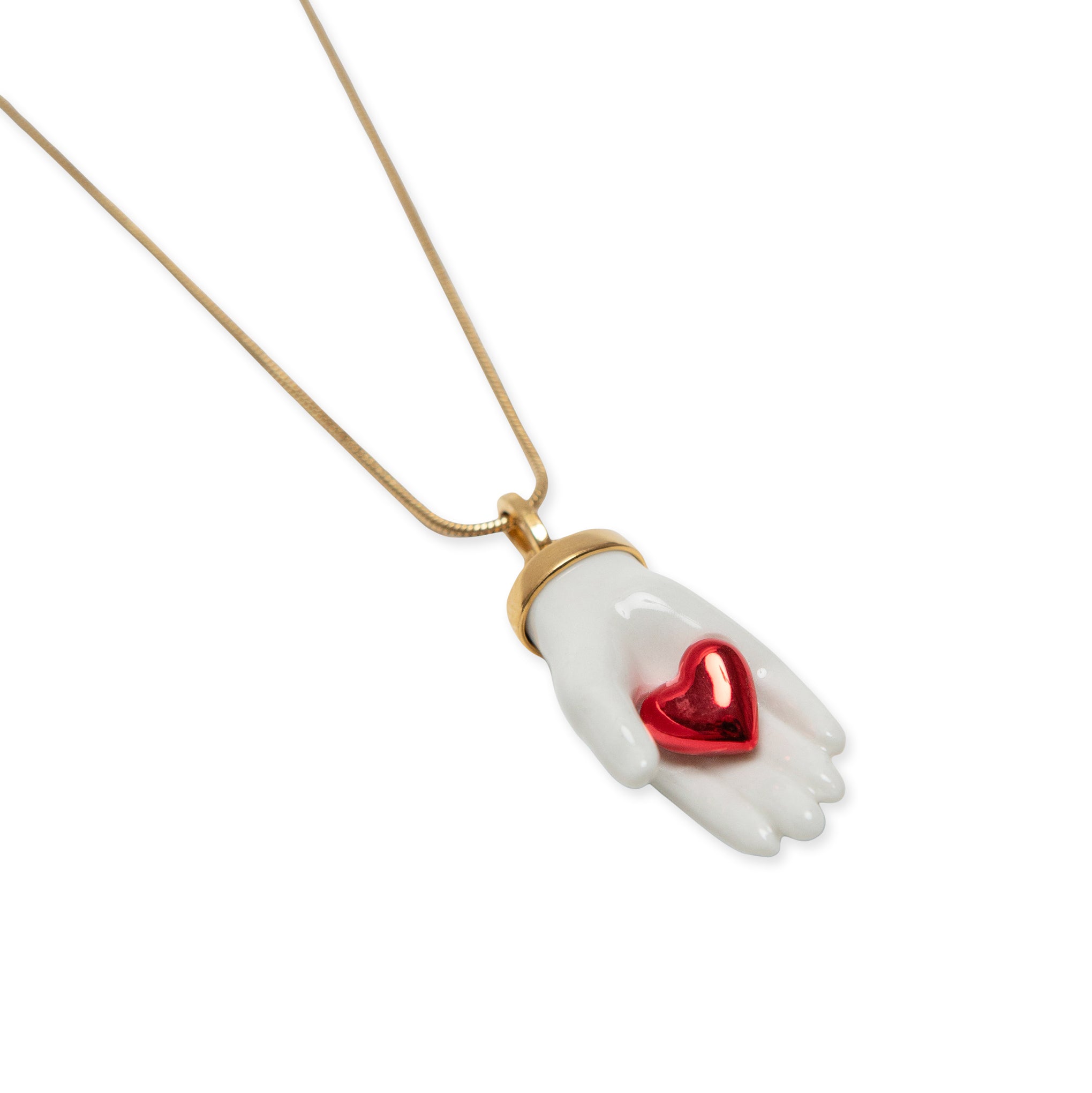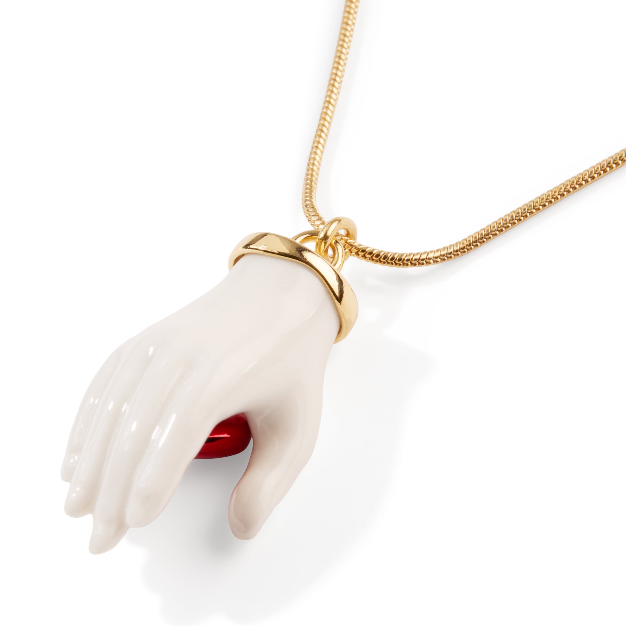 Hands??which we use to communicate. sense. measure. and interact with the material worlds??were explored in Hand Signals: Digits. Fists. and Talons. a 2013 exhibition of 20th-century posters and ephemera from the Museum’s collection. Artists and designers have focused on this body part to represent a gamut of emotions. The Andr??s Gallardo Little Hand & Heart Necklace is a small gesture full of poetry. It features a porcelain hand holding a red enameled metal heart. hanging from 18k gold-plated brass. Wear yours solo to add delicate decoration or with the matching earrings for extra impact. Andr??s Gallardo and Marina Casal formed their Madrid-based brand in 2010 when they started making jewelry out of porcelain found at flea markets and antique shops??today they work with artisans in Spain and Portugal who use traditional techniques to handcraft each piece. With an extender chain. the Andr??s Gallardo Little Hand & Heart Gold-Plated Necklace 17 inches at shortest length and 19 inches at longest length. with a pendant measuring 1.14l x 0.59w x 0.51d.