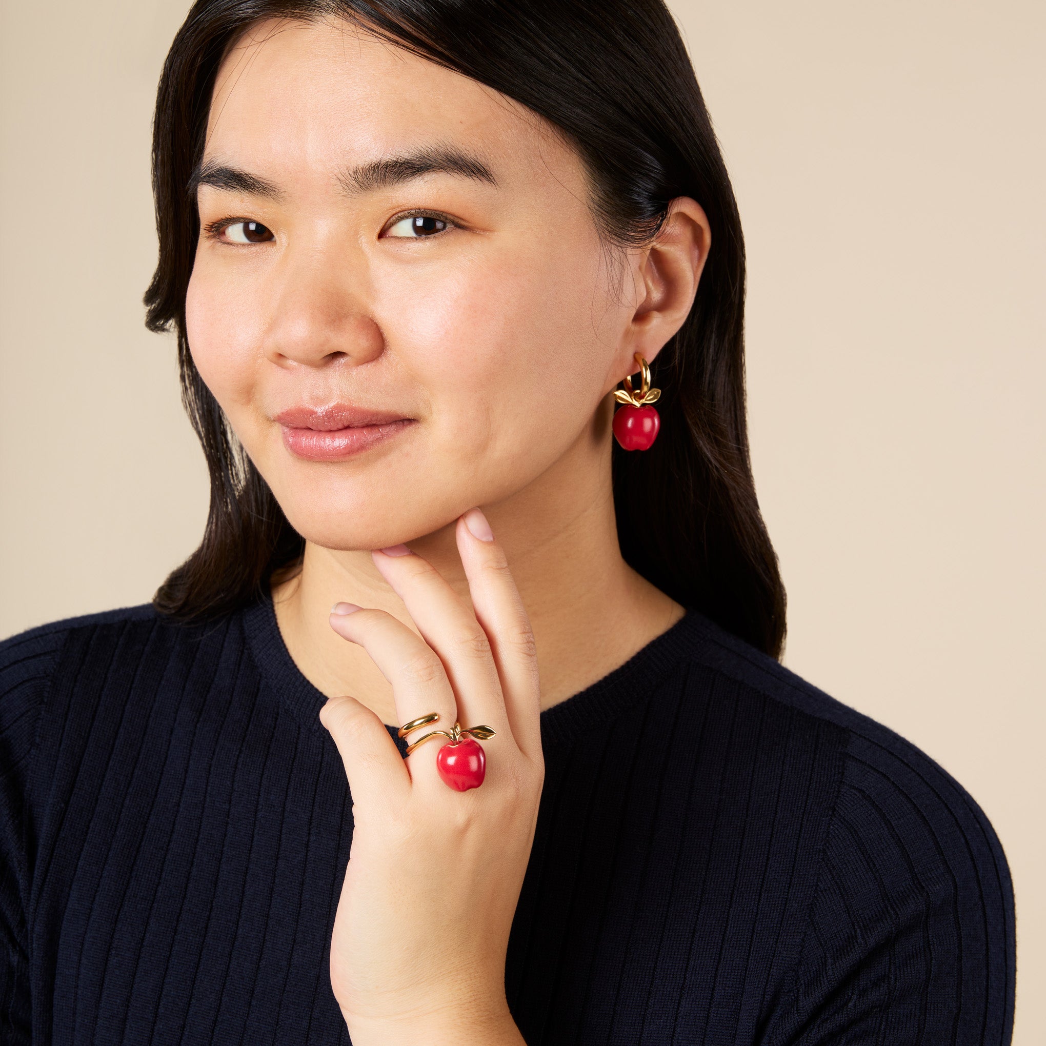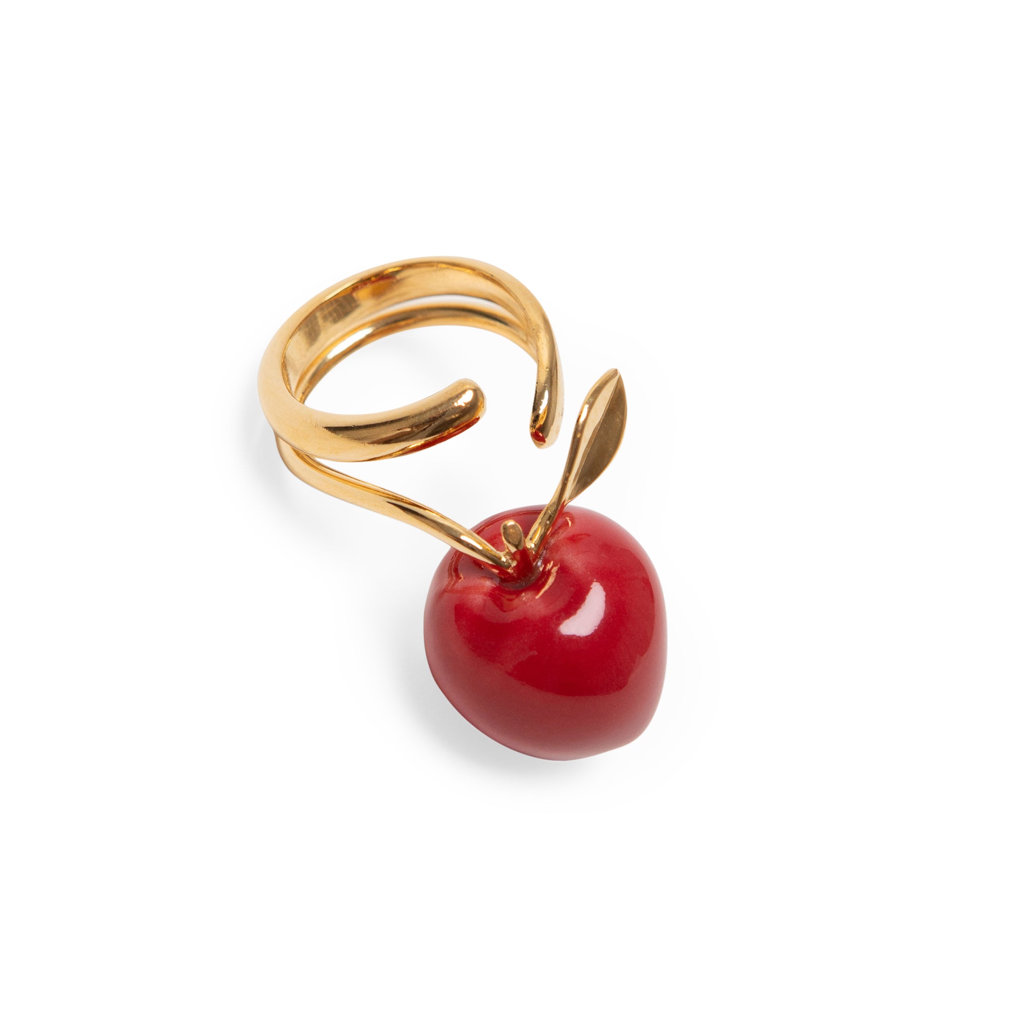 Many MoMA artists. from Claes Oldenburg to Ren?? Magritte. have been inspired by the apple. a universal symbol of both knowledge and temptation. This Andr??s Gallardo Apple Ring interprets the shiny fruit in red porcelain with an 18k gold-plated brass leaf and a stem that wraps around your finger. Andr??s Gallardo and Marina Casal formed their Madrid-based brand in 2010 when they started making jewelry out of porcelain found at flea markets and antique shops??today each piece is handcrafted in Spain. using porcelain from a family-run company in Portugal. Wear yours solo for a simple statement or add the coordinating necklace and earrings for extra impact. The Andr??s Gallardo Red Apple Gold-Plated Ring is available in size 7 and measures: inner ring diameter: 17mm. apple: 0.80l x 0.63w x 0.55d.?