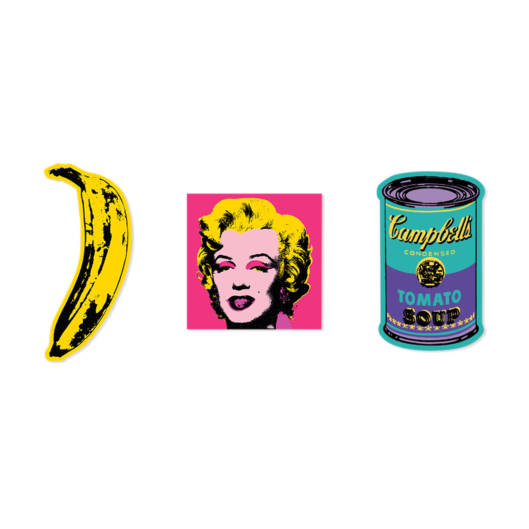 This set of three premium vinyl Apply Stickers are inspired by Andy Warhol’s silkscreen art from the 1960s. They’re a fun way to decorate your laptop. smartphone. workspace. suitcase and more.