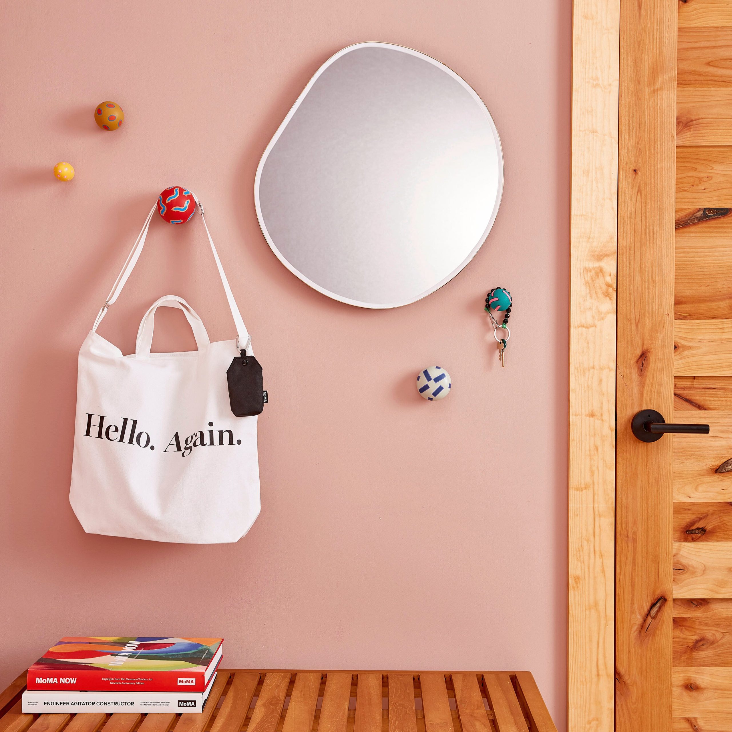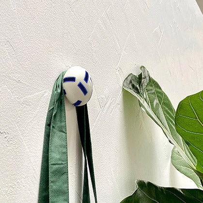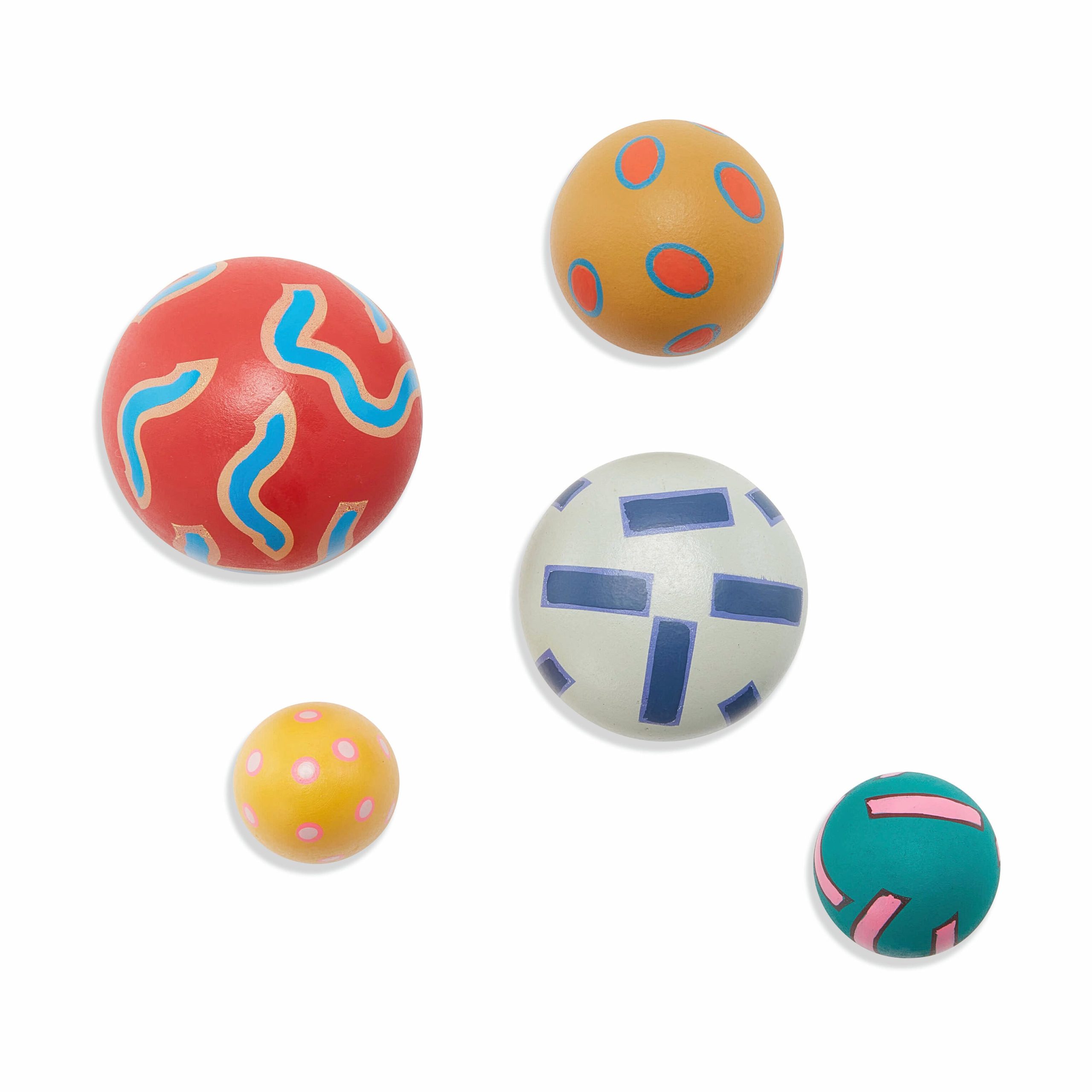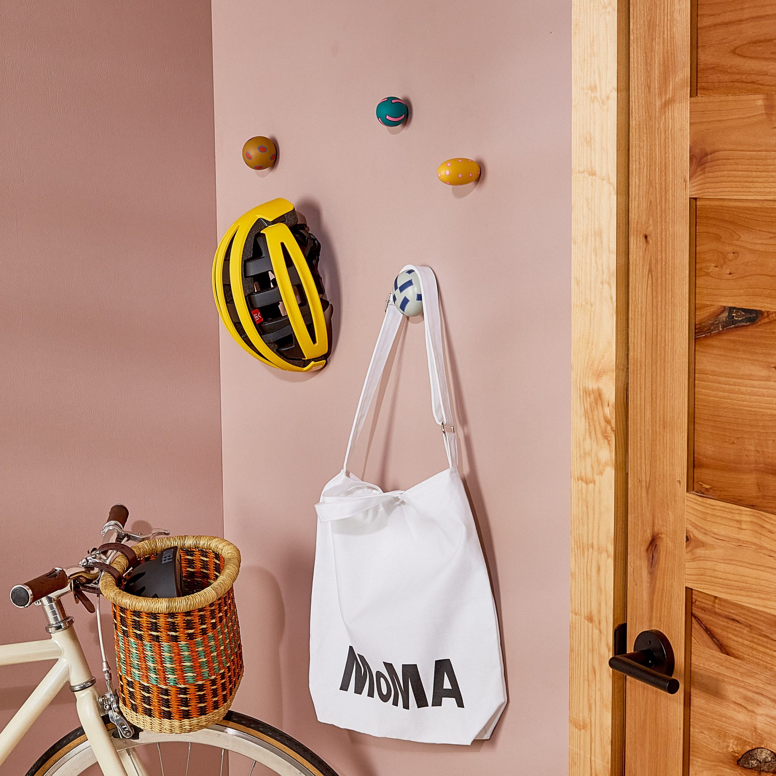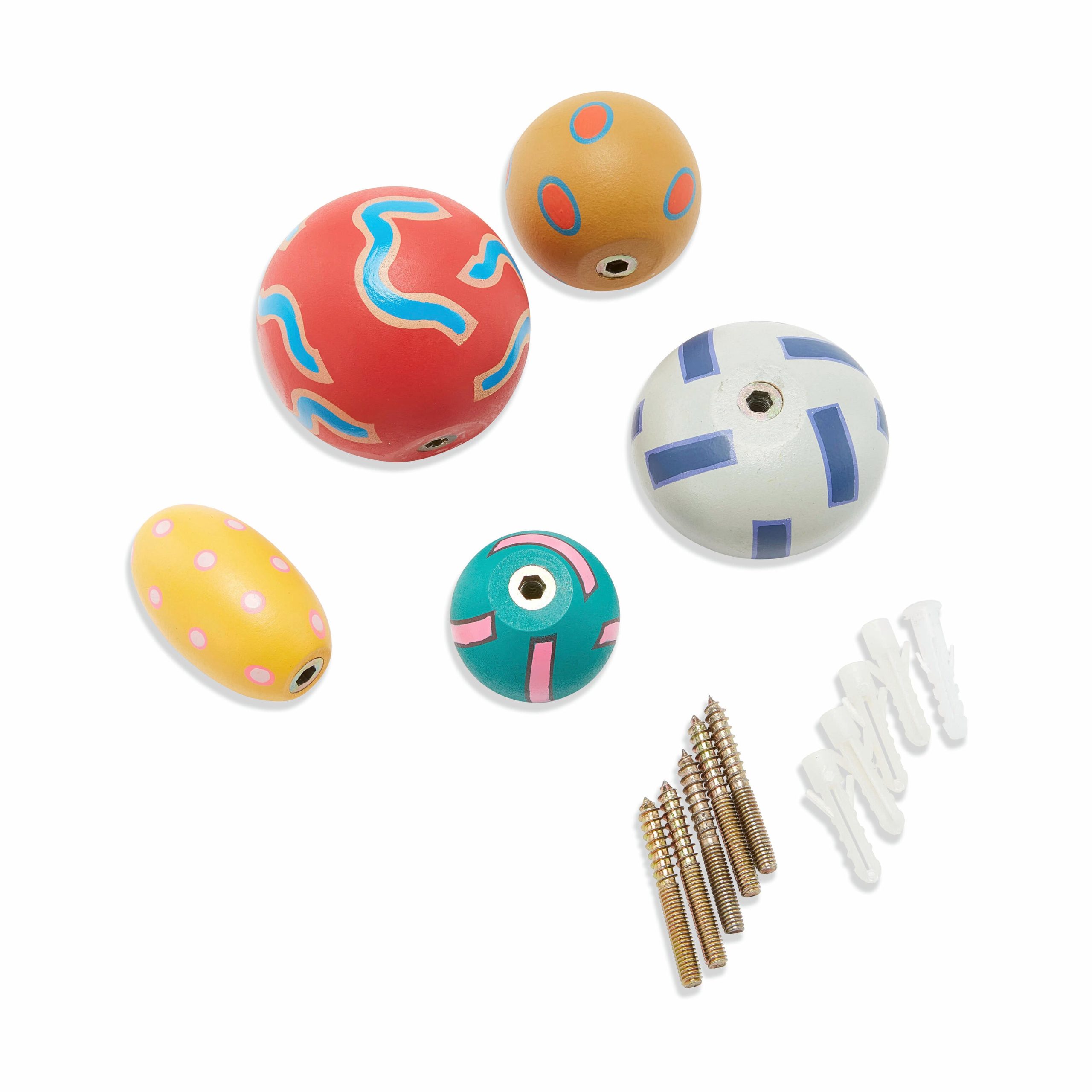 Here’s a fun solution for hanging masks. sweaters. jewelry and other accessories so you can keep things neat and tidy in your home. This set of five Chiaozza Wall Hooks consists of painted wood knob-shaped hooks with arty. whimsical patterns. They were designed for Areaware by Brooklyn-based artist couple Terri Chiao and Adam Frezza. Each Chiaozza Wall Hook is a different size. measuring from 1.75 to 3diam. Mounting hardware included.