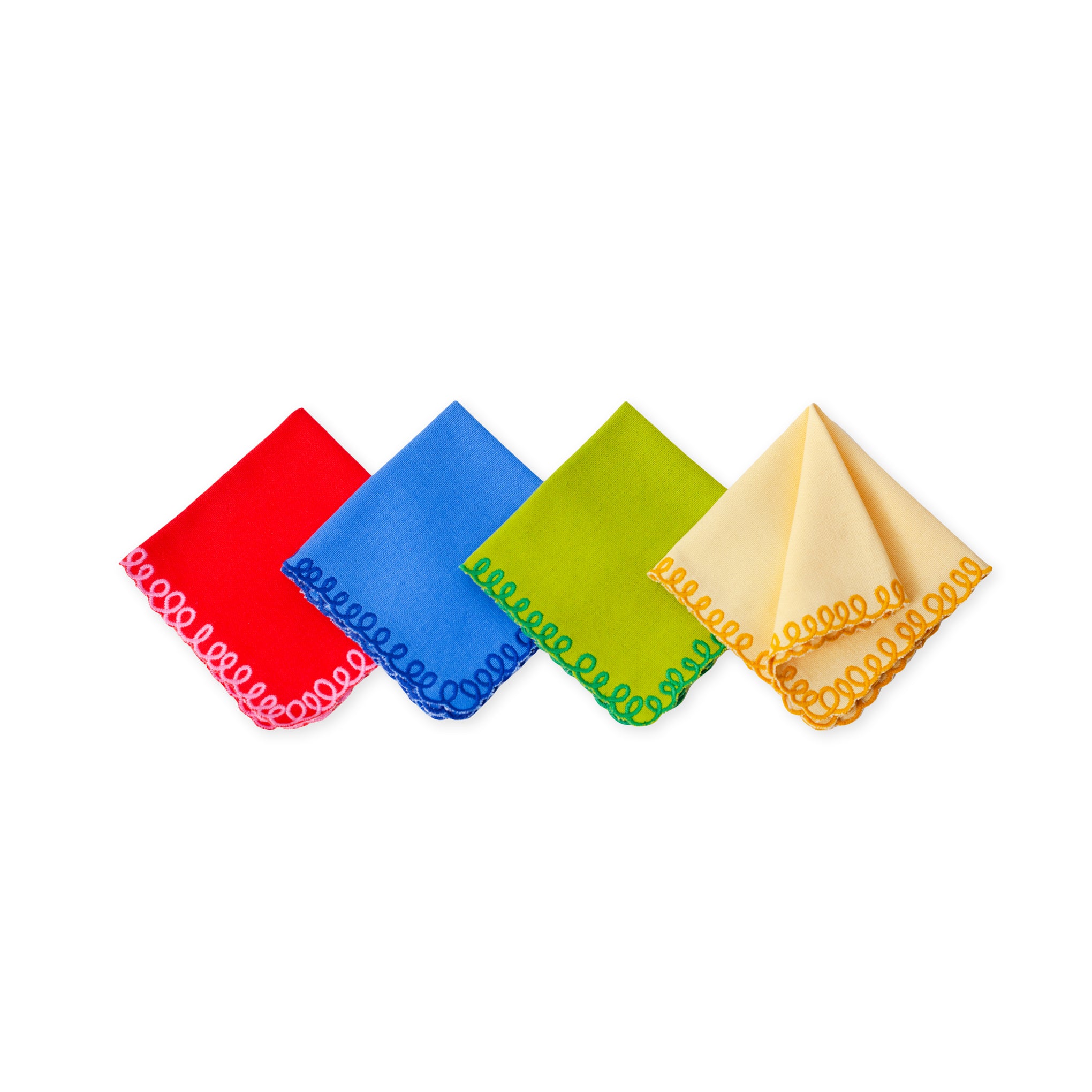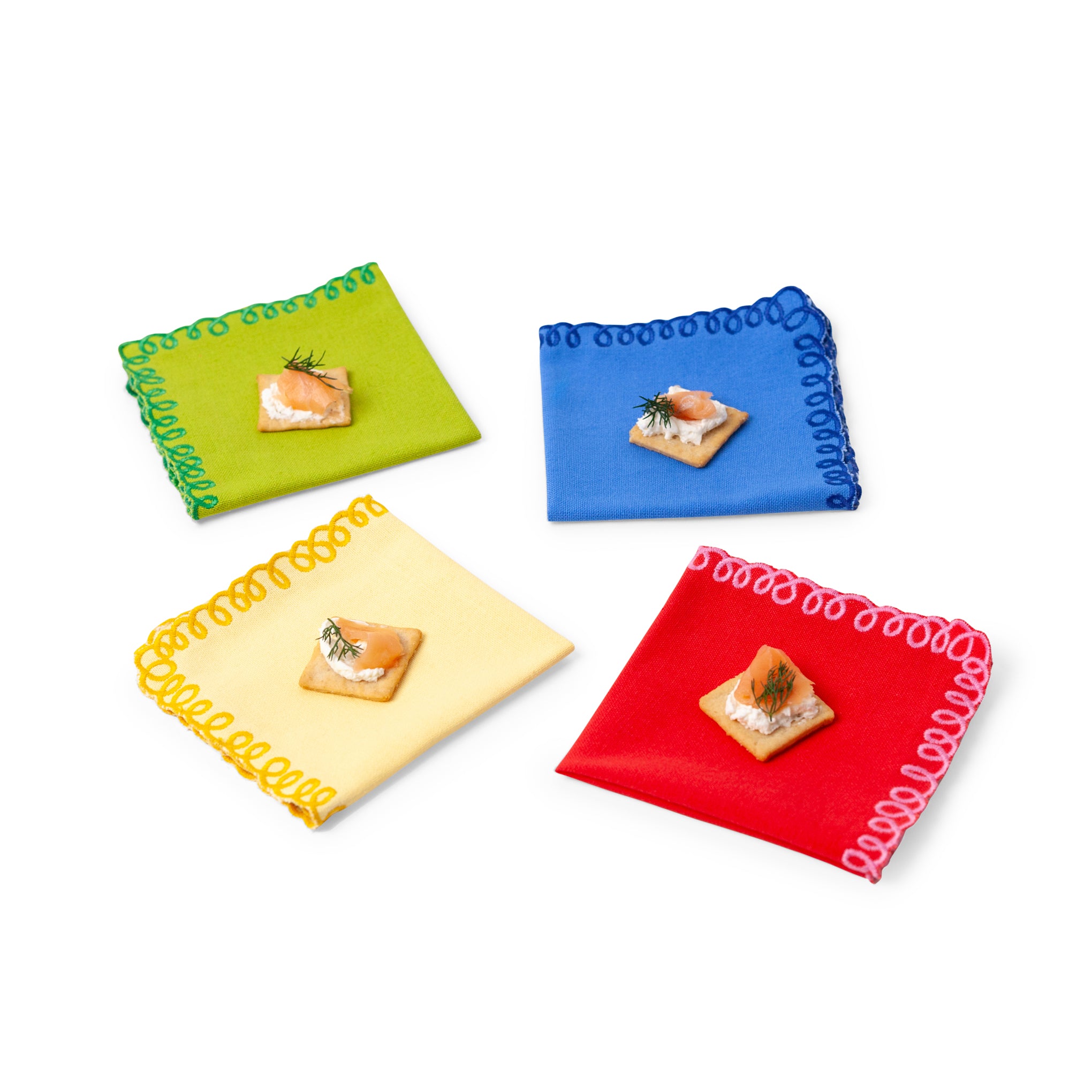 MoMA Exclusive: Serve up a dash of whimsy with your guests’ beverages with this set of four Doodle Lace Cotton Cocktail Napkins. Each one features its border stitched with a curlicue design in a tonal color. The set includes napkins in blue. spring green. pale yellow and red and each one measures 9sq. The Doodle Lace Cotton Cocktail Napkins are double-sided and should be machine washed cold. Do not use bleach. Hang to dry. Use low-medium heat iron to press.