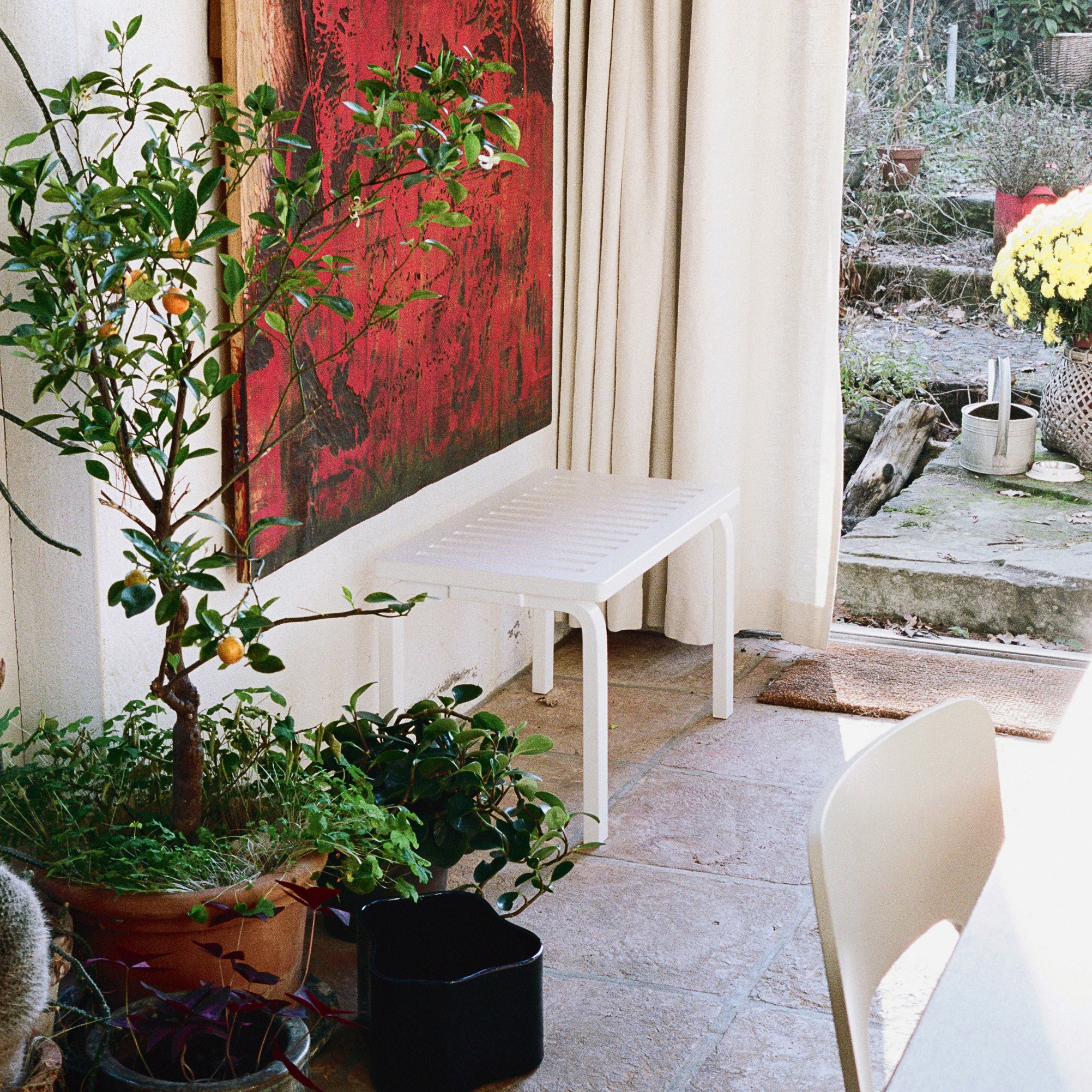 Lightweight and versatile. the Bench 153 can live in many areas throughout your home. Designed in 1945 by Alvar Aalto. the sold birch wood bench features vertical recesses in its seat which adds lightness to the design so it can be moved easily from room to room. The legs of the bench employ Aalto’s famed L-leg innovation. a process that involves making slits in the wood. and inserting and gluing wood veneer strips. The Bench 153 can be used as seating or as an attractive way to display items such books. plants. folded blankets or decorative objects. or as a place to store shoes in an entrance hallway or porch. Made in Finland by Artek. the Bench 153 measures 17.5h x 44.25l x 15.75d. Some assembly required. Both Alvar Aalto and Artek are represented in MoMA’s collection.
