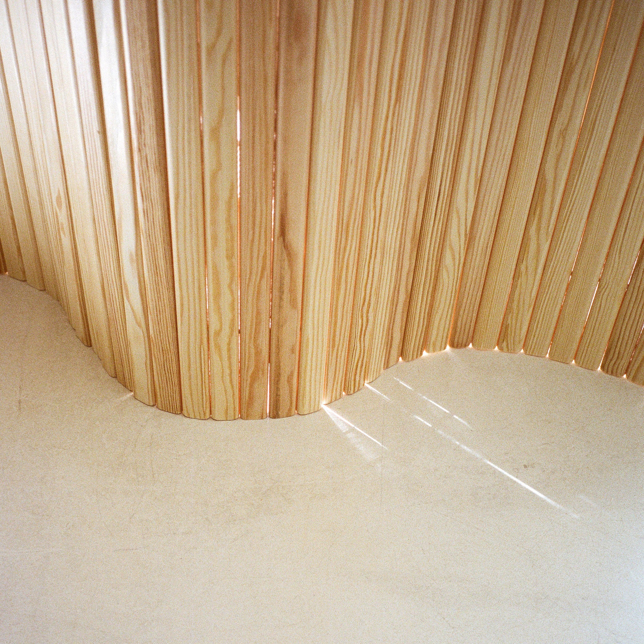 Elegant and flexible. this screen is constructed from fine solid pine wood strips that have been vertically aligned. so that it can be easily rolled up for storage or unfurled to create straight or fluid curves. Designed in 1936 by Alvar Aalto. Screen 100 can be used to divide rooms or section off areas. It’s substantial height (59) will add structure to a space without obscuring vision. It can easily be moved around as needed. thanks to its lightweight construction and balanced proportions. Made in Finland. Screen 100 brings the warmth of wood to any space in which it’s placed. It measures 59h x 78.75w and some assembly is required. Both Alvar Aalto and the screen’s manufacturer. Artek. are represented in MoMA’s collection.