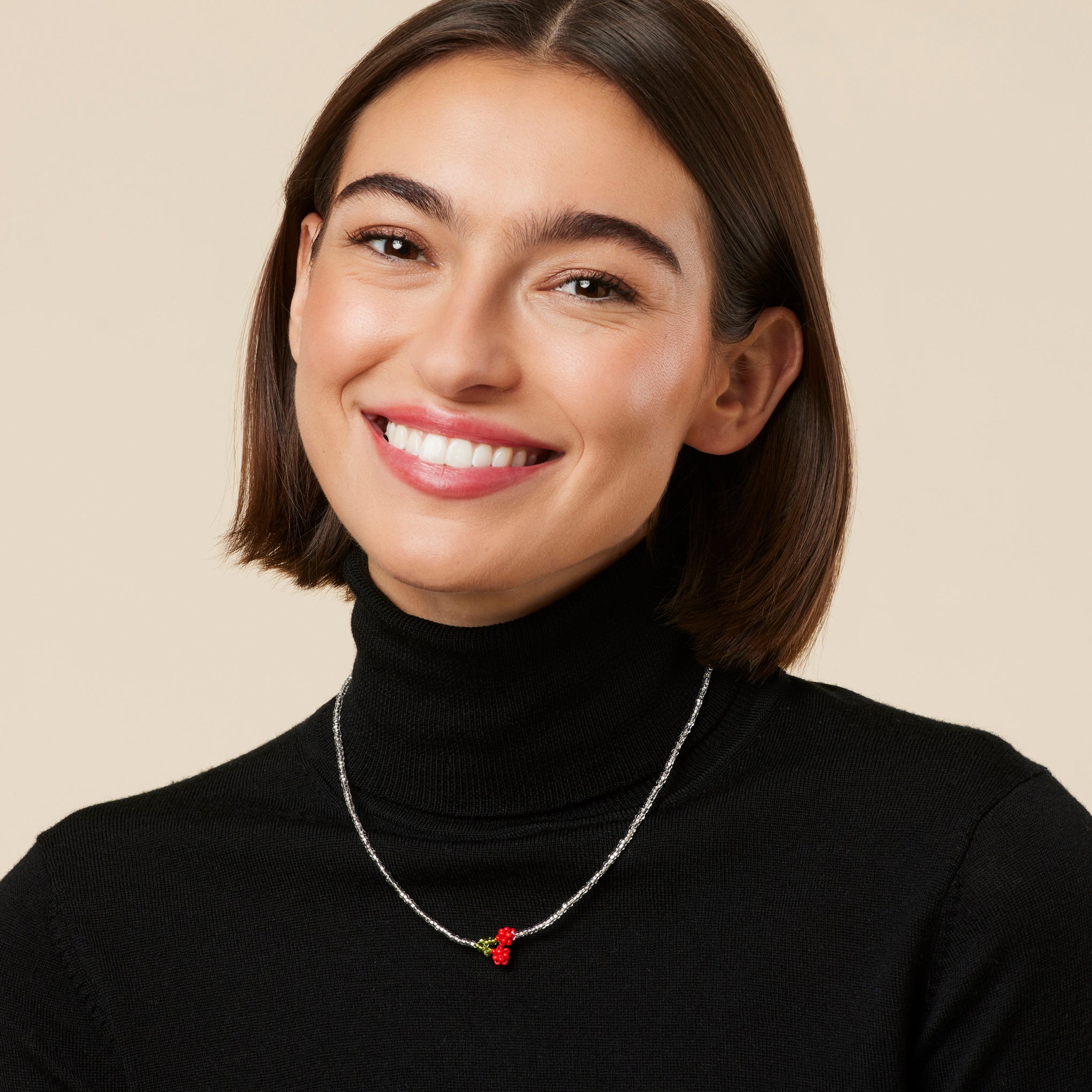This Beaded Mini Cherry Silver Necklace is sure to sweeten up your look as well as your day. Pura Utz is a Copenhagen-based brand founded by Anna Waller Andr??s and Bernabela Sapal?? in 2019 out of a passion for Mayan heritage. Handcrafted by women artisans in Guatemala. this subtle statement piece features a sterling silver lock closure and two mini cherries made from high-quality glass beads. Wear it solo or layer with other necklaces for extra impact. Want to have even more fun with your look? Add the coordinating earrings. The Beaded Mini Cherry Silver Necklace measures 17.5 long.