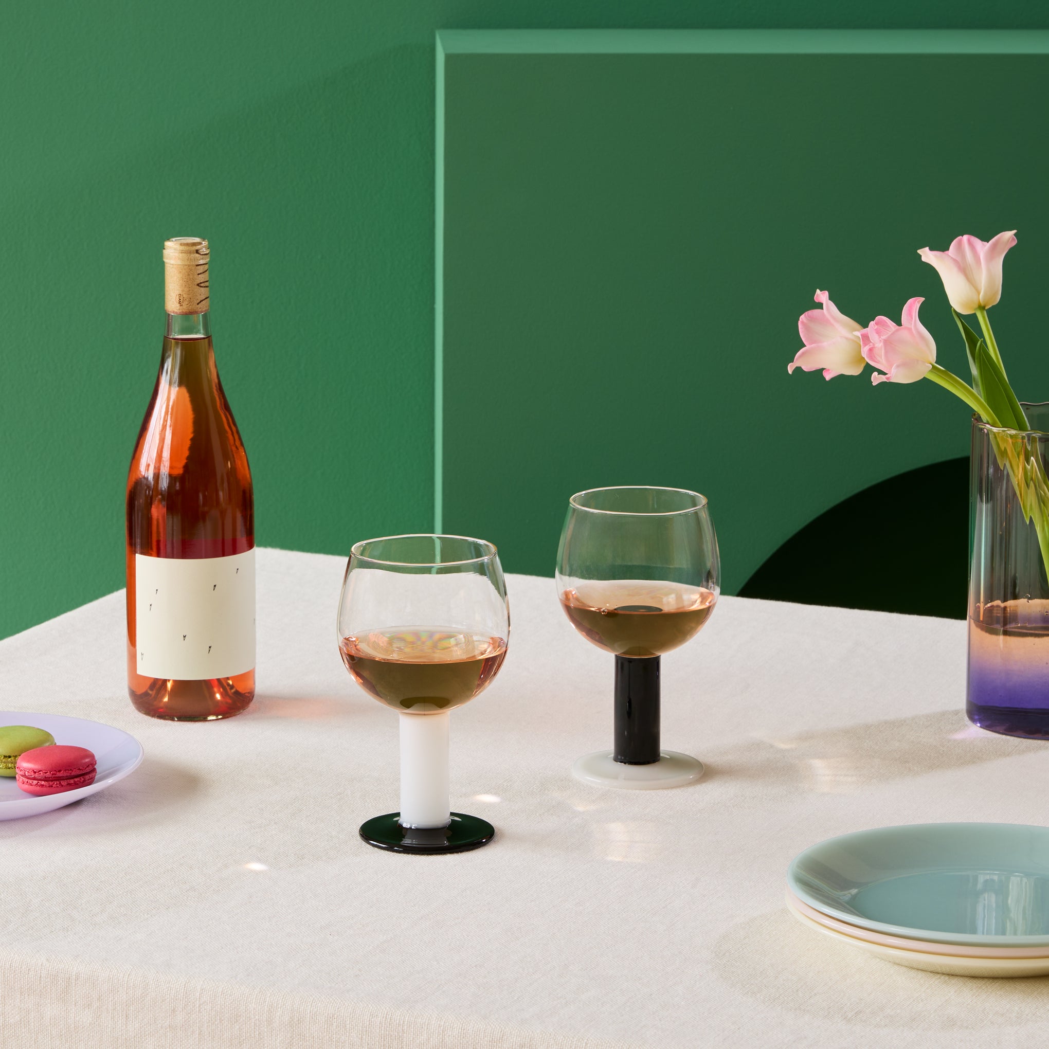 MoMA Exclusive: Originally designed in 2006 and now reintroduced. these glasses are bound to steal the spotlight at your next soirée. Created by Bodum. each glass showcases a playful blend of colorful bases and elegant glass vessels. perfectly marrying style and sustainability. Elevate your wine-tasting experience and impress your guests with these eye-catching and environmentally conscious wine glasses. Made from borosilicate glass. Dishwasher-safe. Sold as a pair. Measures 6.5h x 4diam. and holds 15oz.