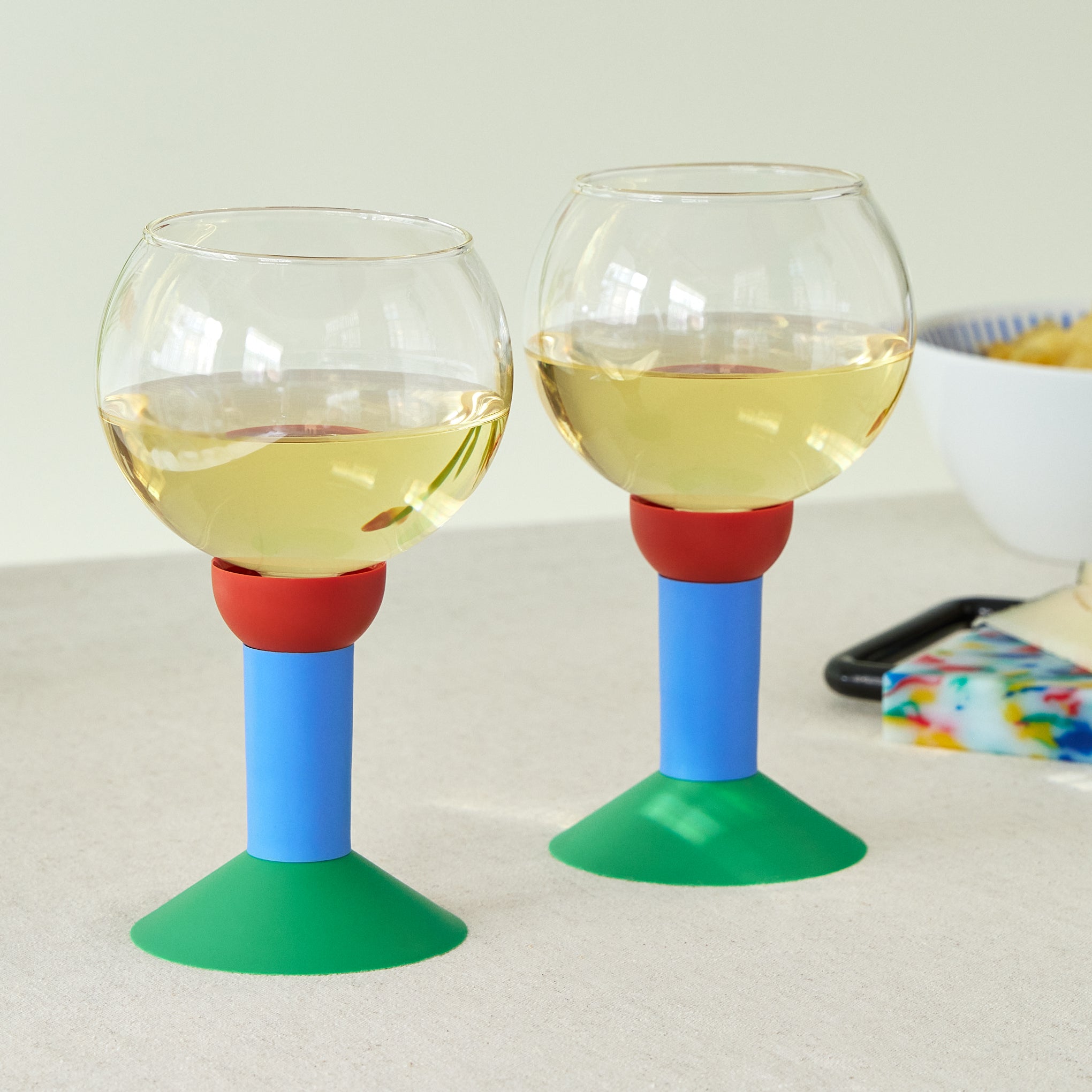 MoMA Exclusive: These reissued. postmodern glassware designs from 1983 are sure to garner attention at your next cocktail gathering or dinner party. Produced by Bodum. this set of two Oktett Wine Glasses feature chunky. colorful bases made from recycled plastic. with glass vessels.