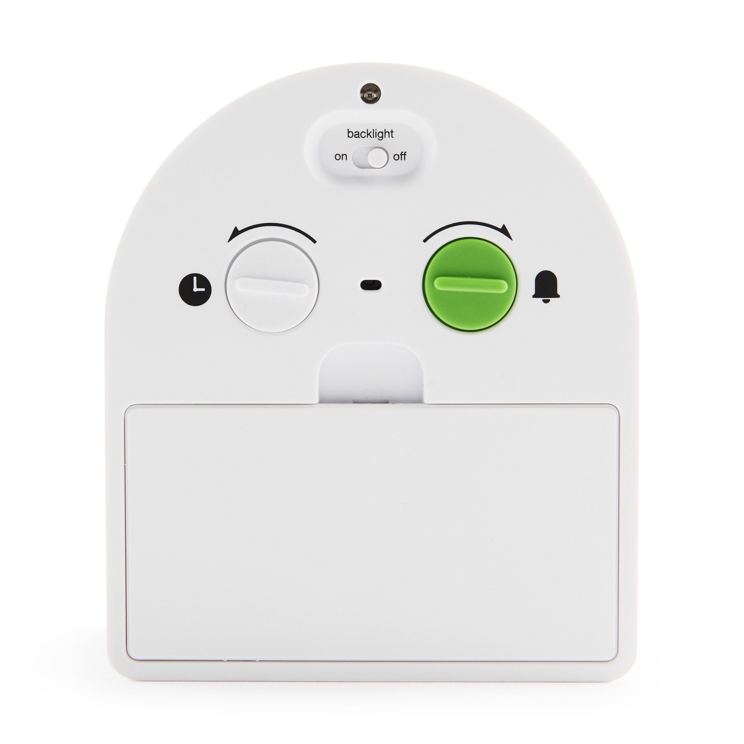 The small analog Braun BC22 Alarm Clock is made for easy display at home or when you travel. It features an on/off continuous backlight which gives off a soft. warm glow when the clock detects darkness. and goes off when the room is light. The contrasting hands are accented with luminous tips.