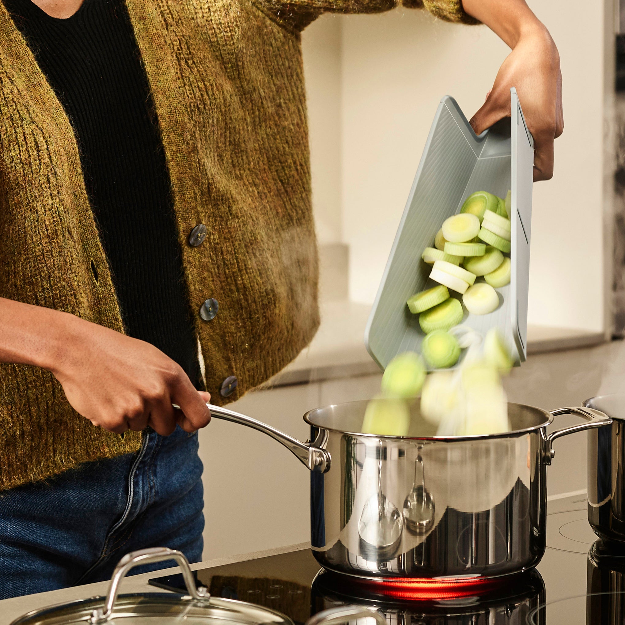 Say goodbye to messy kitchen counters with the Chop2Pot™ Folding Cutting Board. the ultimate culinary companion. Its innovative folding design allows for seamless food transfer. saving you time and effort. The textured cutting surface is gentle on your knives. while the soft-grip handle and non-slip feet ensure stability and precision. Available in vibrant Green and Pale Blue. this cutting board comes in two sizes to accommodate your needs. Get ready to chop. slice. and dice like a pro with this game-changing kitchen essential. Dishwasher-safe.