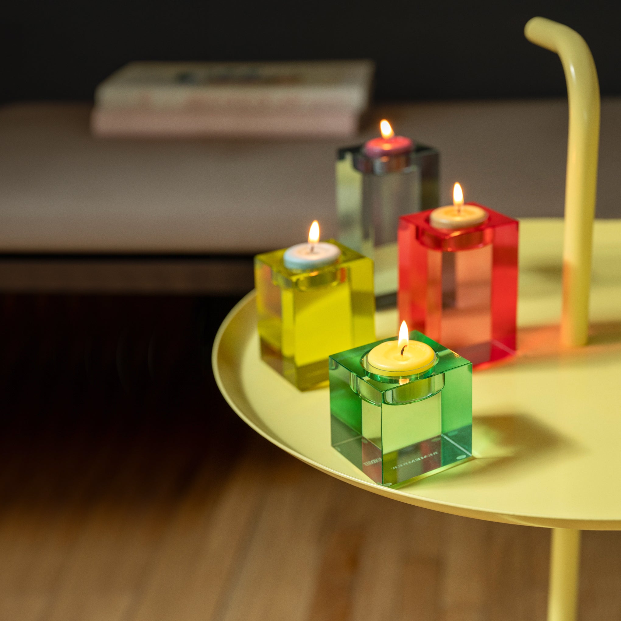 Crafted from translucent colored glass. this set of block-shaped candle holders will bring beautiful color reflections to your home. Each candle holder is a different height and color??green. yellow. red and smoke??and can be used with standard tea light candles (not included). The Color Block Candle Holders measure 2.5h x 2.25w2.25d. 3.25h x 2.3w x 2.3d. 4h x ?2.25w x 2.25d. 4.75h x 2.25w x 2.25d