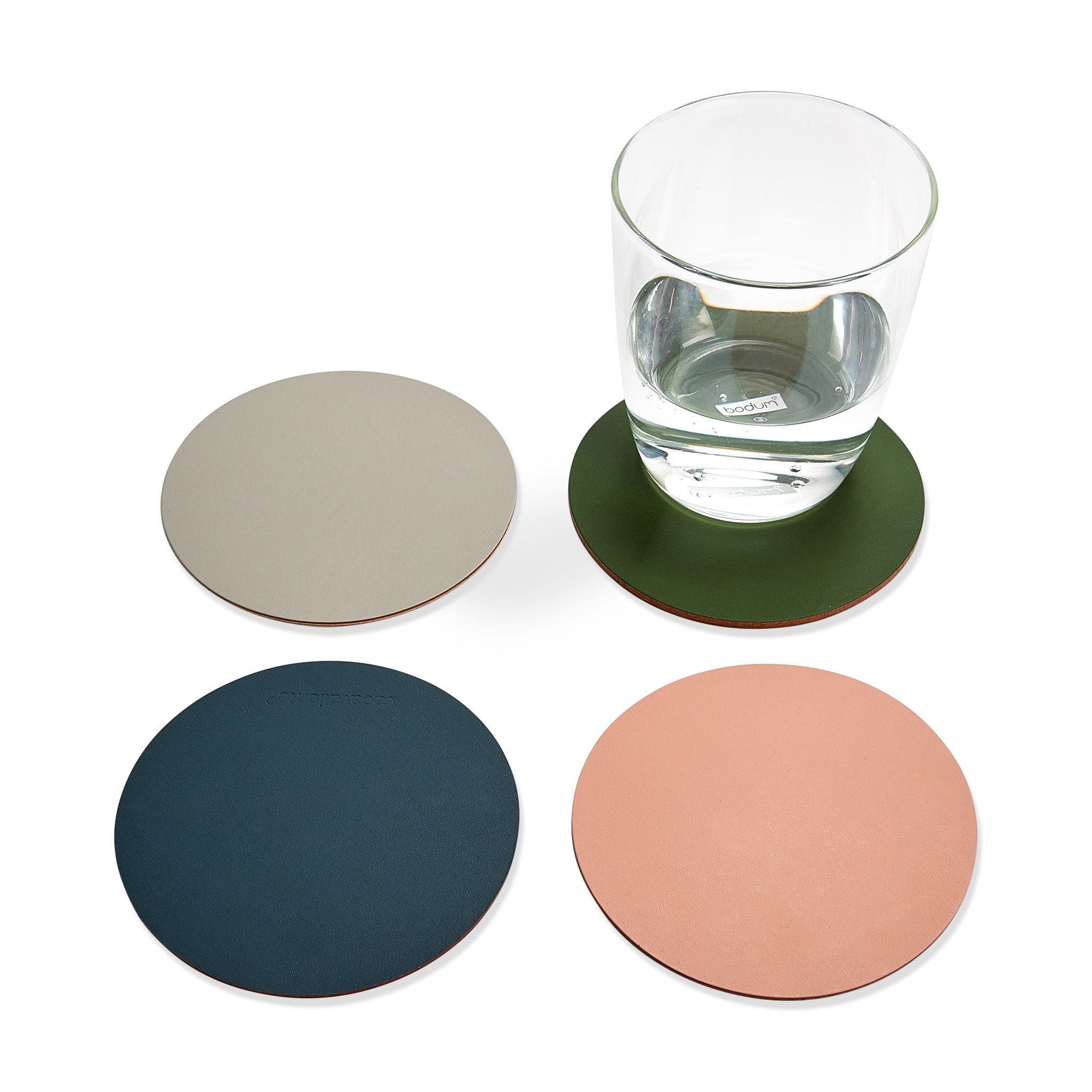 MoMA Exclusive: Protect your furniture during cocktail parties and coffee breaks with these eco-friendly designs. These reversible. Recycled Leather Coaster give a second life to off-cuts discarded by the leather industry. The reclaimed pieces are cleaned. compacted and bonded into an eco-friendly material. Each side of the Coasters has a contrasting color to give you twice the tabletop options. Coasters come in a mixed set of four (one of each color) in your choice of round (4.25diam.) or square (4 square).
