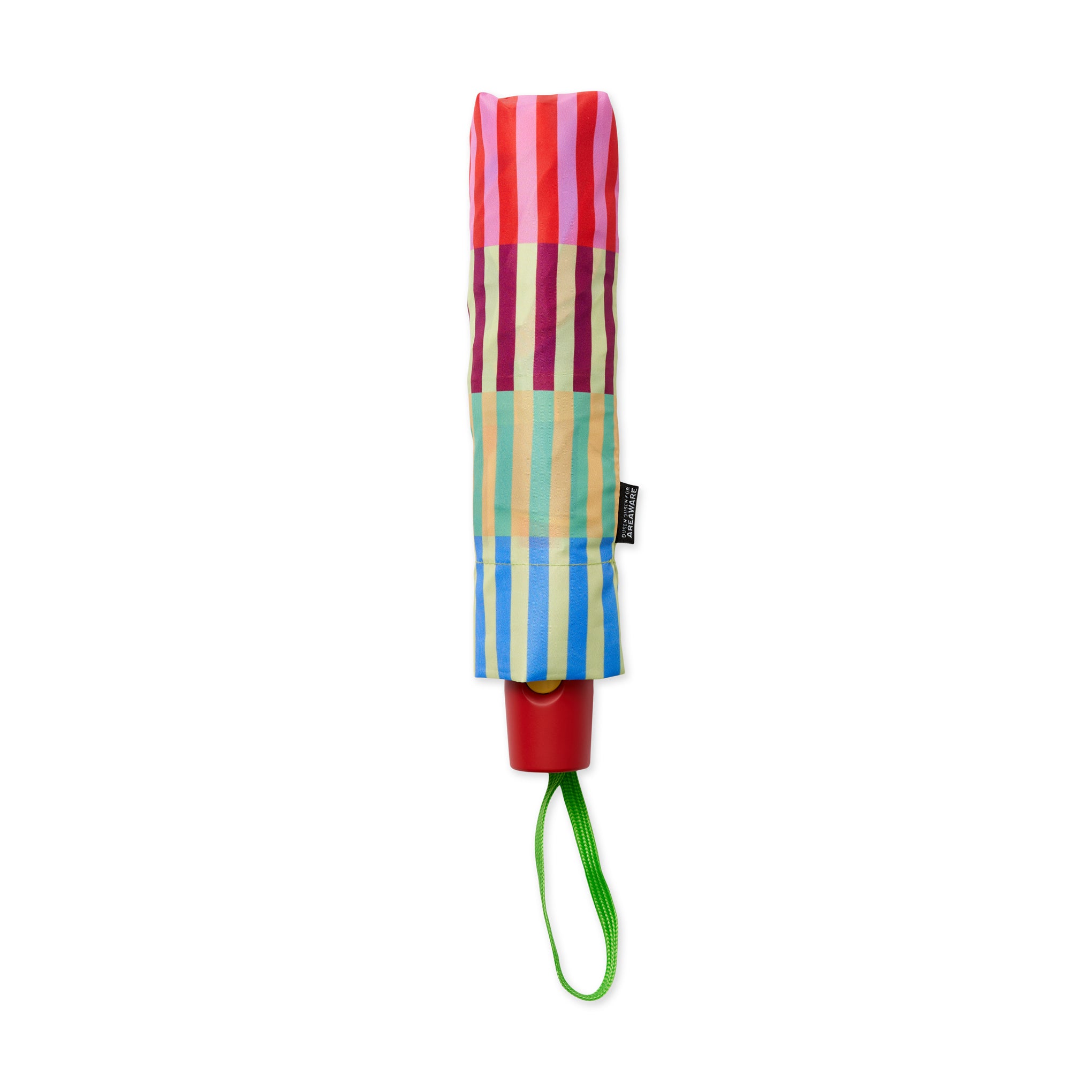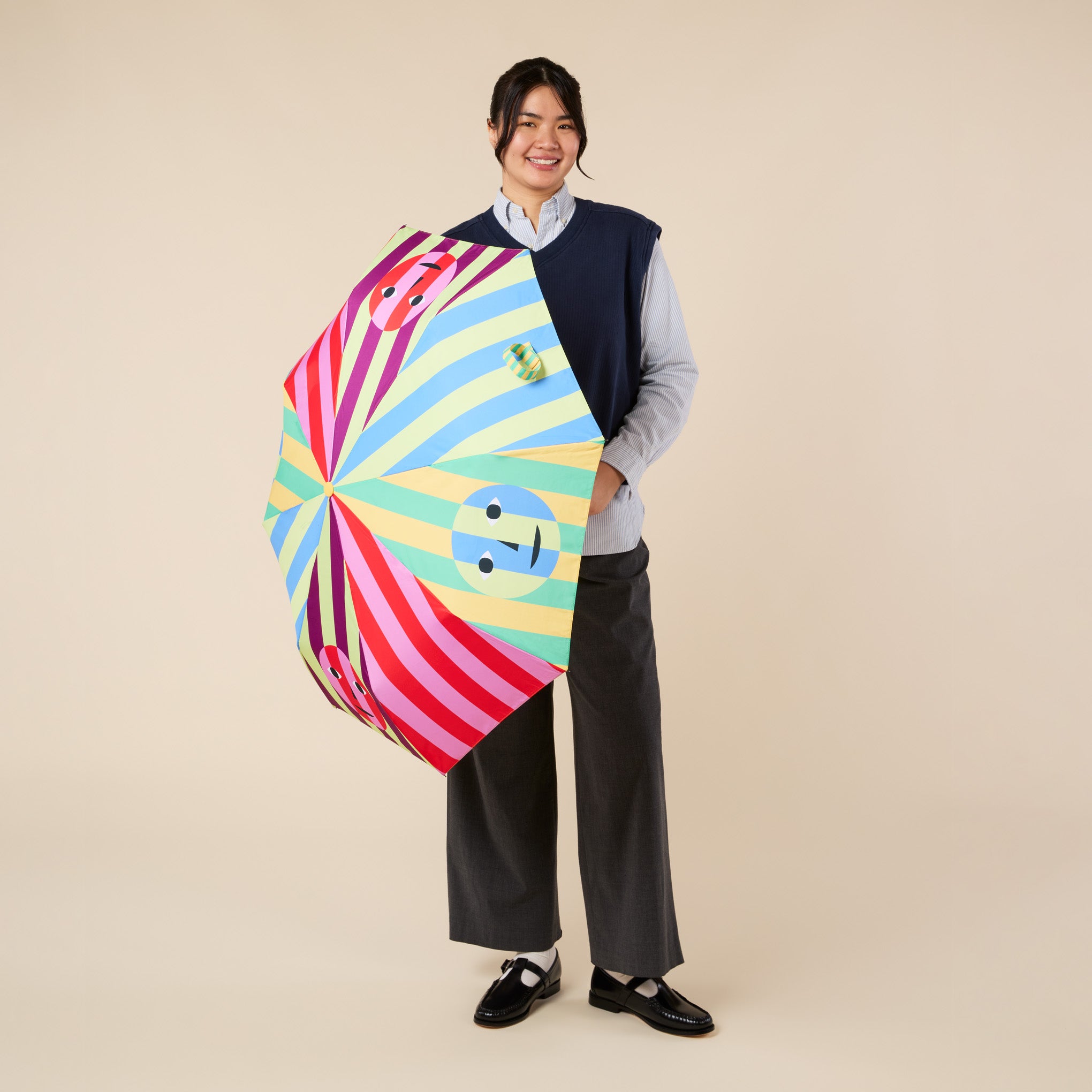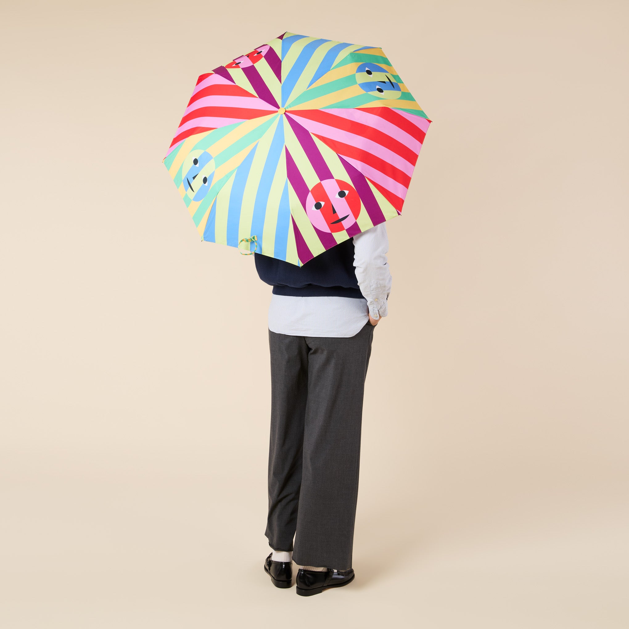 Designer Ellen Van Dusen brings her research into color theory with this vibrantly patterned multicolor umbrella. Featuring Dusen Dusen’s signature multicolor stripes and smiley faces. it also has a multicolor handle and wrist strap so you can make a maximalist statement on every rainy day. The Dusen Dusen Multicolor Umbrella opens and closes automatically with a button located on the handle and is made from metal. plastic and nylon. It measures 11l x 2w x 2d. 21diam. when open.