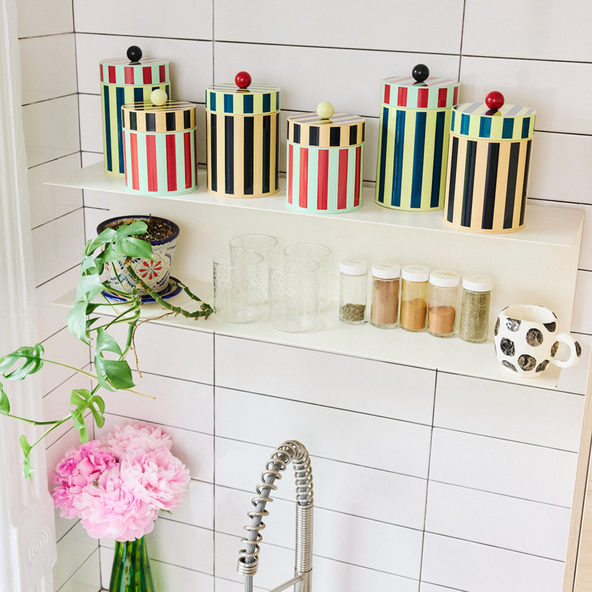 From Dusen Dusen. this is a metal storage canister you won’t want to hide in your kitchen cabinet. It features vivid colors and bold stripes and can be used to store all sorts of dry goods. from rice to beans to tea bags. The Dusen Dusen Striped Canister features a lid with a convenient ball on top for easy opening.