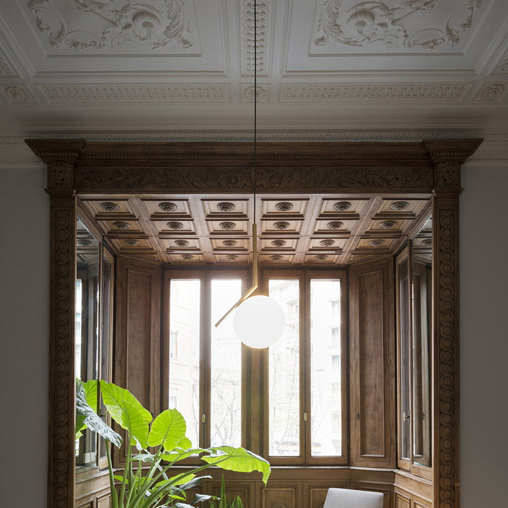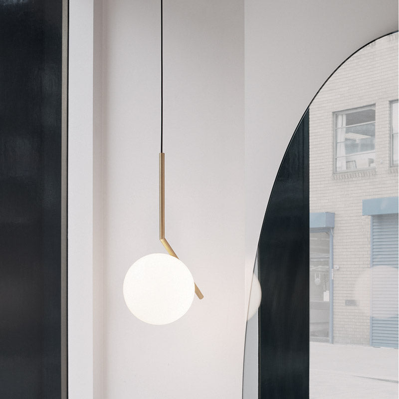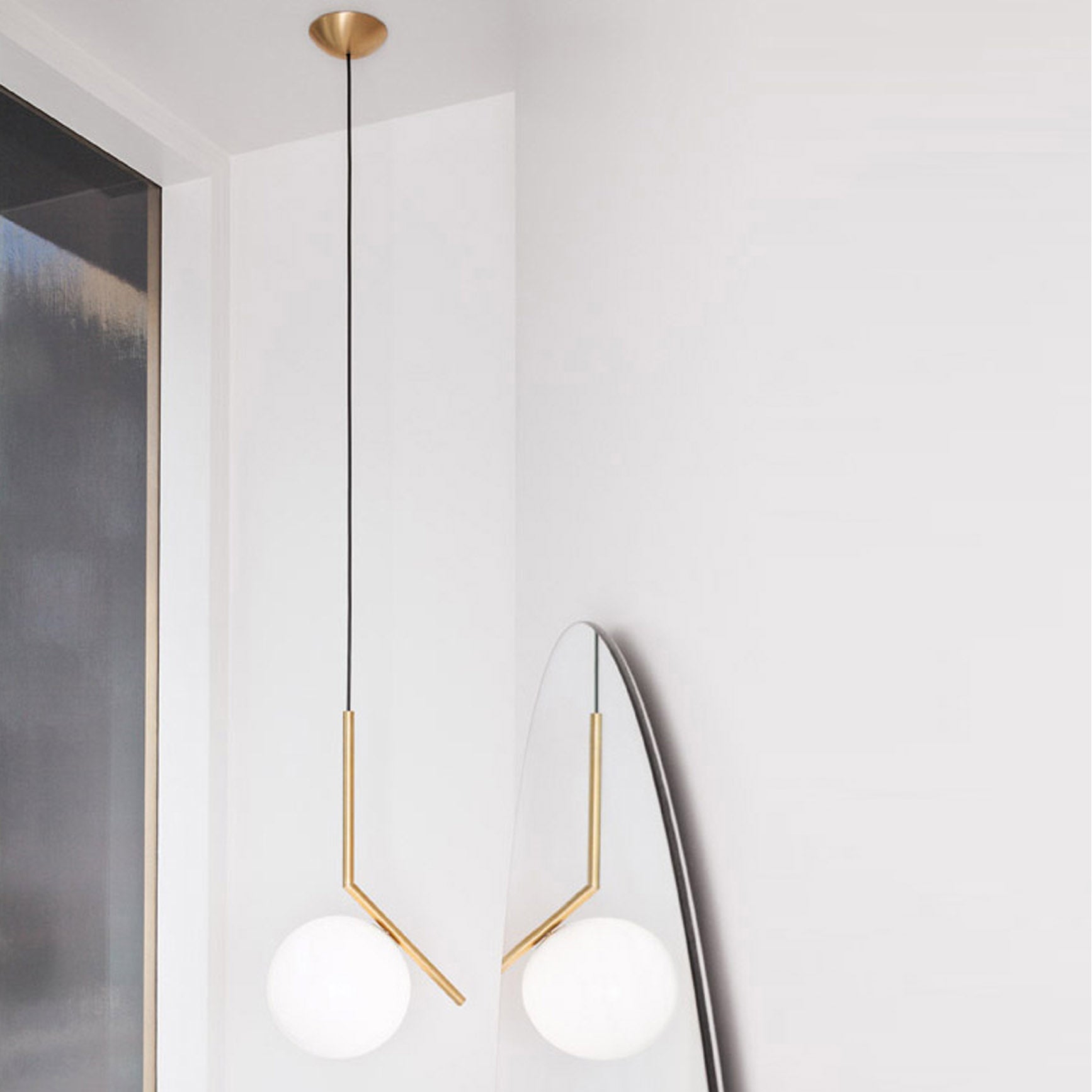 Michael Anastassiades’ love of industrial simplicity infuses this elegant pendant light. IC stands for Identity Code. part of the evaluation of immigrants to the UK. bringing a commanding contemporary dimension to the design. The blown opaline glass diffuser seems to float from an angled wand of brass-finished steel in a captivating aesthetic juggling act. It offers an evenly diffused glow suspended over a kitchen table or in an entryway. Installation required. Made in Italy. Both the designer and the manufacturer. Flos. are represented in MoMA’s collection. Designed by Michael Anastassiades for FLOS.