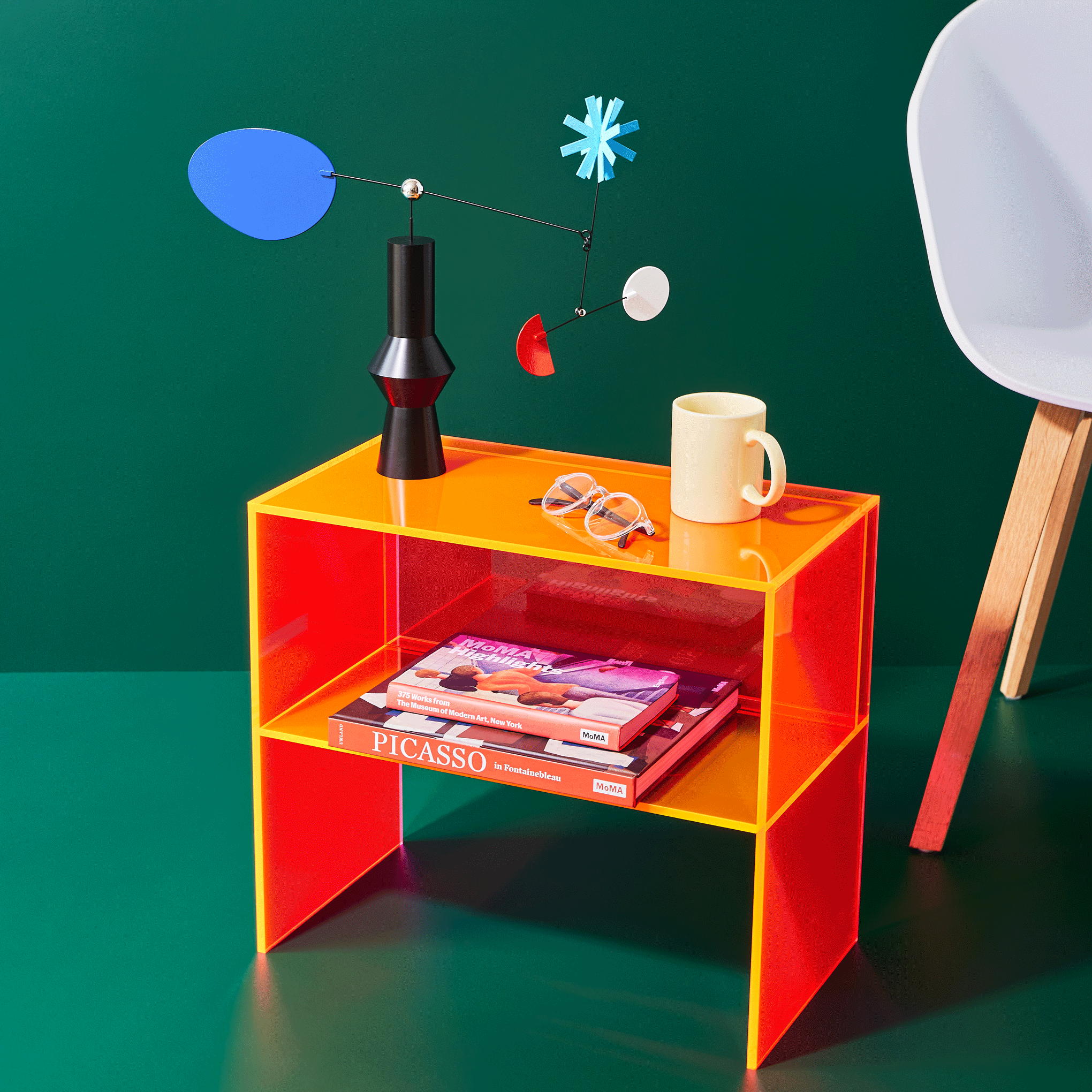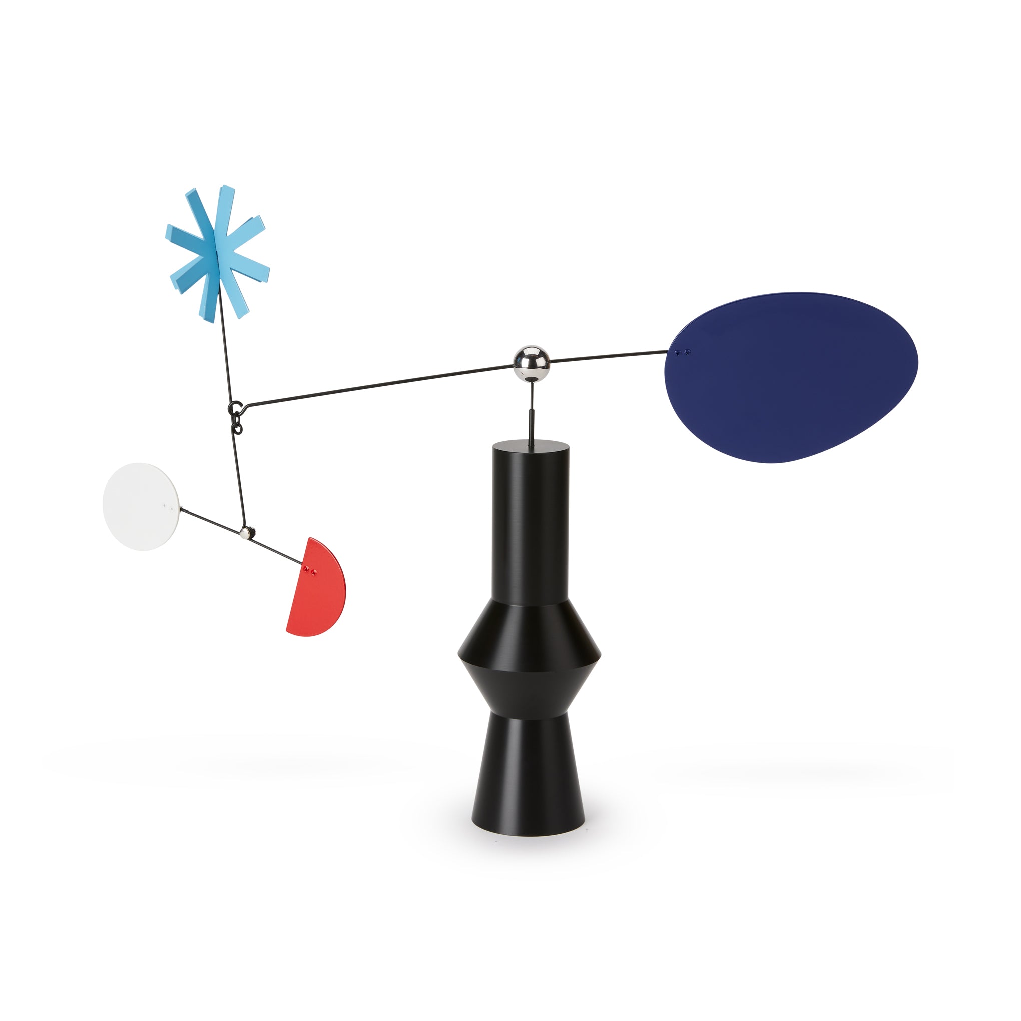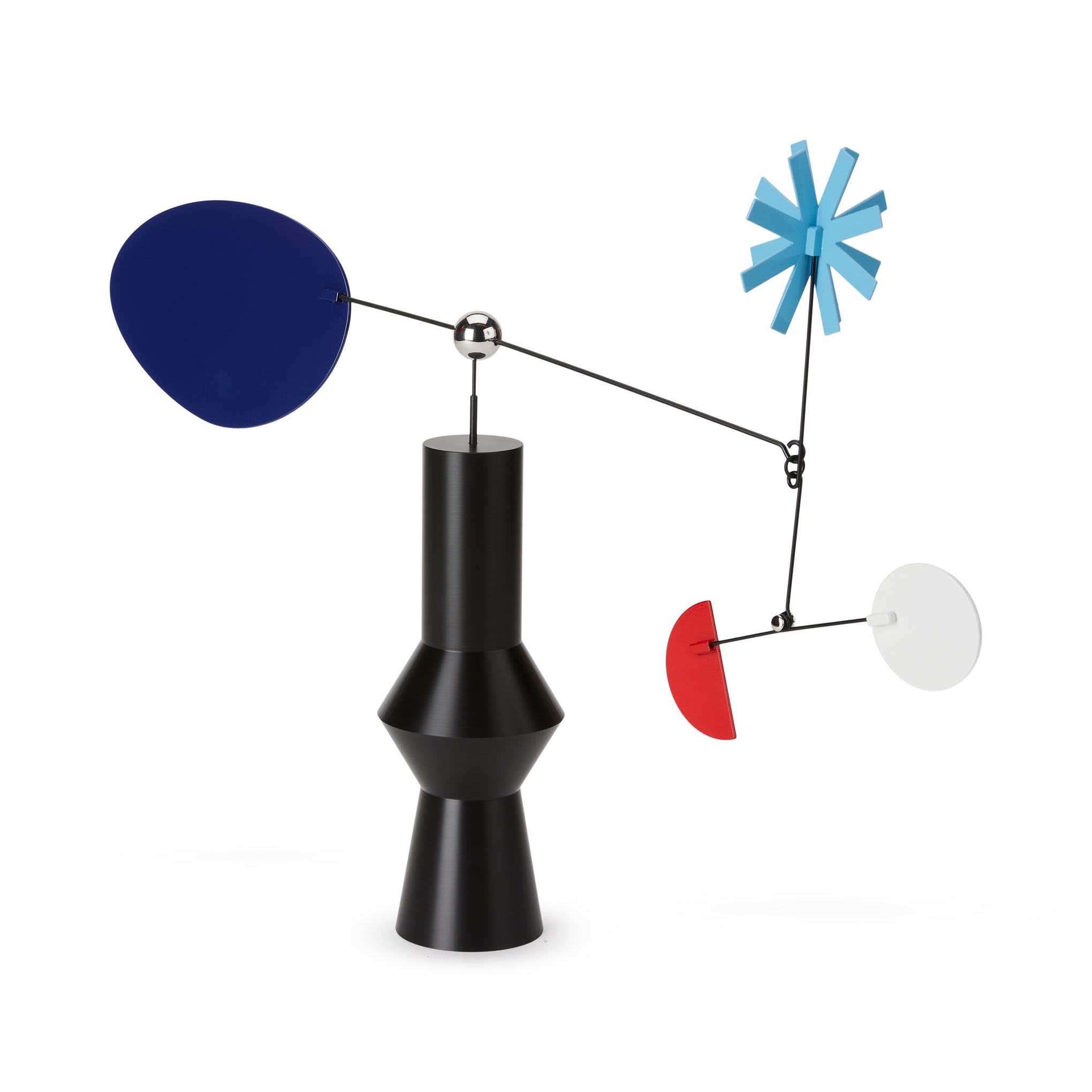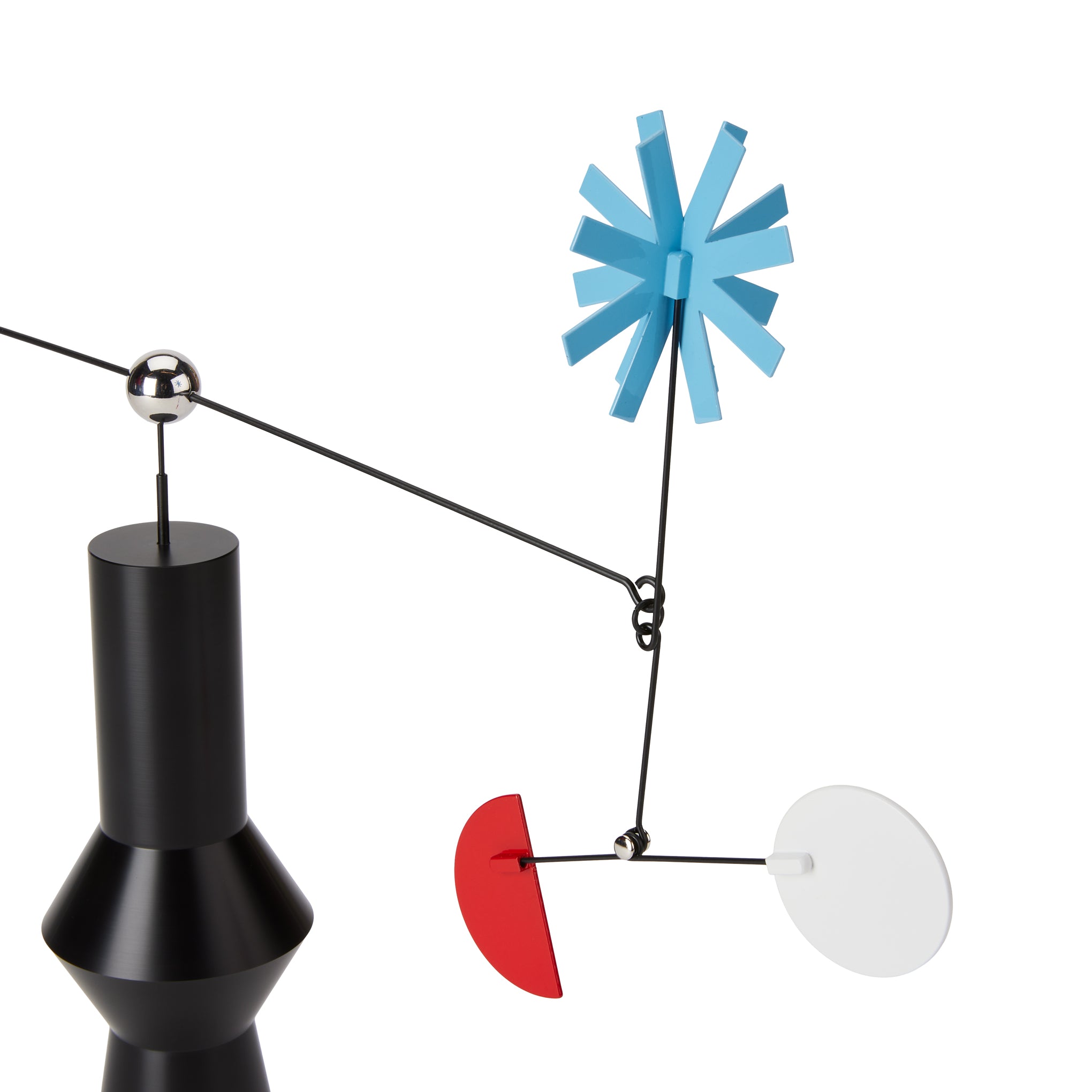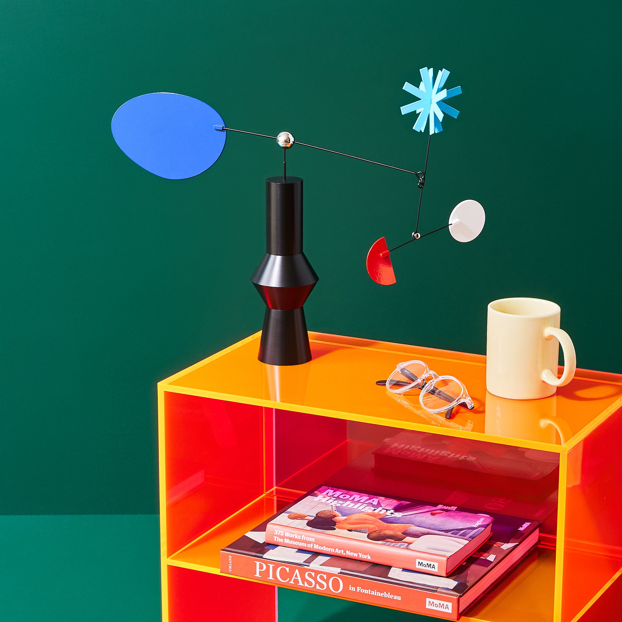 MoMA Exclusive: This mobile is like a little modern art sculpture for your desktop. evoking the shape of a geometric flower vase. It’s handcrafted in Korea from powder-coated steel and acrylic in small batches. The Desktop Mobile Flower is designed and produced by Blue Balcony. a women-led studio based in Seoul. Korea established in 2020 by two craft art designers. Gemma Hwang and Jane Kim. We get our inspiration from the beauty of our everyday lives. our travels. and through film and nature. We also respect and celebrate directionality. rhythm. and infinite color and shapes.  We want our objects to provide beautiful inspiration and mental rest in the space where your gaze and heart are. The Flower Desktop Mobile measures 15h x 17.5w x 3”d.