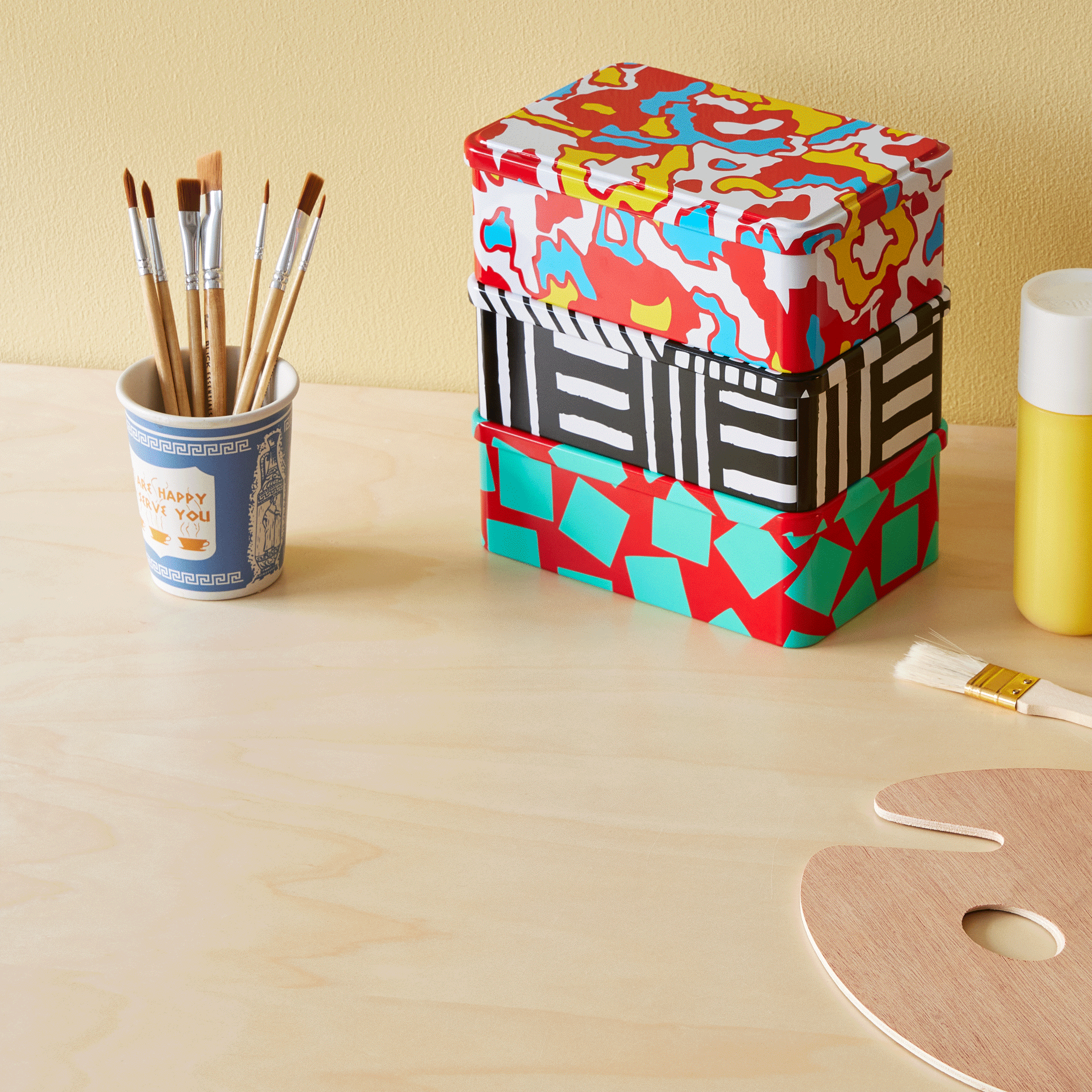 MoMA Exclusive: Adorned with the kind of colorful and energetic patterns that designer George Sowden is known for. this versatile tin has multiple functions. Use it to store dry ingredients. keepsakes. photos. jewelry. art supplies. small toys. candy. shell and rock collections—the possibilities are endless. George Sowden is a founding member of the Memphis Design Group and Memphis designs are represented in MoMA’s collection. The George Sowden Horizontal Tin has a lid. is made from plated tin and measures 3h x 5w x 8d.
