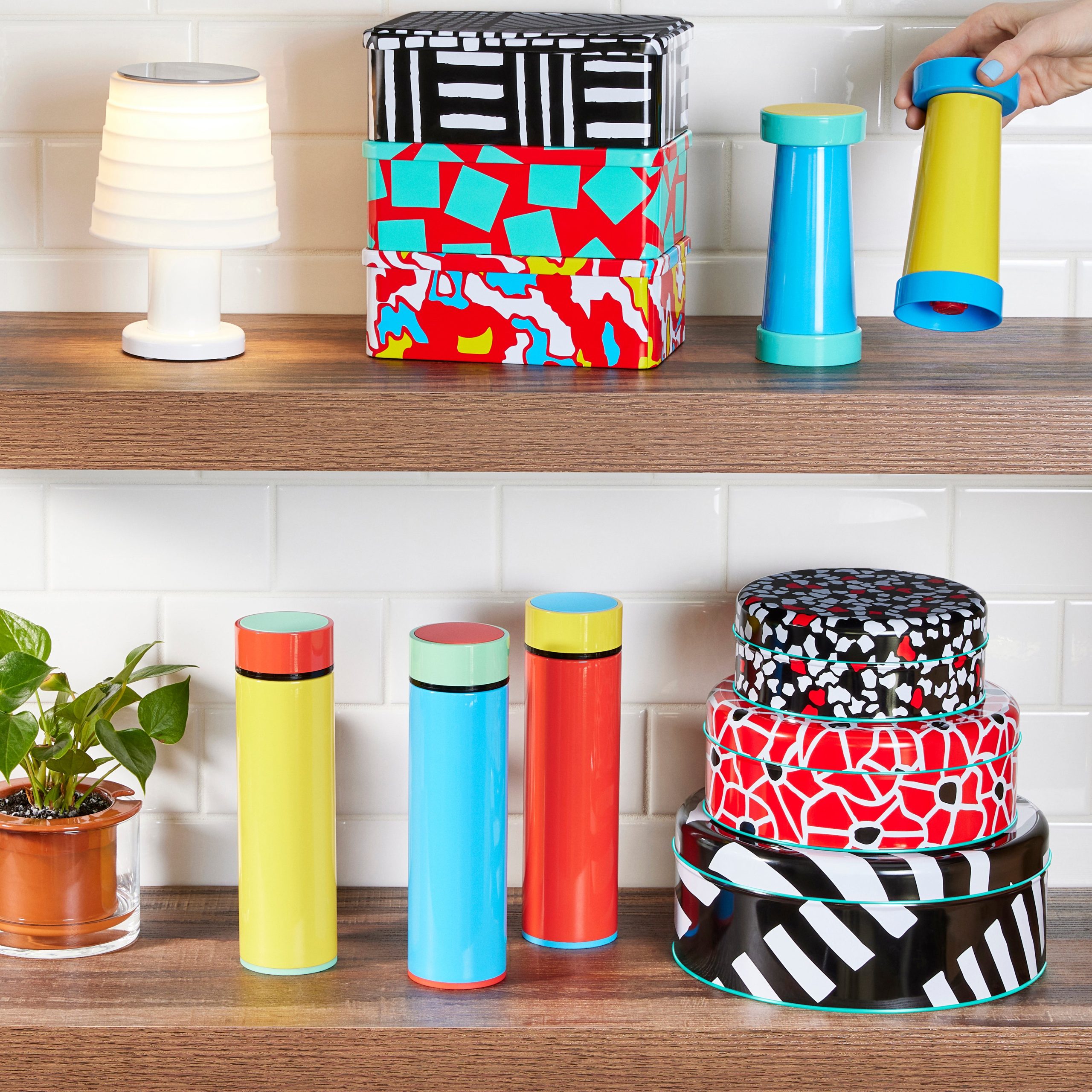 MoMA Exclusive: Adorned with the kind of colorful and energetic patterns that designer George Sowden is known for. this set of three versatile lidded tins has multiple functions. Use it to store dry ingredients. keepsakes. photos. jewelry. art supplies. small toys. candy. shell and rock collections—the possibilities are endless. When empty. the tins can be nested inside each other for easy storage. George Sowden is a founding member of the Memphis Design Group and Memphis designs are represented in MoMA’s collection.