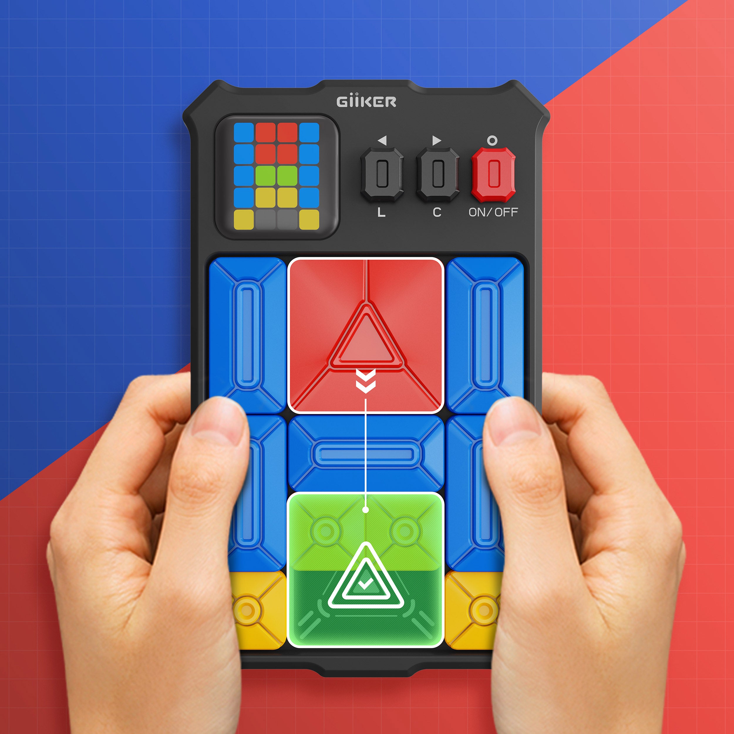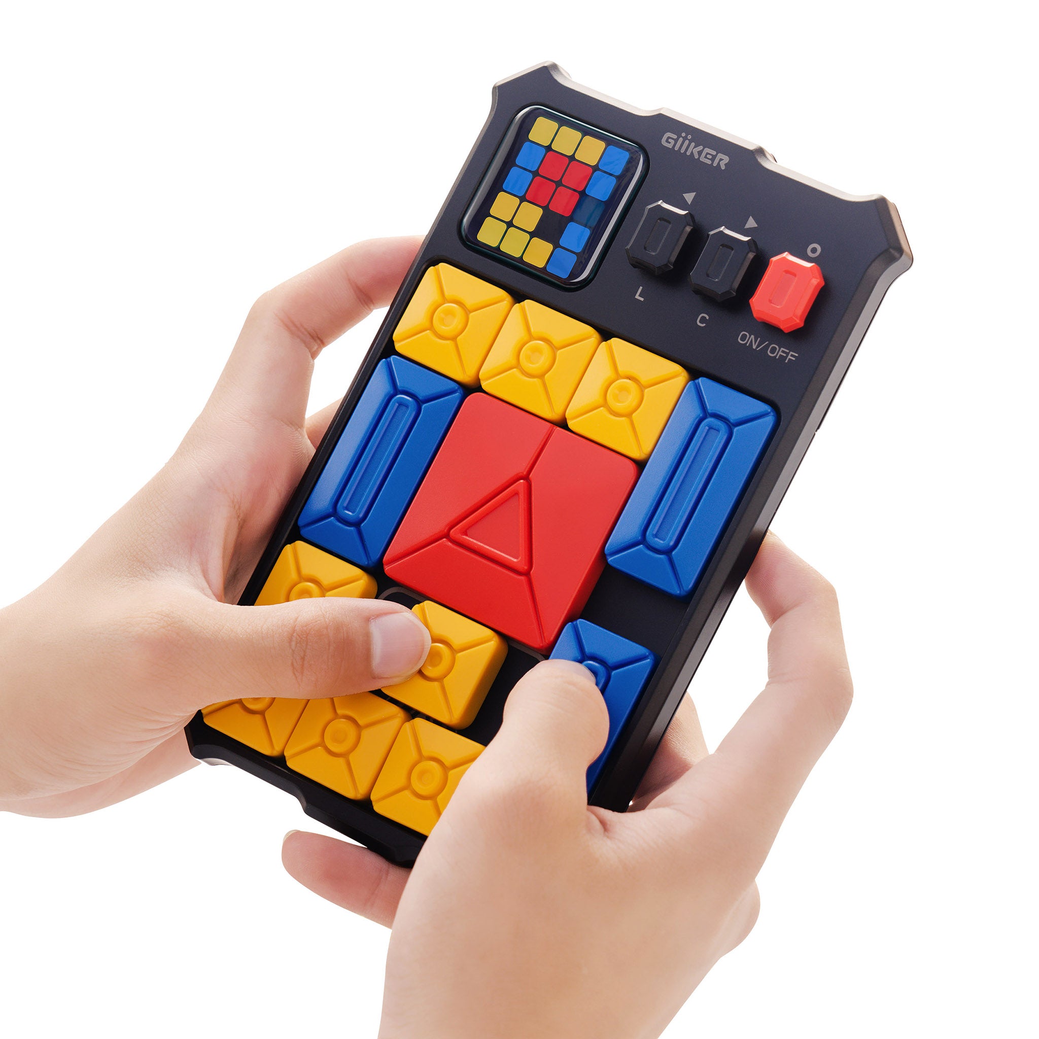This simple. intuitive sliding jigsaw game gives your spatial skills a workout through over 500 puzzles. with the difficulty progressing just a little bit on each one. After you arrange the red. yellow and blue plastic pieces according to the color-coded LED screen in the top left corner. your job is to slide them around until the large red piece can sit in its clearly marked place at the center bottom of the board. Once it’s there. the game automatically detects a win and moves you on to the next puzzle. A great way to limit screen time and develop spatial reasoning skills for adults and kids alike. the Giiker Super Slider game has a Learn Mode that gives you hints for the next step as well as a Challenge Mode that rates your solution time from Fail to Super. Its small. handheld design makes it a great travel-friendly toy. The Giiker Super Slider Game is powered by two AA batteries (not included) and measures 6.7h x 4.35w x 0.9d. Ages 6+.